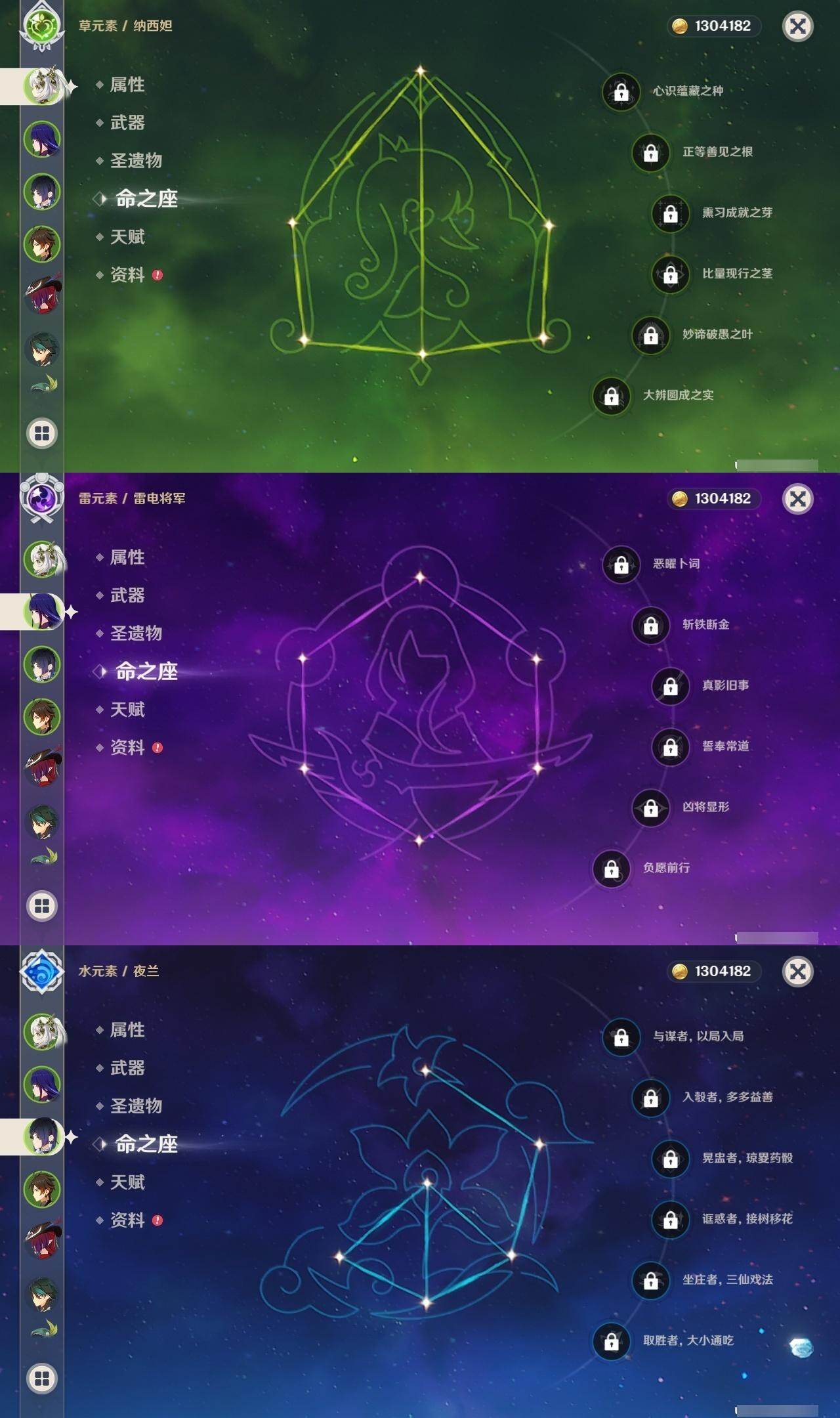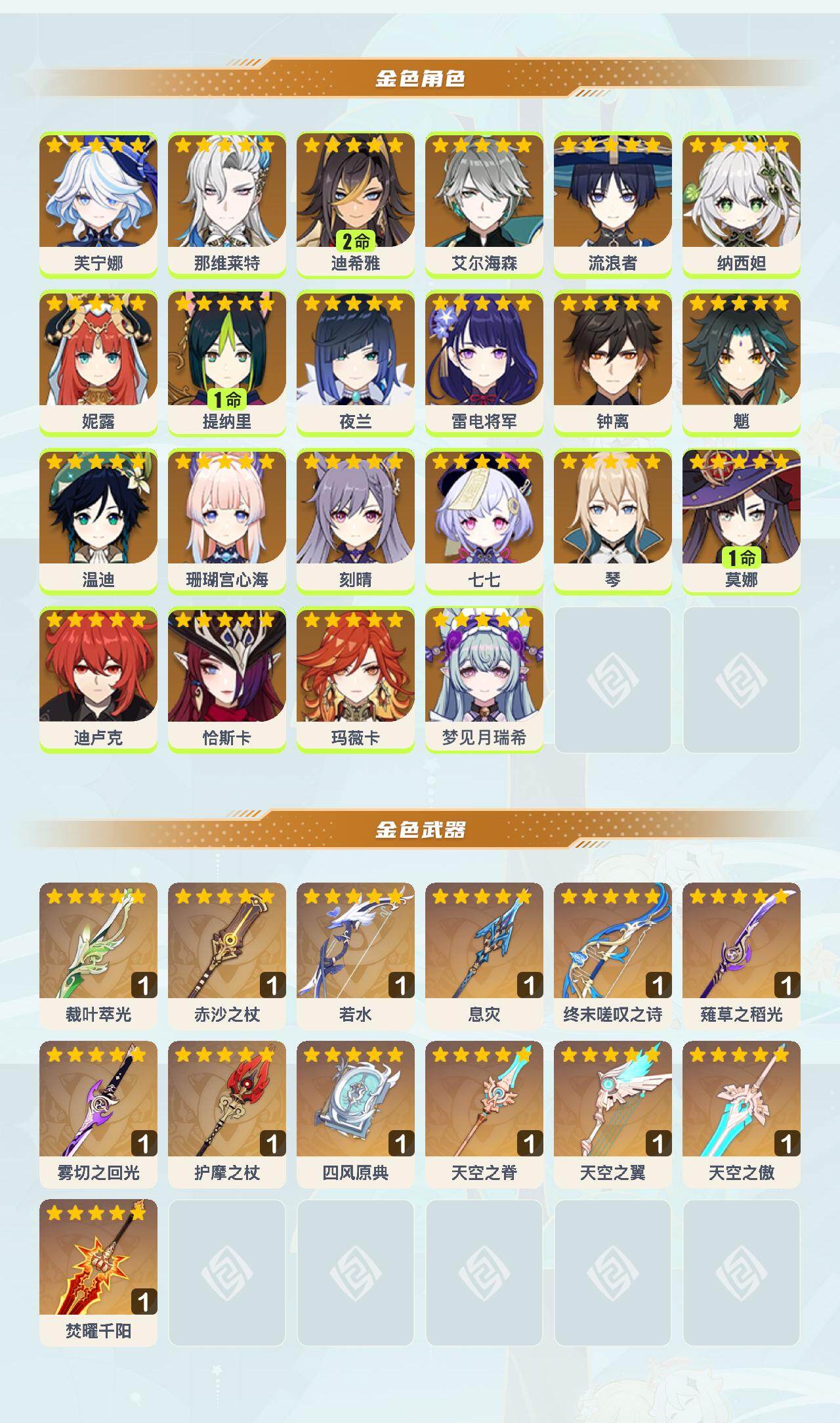 0命芙宁娜,0命那维莱特,2命迪希雅,0命艾尔海森,0命流浪者,0命纳西妲,0命妮露,1命提纳里,0命夜兰,0命雷电将军,0命钟离,0命魈,0命温迪,0命珊瑚宫心海,0命刻晴,0命七七,0命琴,1命莫娜,0命迪卢克,0命恰斯卡,0命玛薇卡,0命梦见月瑞希,精1裁叶萃光,精1赤沙之杖,精1若水,精1息灾,精1终末嗟叹之诗,精1薙草之稻光,精1雾切之回光,精1护摩之杖,精1四风原典,精1天空之脊,精1天空之翼,精1天空之傲,精1焚曜千阳