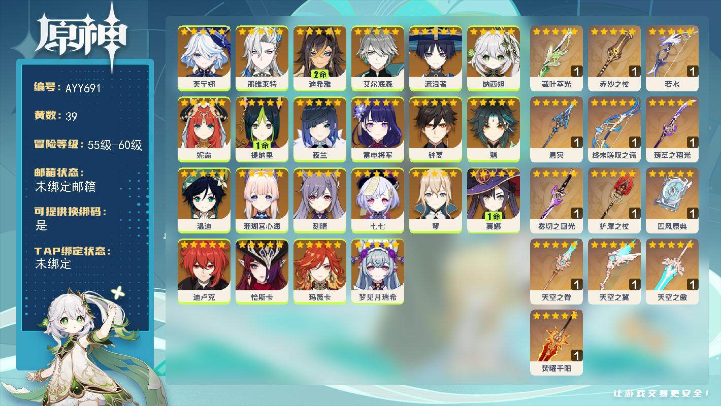 [17551762]59级/39黄/男主/22个五星角色/13个五星武器 0命芙宁娜,0命那维莱特,2命迪希雅,0命艾尔海森,0命流浪者,0命纳西妲,0命妮露,1命提纳里,0命夜兰,0命雷电将军,0命钟离,0命魈,0命温迪,0命珊瑚宫心海,0命刻晴,0命七七,0命琴,1命莫娜,0命迪卢克,0命恰斯卡,0命玛薇卡,0命梦见月瑞希,精1裁叶萃光,精1赤沙之杖,精1若水,精1息灾,精1终末嗟叹之诗,精1薙草之稻光,精1雾切之回光,精1护摩之杖,精1四风原典,精1天空之脊,精1天空之翼,精1天空之傲,精1焚曜千阳