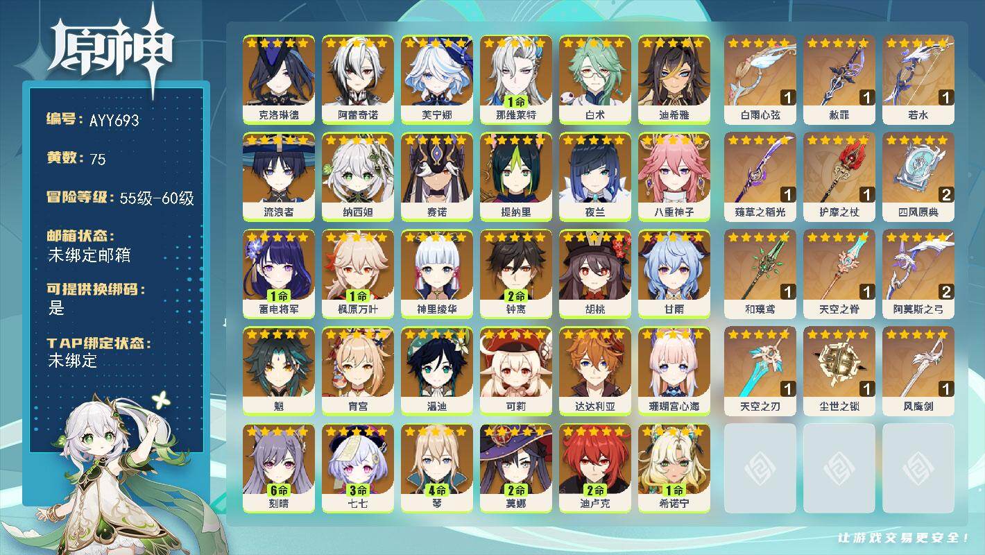 [17551771]60级/75黄/女主/35个五星角色/15个五星武器 0命克洛琳德,0命阿蕾奇诺,0命芙宁娜,1命那维莱特,0命白术,0命迪希雅,0命流浪者,0命纳西妲,0命赛诺,0命提纳里,0命夜兰,0命八重神子,1命雷电将军,1命枫原万叶,0命神里绫华,2命钟离,0命胡桃,0命甘雨,0命魈,0命宵宫,0命温迪,0命可莉,0命达达利亚,0命珊瑚宫心海,满命刻晴,3命七七,4命琴,2命莫娜,2命迪卢克,1命希诺宁,0命玛拉妮,0命玛薇卡,0命梦见月瑞希,0命丝柯克,0命菲林斯,精1白雨心弦,精1赦罪,精1若水,精1薙草之稻光,精1护摩之杖,精2四风原典,精1和璞鸢,精1天空之脊,精2阿莫斯之弓,精1天空之刃,精1尘世之锁,精1风鹰剑