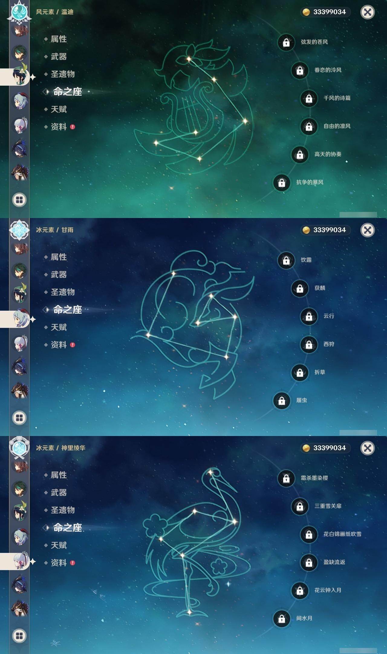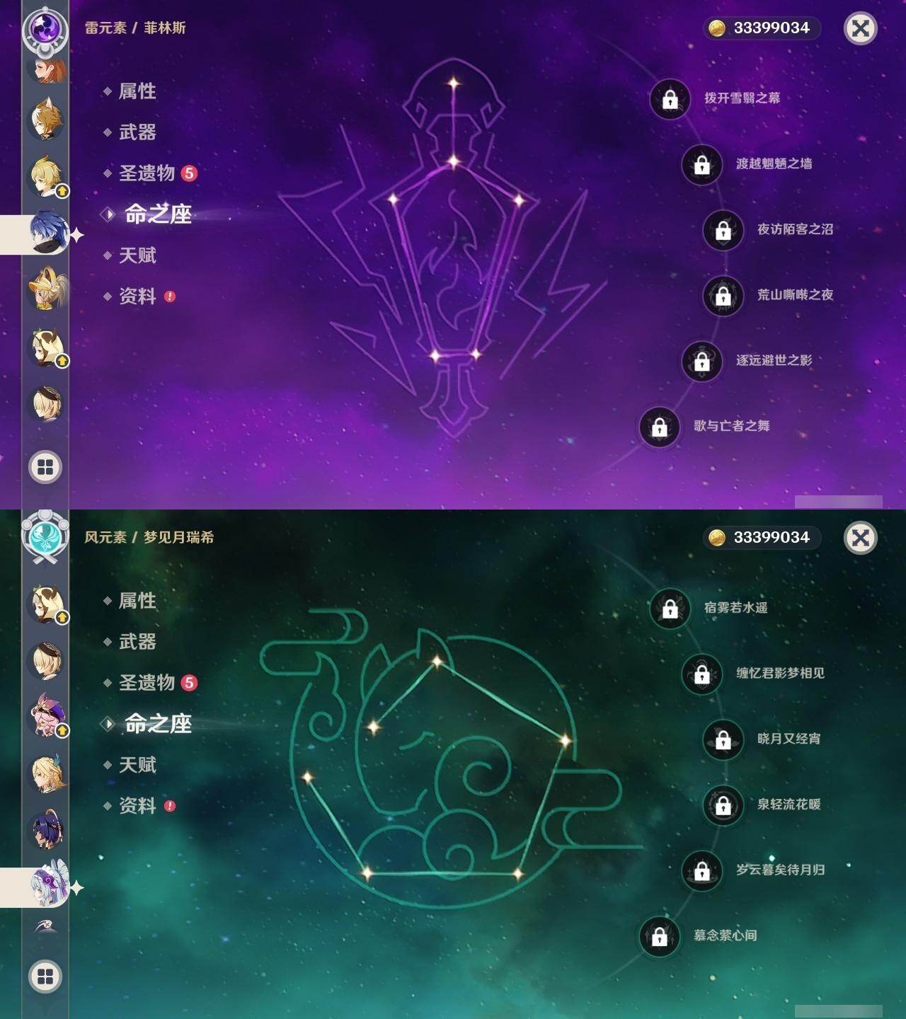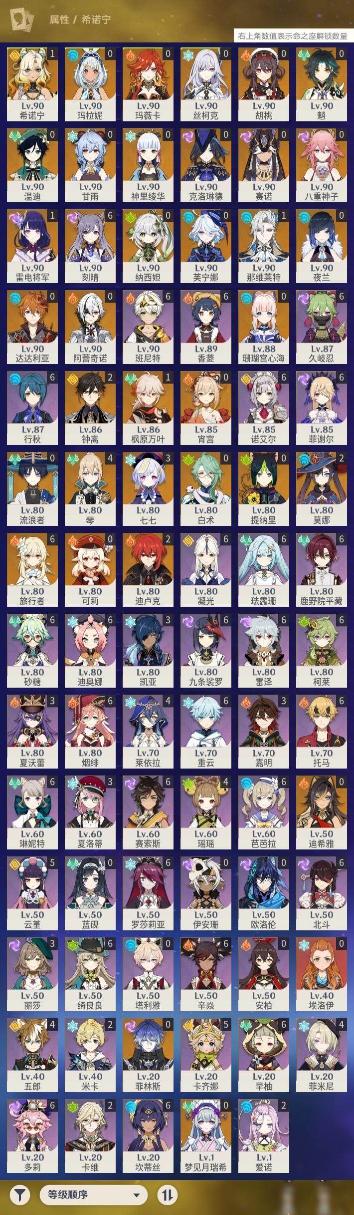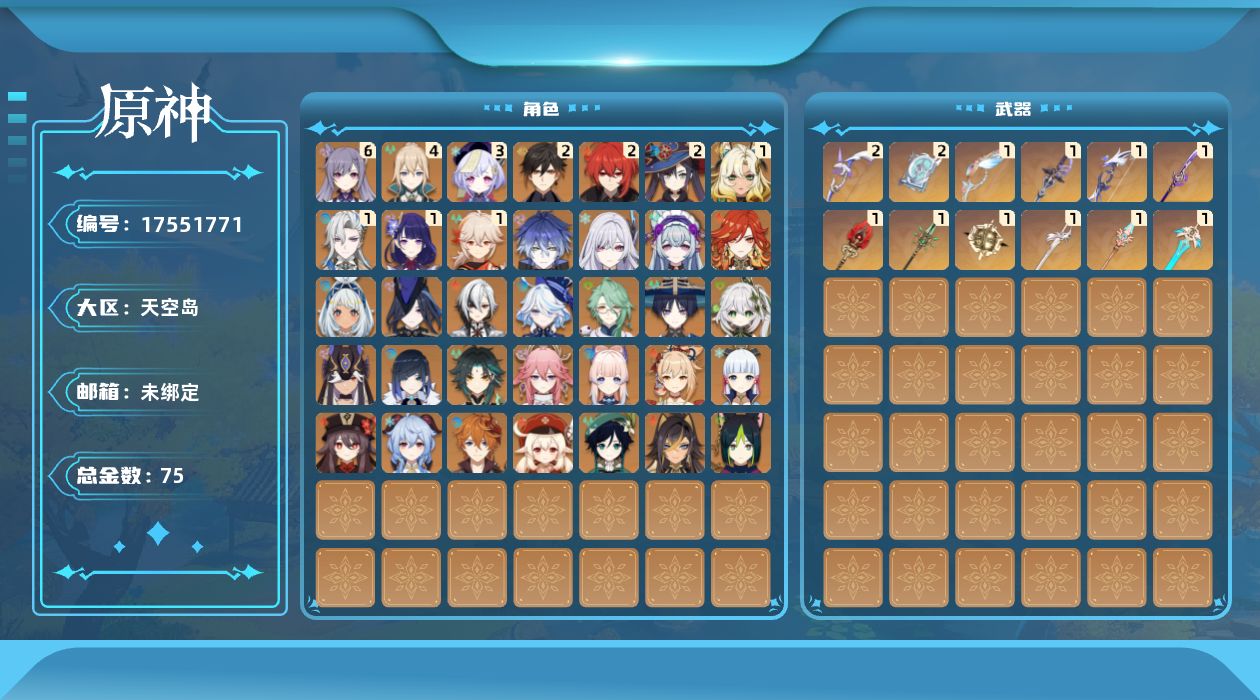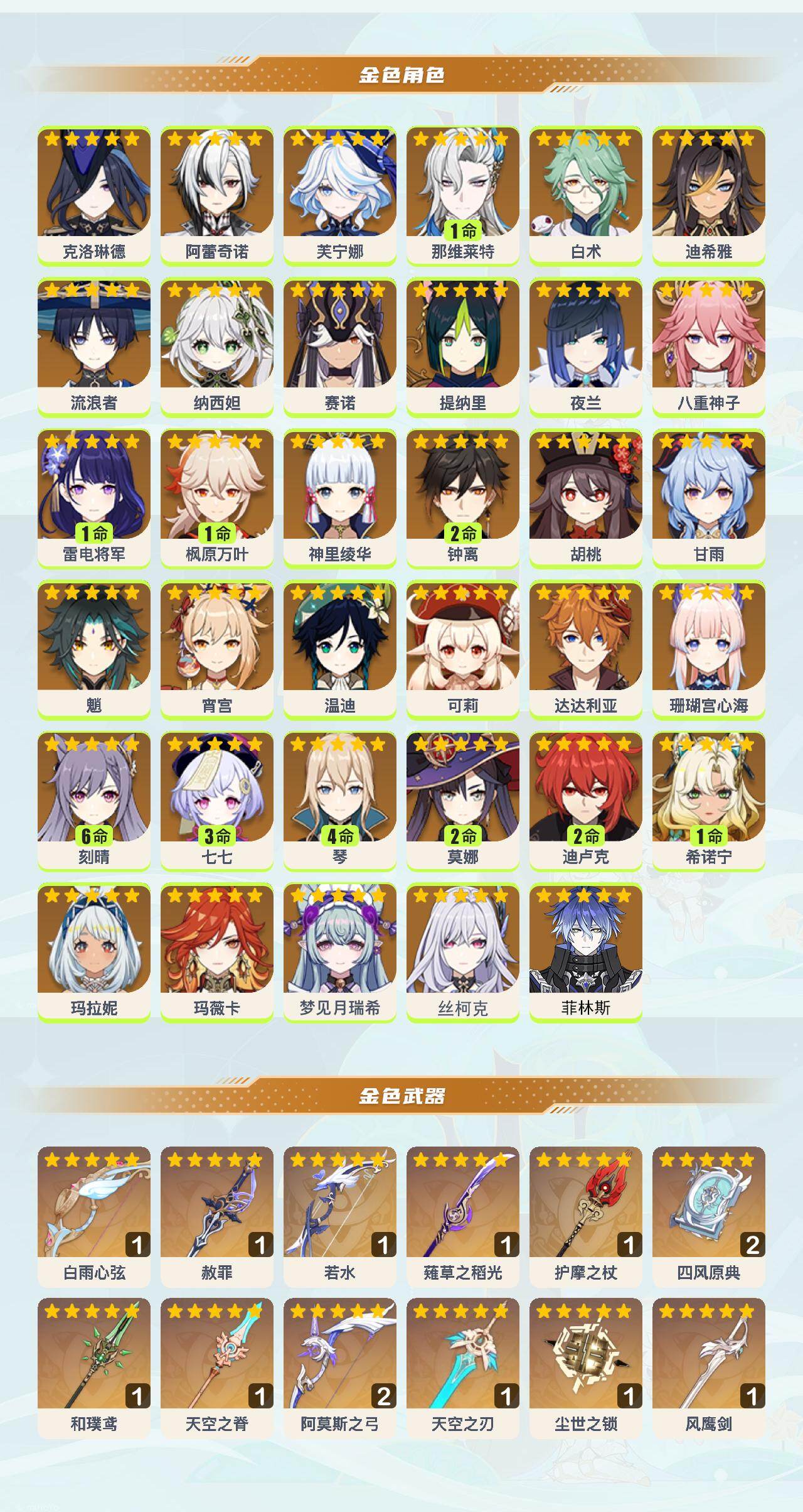 0命克洛琳德,0命阿蕾奇诺,0命芙宁娜,1命那维莱特,0命白术,0命迪希雅,0命流浪者,0命纳西妲,0命赛诺,0命提纳里,0命夜兰,0命八重神子,1命雷电将军,1命枫原万叶,0命神里绫华,2命钟离,0命胡桃,0命甘雨,0命魈,0命宵宫,0命温迪,0命可莉,0命达达利亚,0命珊瑚宫心海,满命刻晴,3命七七,4命琴,2命莫娜,2命迪卢克,1命希诺宁,0命玛拉妮,0命玛薇卡,0命梦见月瑞希,0命丝柯克,0命菲林斯,精1白雨心弦,精1赦罪,精1若水,精1薙草之稻光,精1护摩之杖,精2四风原典,精1和璞鸢,精1天空之脊,精2阿莫斯之弓,精1天空之刃,精1尘世之锁,精1风鹰剑