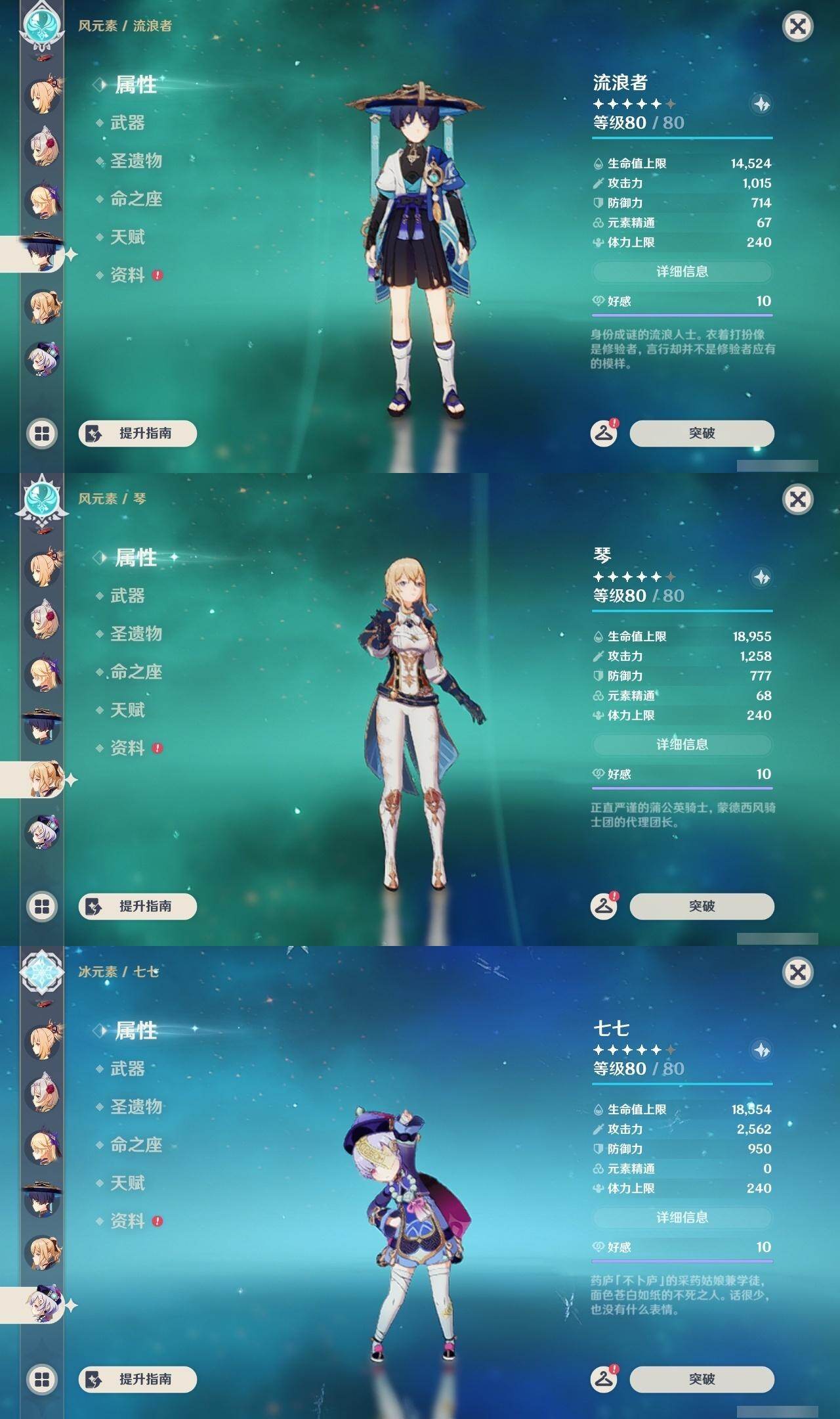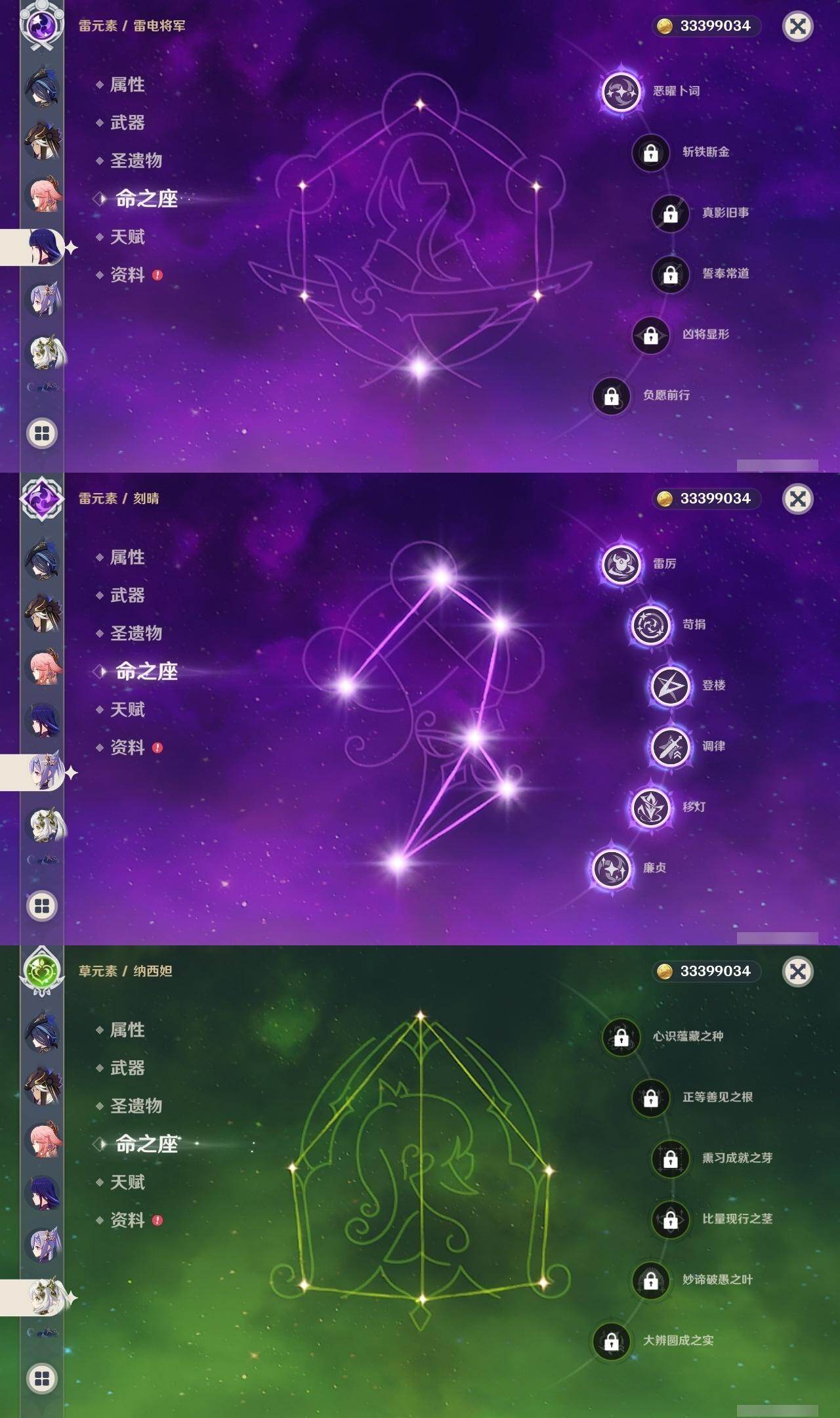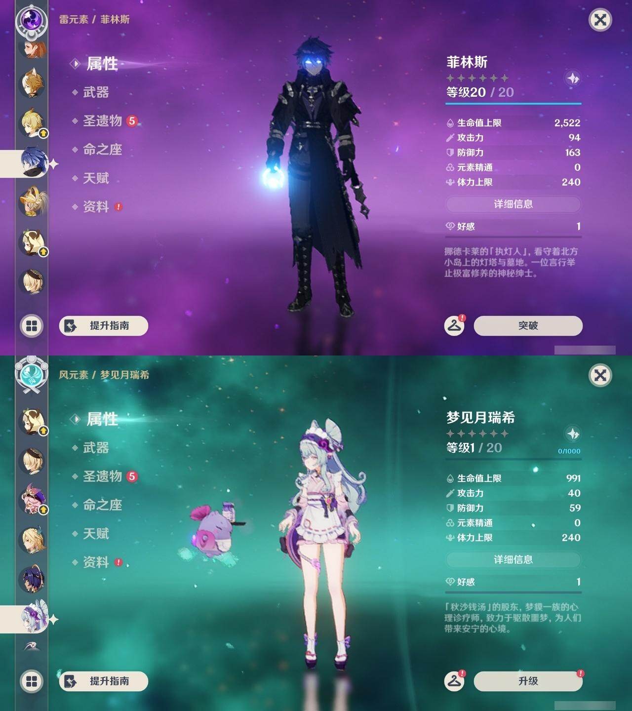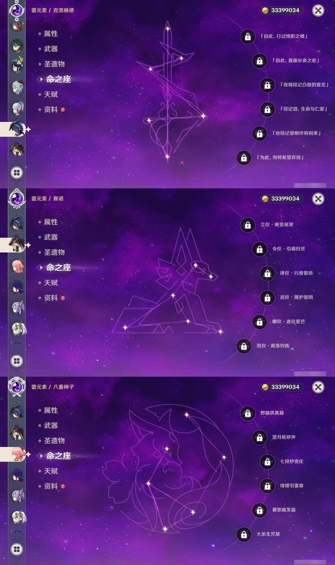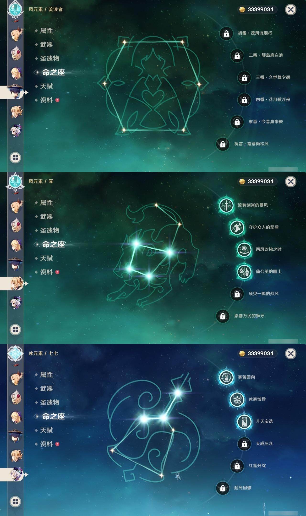 0命克洛琳德,0命阿蕾奇诺,0命芙宁娜,1命那维莱特,0命白术,0命迪希雅,0命流浪者,0命纳西妲,0命赛诺,0命提纳里,0命夜兰,0命八重神子,1命雷电将军,1命枫原万叶,0命神里绫华,2命钟离,0命胡桃,0命甘雨,0命魈,0命宵宫,0命温迪,0命可莉,0命达达利亚,0命珊瑚宫心海,满命刻晴,3命七七,4命琴,2命莫娜,2命迪卢克,1命希诺宁,0命玛拉妮,0命玛薇卡,0命梦见月瑞希,0命丝柯克,0命菲林斯,精1白雨心弦,精1赦罪,精1若水,精1薙草之稻光,精1护摩之杖,精2四风原典,精1和璞鸢,精1天空之脊,精2阿莫斯之弓,精1天空之刃,精1尘世之锁,精1风鹰剑