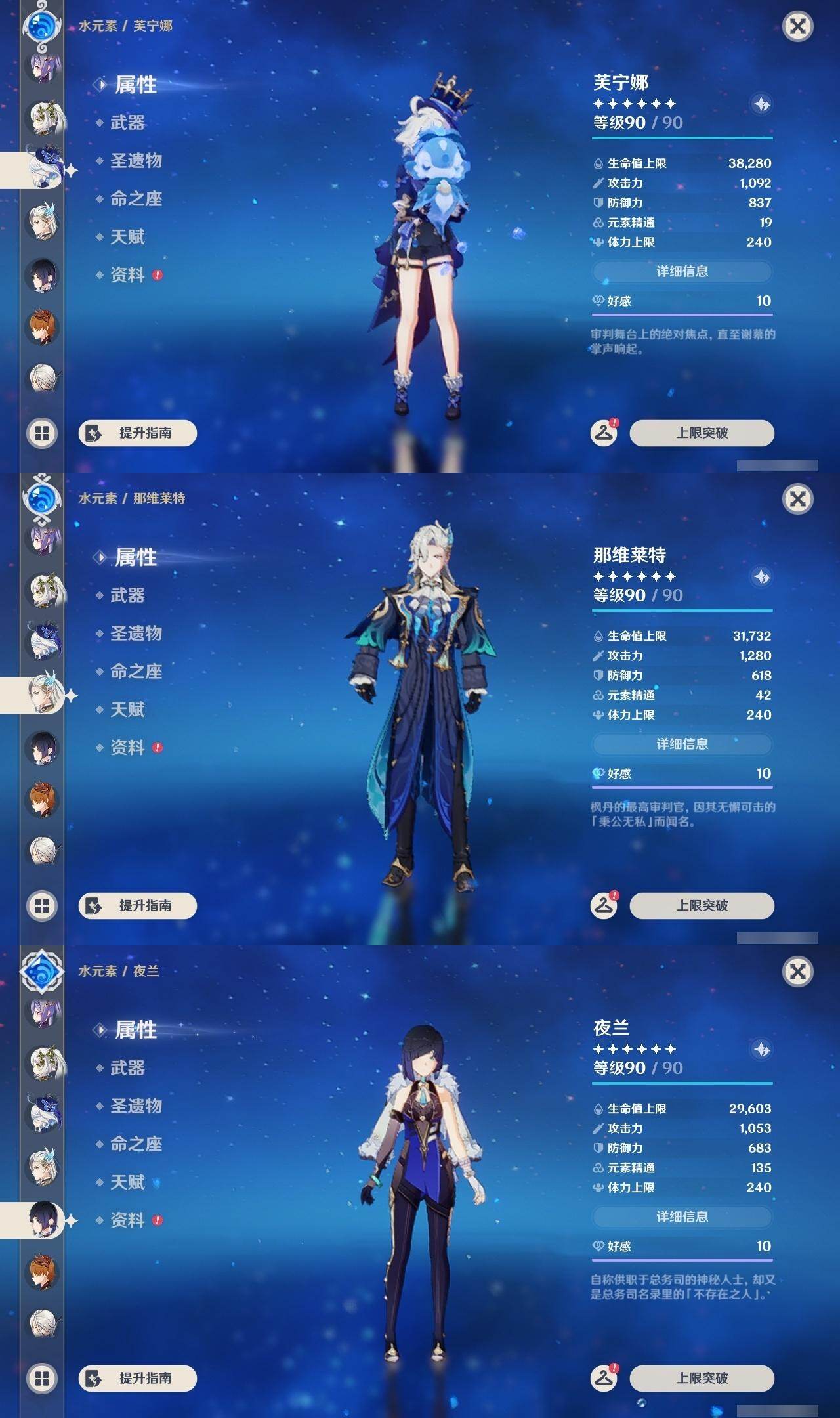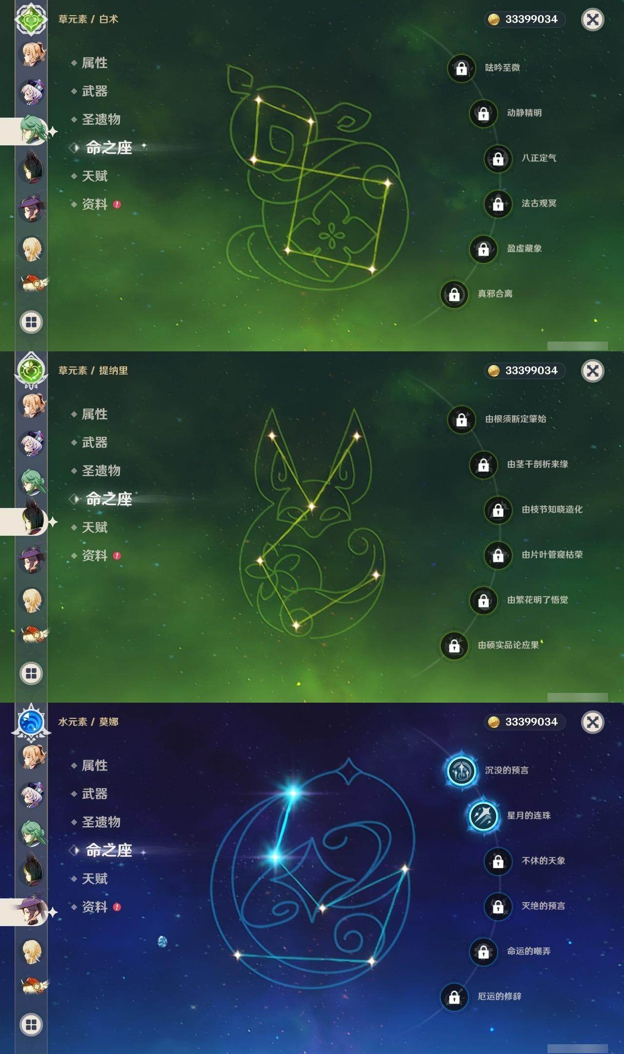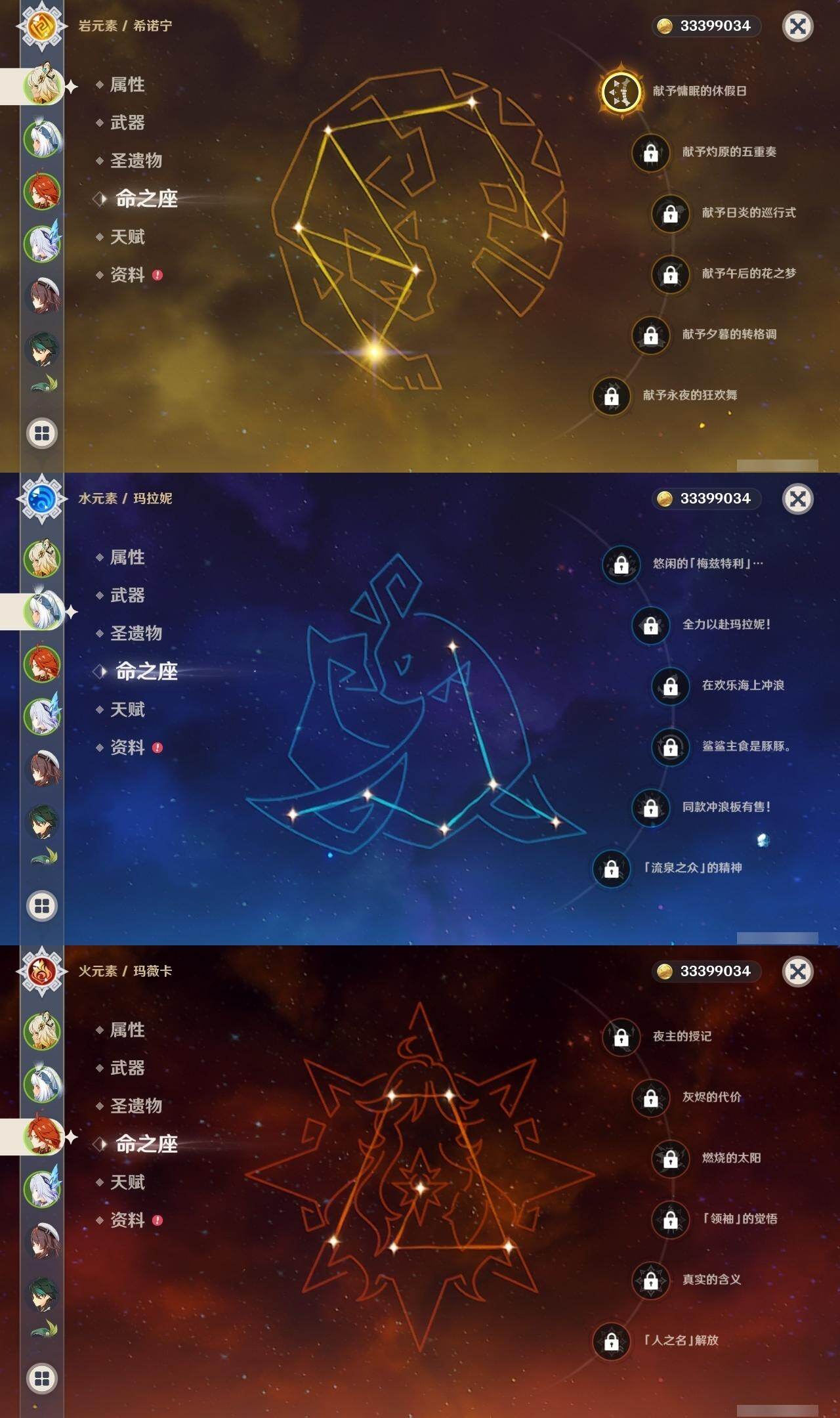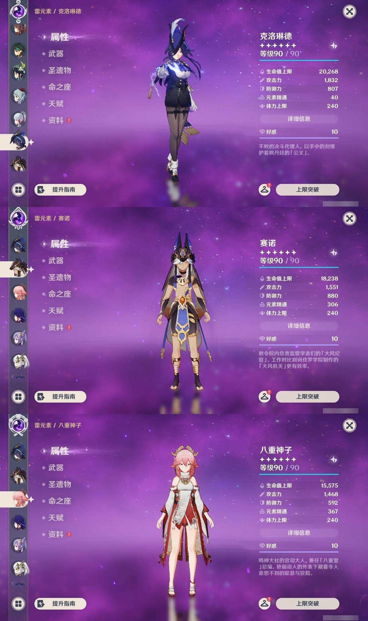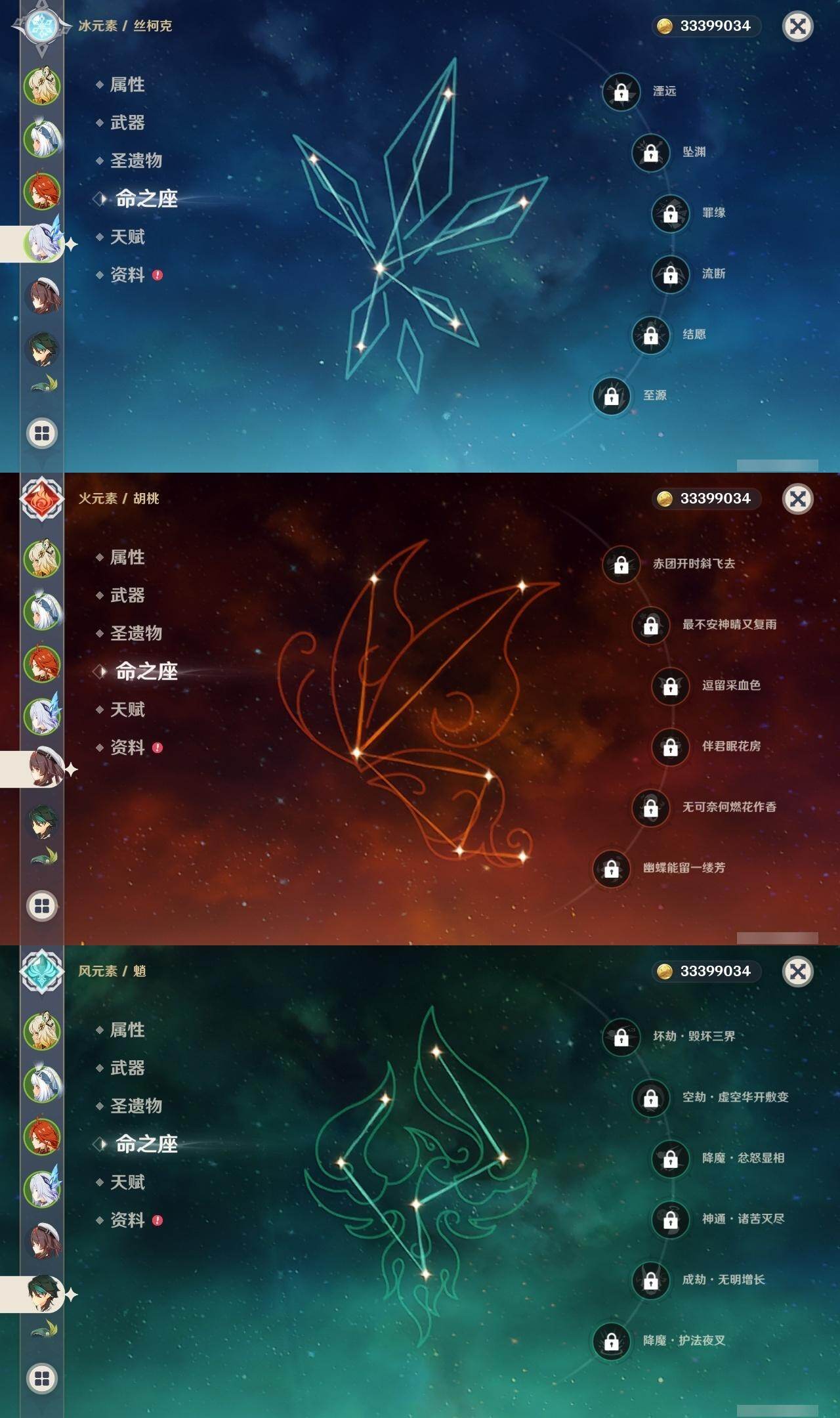 0命克洛琳德,0命阿蕾奇诺,0命芙宁娜,1命那维莱特,0命白术,0命迪希雅,0命流浪者,0命纳西妲,0命赛诺,0命提纳里,0命夜兰,0命八重神子,1命雷电将军,1命枫原万叶,0命神里绫华,2命钟离,0命胡桃,0命甘雨,0命魈,0命宵宫,0命温迪,0命可莉,0命达达利亚,0命珊瑚宫心海,满命刻晴,3命七七,4命琴,2命莫娜,2命迪卢克,1命希诺宁,0命玛拉妮,0命玛薇卡,0命梦见月瑞希,0命丝柯克,0命菲林斯,精1白雨心弦,精1赦罪,精1若水,精1薙草之稻光,精1护摩之杖,精2四风原典,精1和璞鸢,精1天空之脊,精2阿莫斯之弓,精1天空之刃,精1尘世之锁,精1风鹰剑