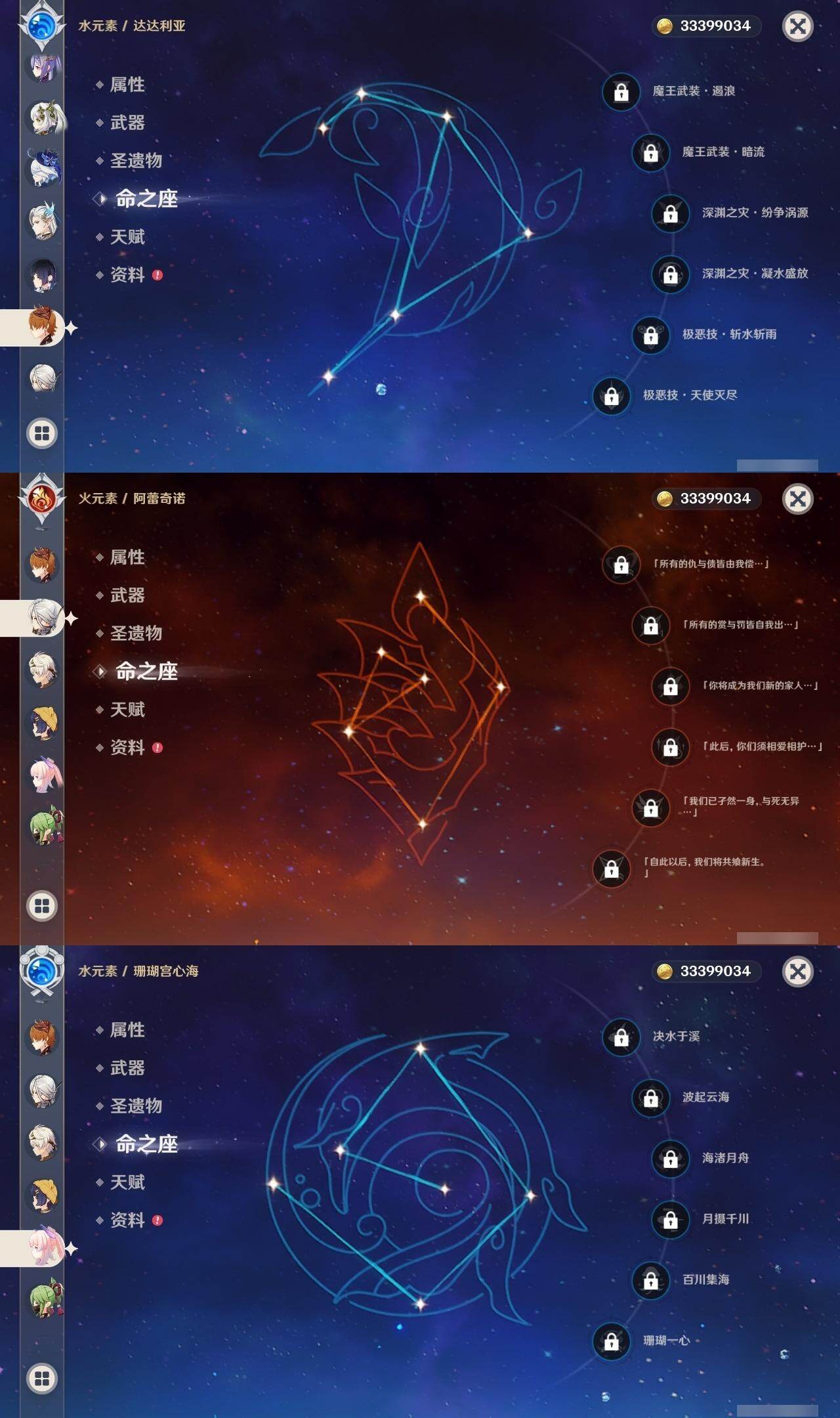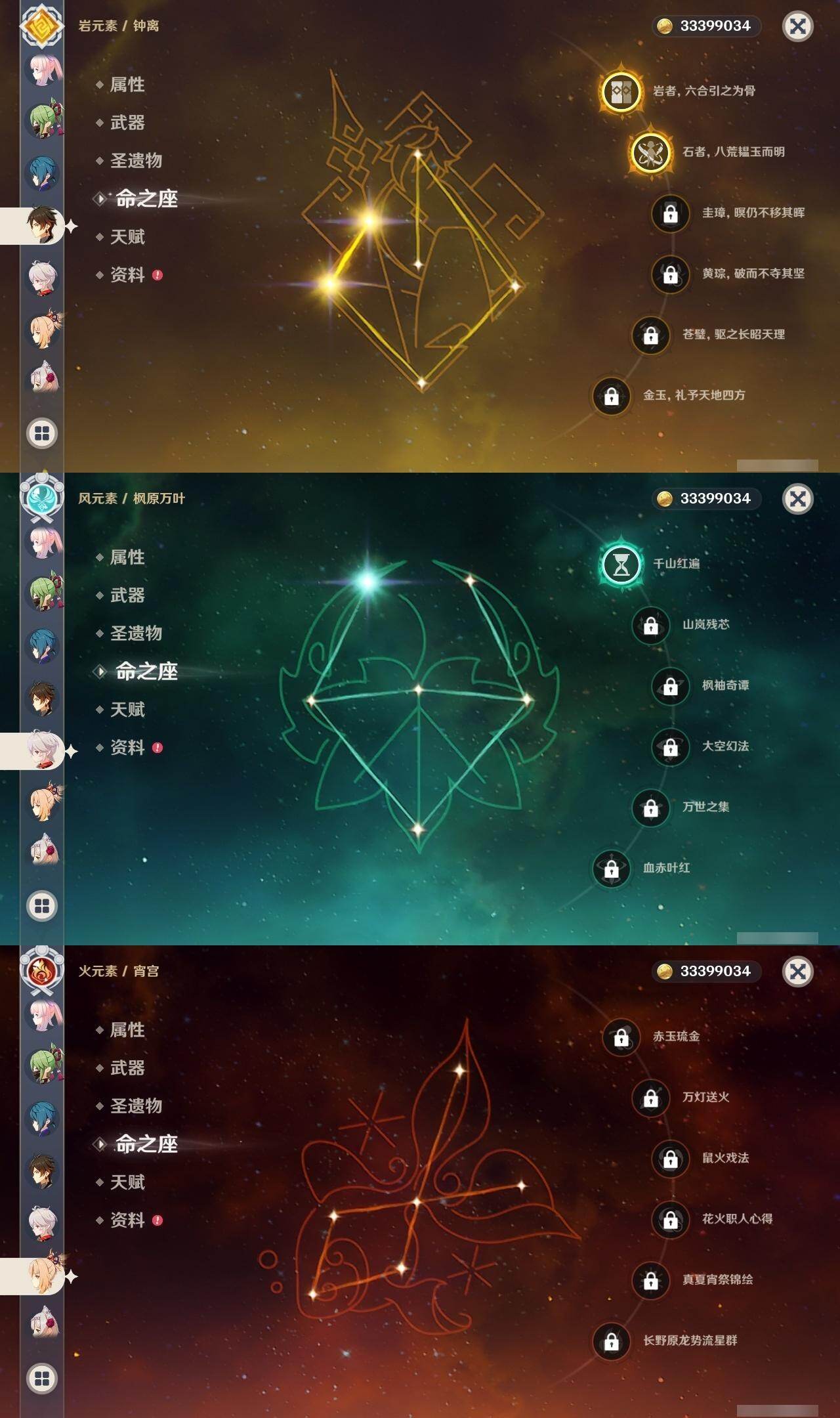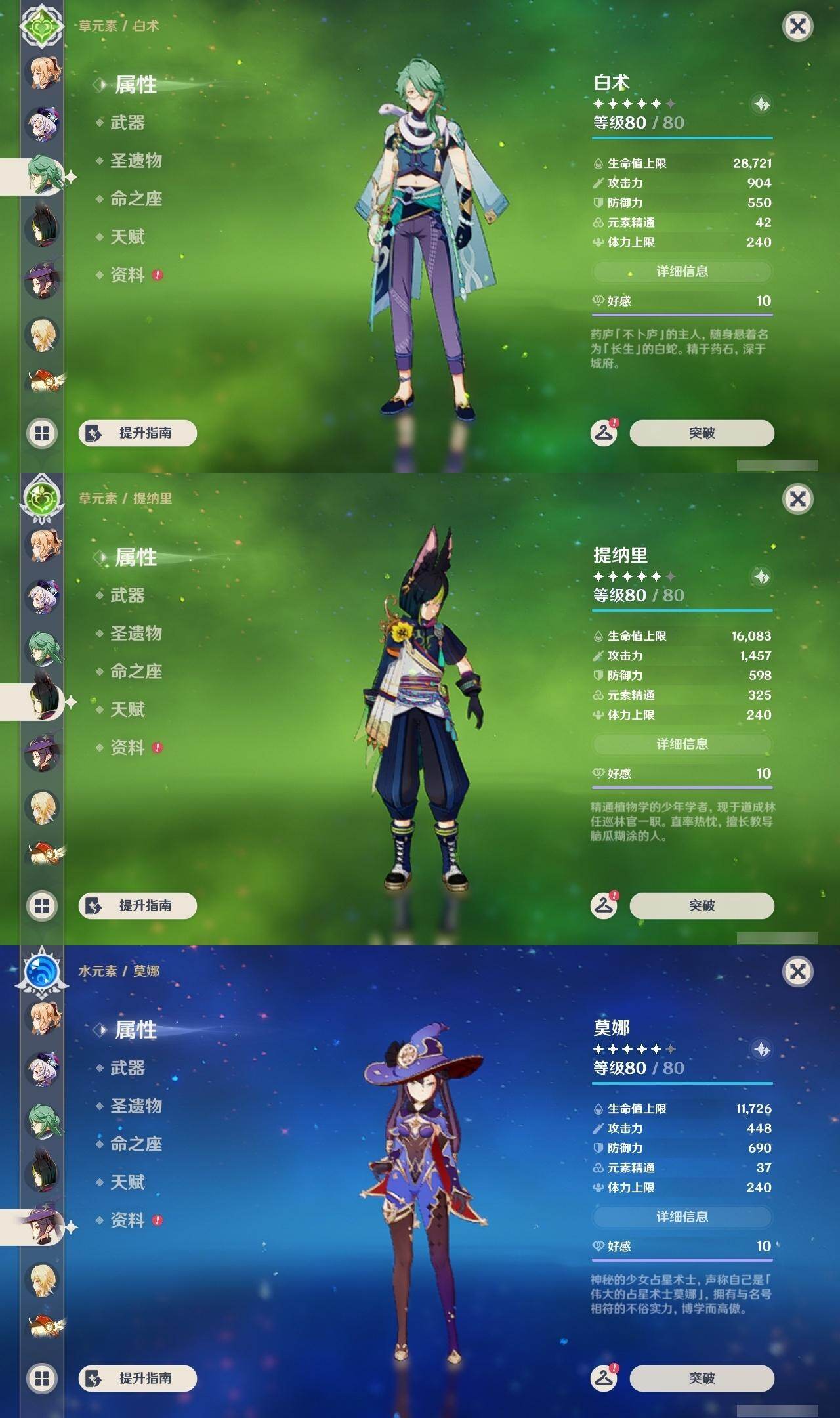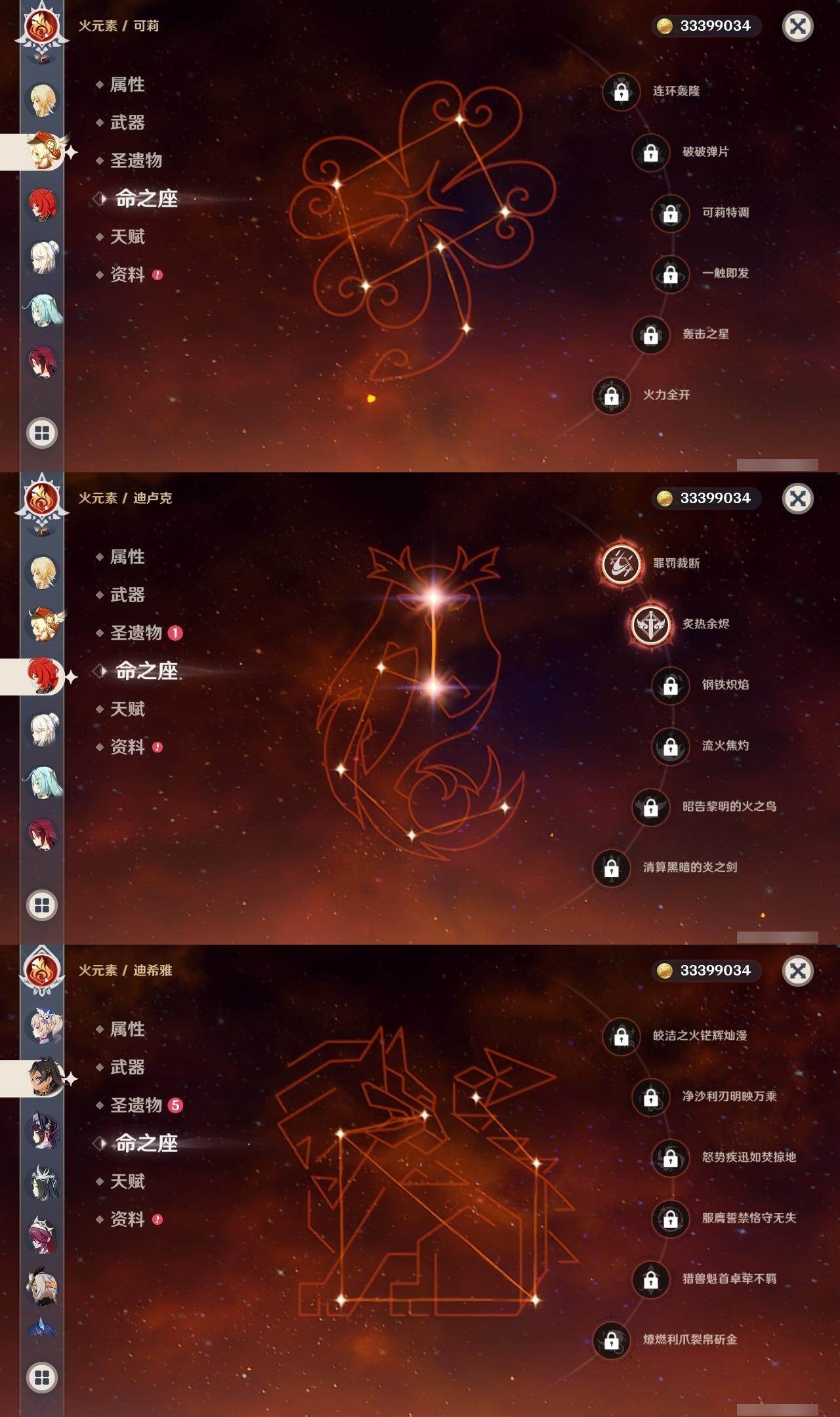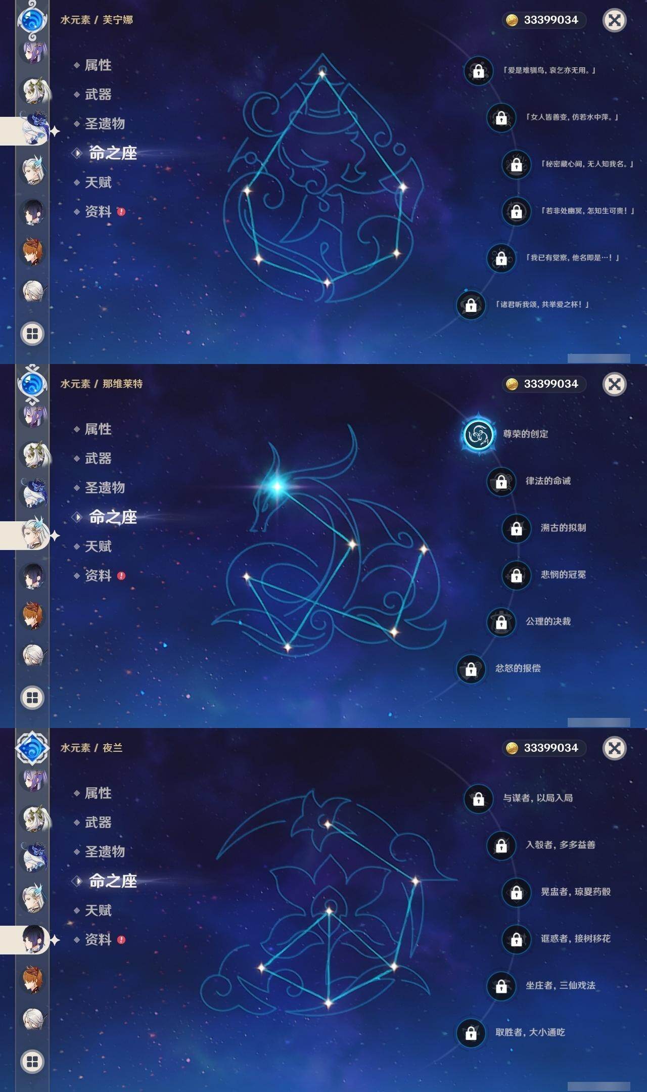0命克洛琳德,0命阿蕾奇诺,0命芙宁娜,1命那维莱特,0命白术,0命迪希雅,0命流浪者,0命纳西妲,0命赛诺,0命提纳里,0命夜兰,0命八重神子,1命雷电将军,1命枫原万叶,0命神里绫华,2命钟离,0命胡桃,0命甘雨,0命魈,0命宵宫,0命温迪,0命可莉,0命达达利亚,0命珊瑚宫心海,满命刻晴,3命七七,4命琴,2命莫娜,2命迪卢克,1命希诺宁,0命玛拉妮,0命玛薇卡,0命梦见月瑞希,0命丝柯克,0命菲林斯,精1白雨心弦,精1赦罪,精1若水,精1薙草之稻光,精1护摩之杖,精2四风原典,精1和璞鸢,精1天空之脊,精2阿莫斯之弓,精1天空之刃,精1尘世之锁,精1风鹰剑