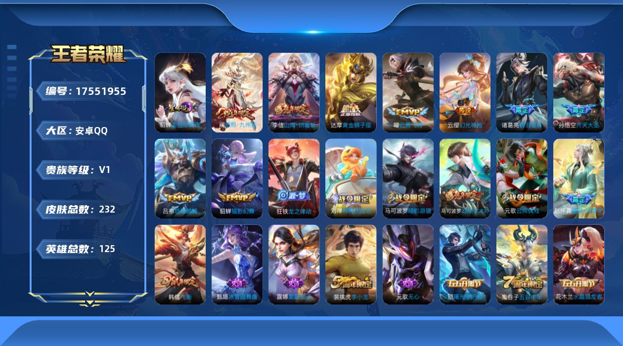 [17551955]【店主推荐捡漏号!可直接换绑】安卓Q-V7-最强王者段位-124英雄-232皮肤-9传说-66史诗-1星元 【传说皮肤】:澜愿照九州拓,云缨幻光神枪,诸葛亮鹤羽星尊,孙悟空齐天大圣,李信山海炽霜斩,吕布怒海麟威,曜云鹰飞将,貂蝉猫影幻舞,达摩黄金狮子座 【限定皮肤】:姜子牙天穹之誓,杨戬破阵退雄兵,狄仁杰阴阳师,赵云皇家上将,孙尚香蔷薇恋人,阿轲迷踪丽影,钟无艳超时空战士,扁鹊奇幻香踪,元歌云间偶戏,元歌无心,甄姬落雪兰心,马可波罗暗影游猎,马可波罗山海玄木吟,狄仁杰魔术师,狄仁杰万华元夜,项羽海滩派对,老夫子醍醐杖,程咬金演武夺筹,刘邦夺宝奇兵,韩信飞衡,亚瑟潮玩骑士王,孙悟空齐天大圣,李元芳云中旅人,钟馗驱傩正仪,杨戬潮玩骑兵,蔡文姬繁星吟游,鬼谷子原初探秘者,鬼谷子五谷丰年,诸葛亮鹤羽星尊,百里玄策原初追逐者,弈星混沌棋,梦奇顽趣,沈梦溪大漠名商,沈梦溪匿光破解者,明世隐疑决卦,裴擒虎李小龙,裴擒虎擒涛扼浪,云中君纤云弄巧,李信山海炽霜斩,猪八戒西部大镖客,嫦娥拒霜思,嫦娥暖冬兔眠,桑启海盐诗旅,暃星界游侠,张良古海寻踪,蒙犽百解令,蒙恬荣光圣徽,高渐离燃音魔法,妲己灵卜魔法,鬼谷子天穹祈灯,沈梦溪龙舞盛年,鲁班七号蔬乡物语,李元芳蔬乡物语,刘邦剑破天穹,镜青焰无极,项羽苍威无极,周瑜熔金海岸 【年限皮肤】:韩信飞衡,马可波罗山海玄木吟,李信山海炽霜斩 【赛季限定】:狄仁杰万华元夜,老夫子醍醐杖,程咬金演武夺筹,张良古海寻踪,李元芳云中旅人,钟馗驱傩正仪,鬼谷子原初探秘者,百里玄策原初追逐者,弈星混沌棋,梦奇顽趣,沈梦溪大漠名商,明世隐疑决卦,裴擒虎擒涛扼浪,桑启海盐诗旅,鬼谷子天穹祈灯,蒙恬荣光圣徽,刘邦剑破天穹,姜子牙天穹之誓 【战令限定】:阿轲迷踪丽影,钟无艳超时空战士,扁鹊奇幻香踪,元歌云间偶戏,甄姬落雪兰心,马可波罗暗影游猎,刘邦夺宝奇兵,亚瑟潮玩骑士王,杨戬潮玩骑兵,猪八戒西部大镖客,嫦娥暖冬兔眠,暃星界游侠,高渐离燃音魔法,妲己灵卜魔法,鲁班七号蔬乡物语,李元芳蔬乡物语,镜青焰无极,项羽苍威无极 【史诗皮肤】:项羽苍穹之光,露娜紫霞仙子,赵云皇家上将,赵云未来纪元,貂蝉圣诞恋歌,甄姬冰雪圆舞曲,王昭君偶像歌手,狄仁杰魔术师,宫本武藏鬼剑武藏,孙尚香蔷薇恋人,孙尚香水果甜心,嬴政暗夜贵公子,嬴政摇滚巨星,妲己魅力维加斯,墨子龙骑士,墨子金属风暴,