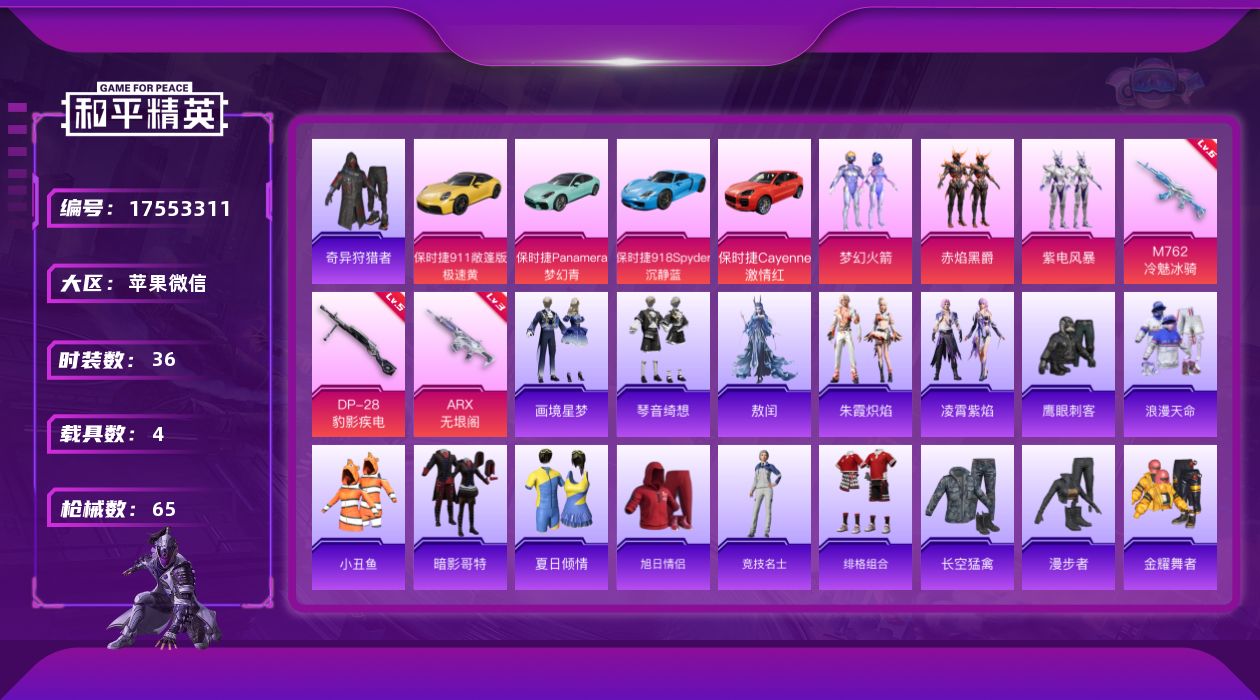 [17553311]【店主推荐捡漏号!可直接换绑】 苹果 微信-3粉装-3特效枪-4载具-1粉色飞行器-21704热力值-3王牌印记-36套装-65枪皮