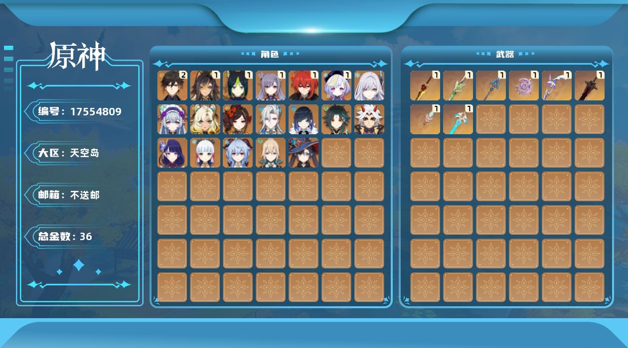 - [17601440]60级/74黄/男主/30个五星角色/19个五星武器 0命闲云,0命芙宁娜,2命迪希雅,0命流浪者,0命纳西妲,0命妮露,0命提纳里,0命夜兰,0命神里绫人,0命八重神子,0命荒泷一斗,2命雷电将军,1命枫原万叶,1命神里绫华,0命钟离,0命胡桃,0命甘雨,满命魈,1命温迪,1命达达利亚,0命阿贝多,0命珊瑚宫心海,1命刻晴,0命七七,1命琴,满命莫娜,1命迪卢克,0命玛拉妮,0命梦见月瑞希,0命哥伦比娅,精1裁叶萃光,精1千夜浮梦,精1圣显之钥,精1神乐之真意,精1赤角石溃杵,精1终末嗟叹之诗,精1冬极白星,精1薙草之稻光,精1雾切之回光,精1和璞鸢,精1天空之脊,精1天空之翼,精2阿莫斯之弓,精1天空之卷,精1狼的末路,精2天空之傲,精1冲浪时光,精1支离轮光,精1真语秘匣