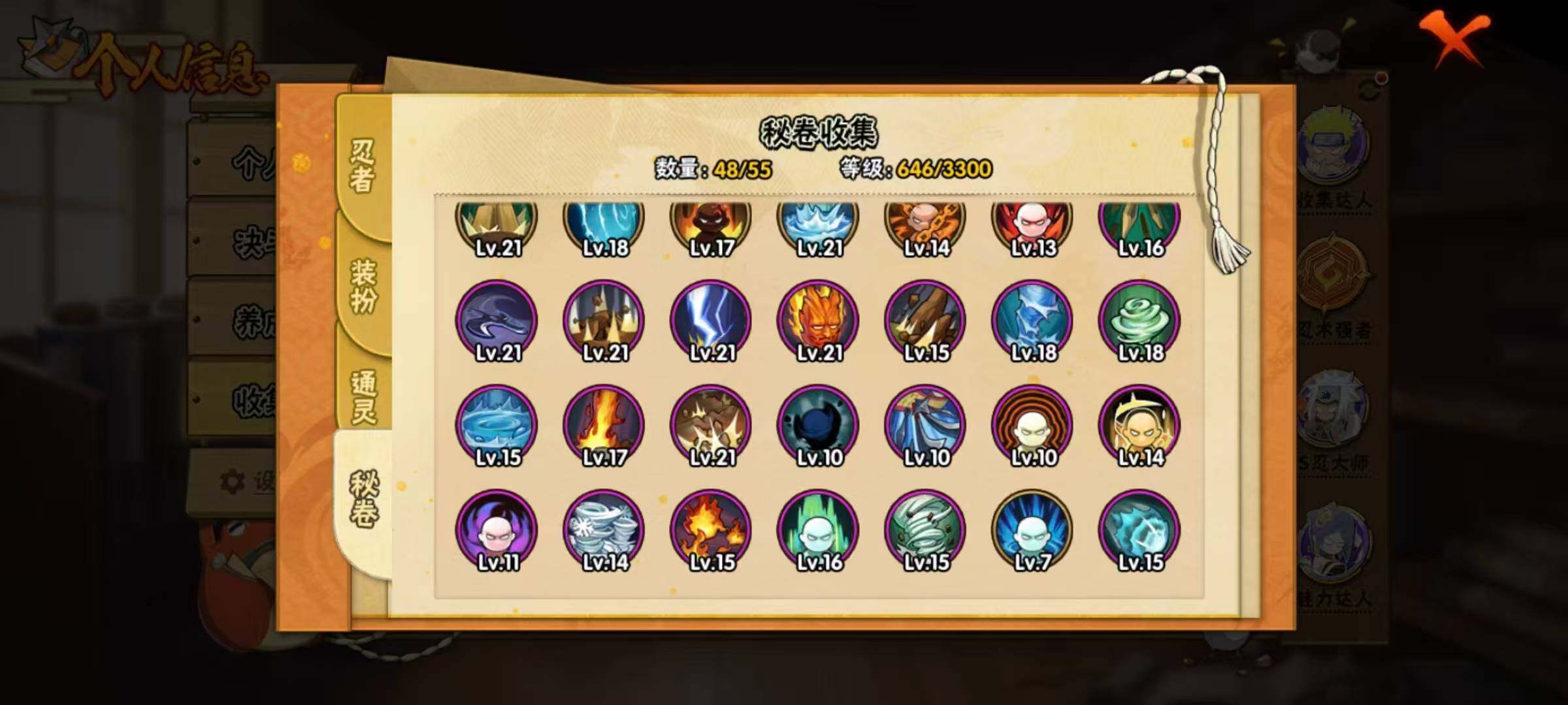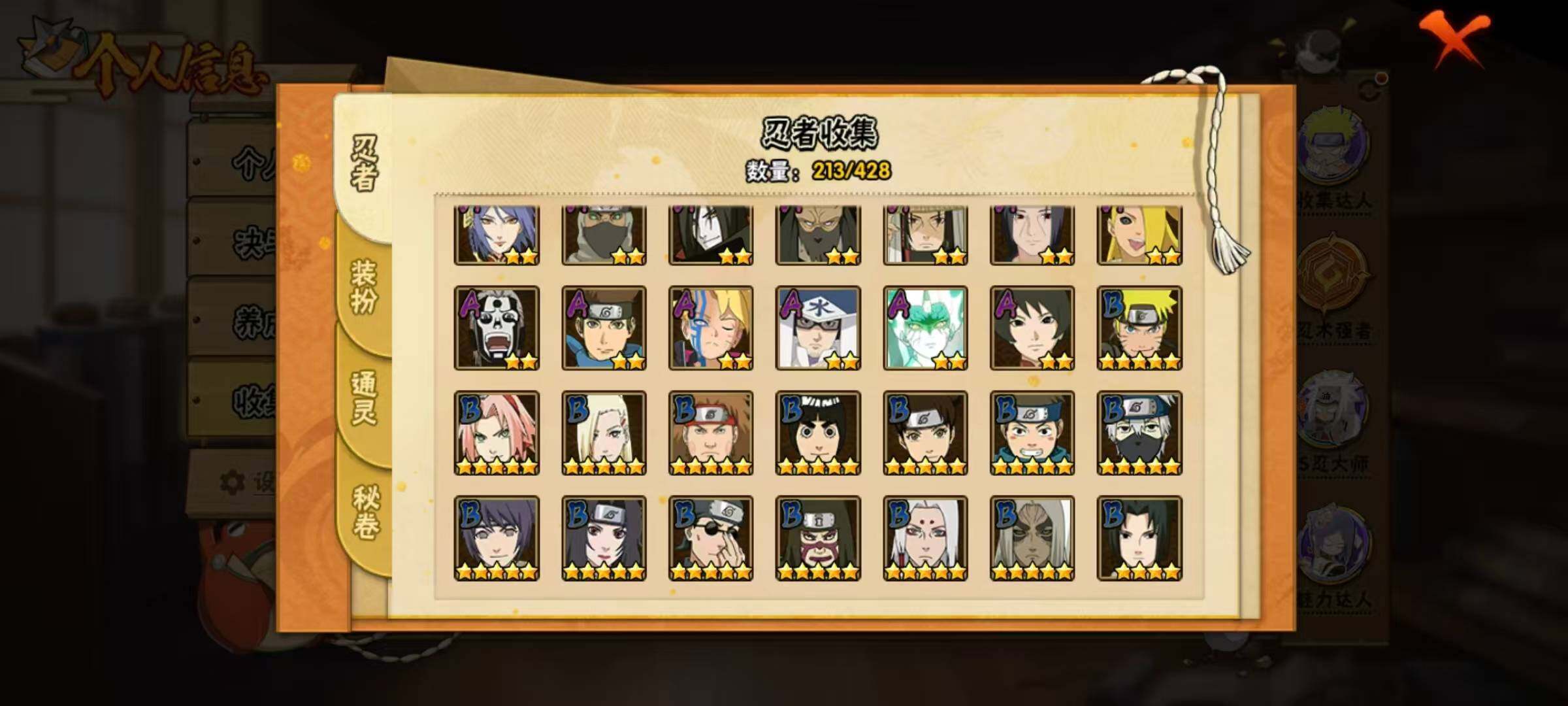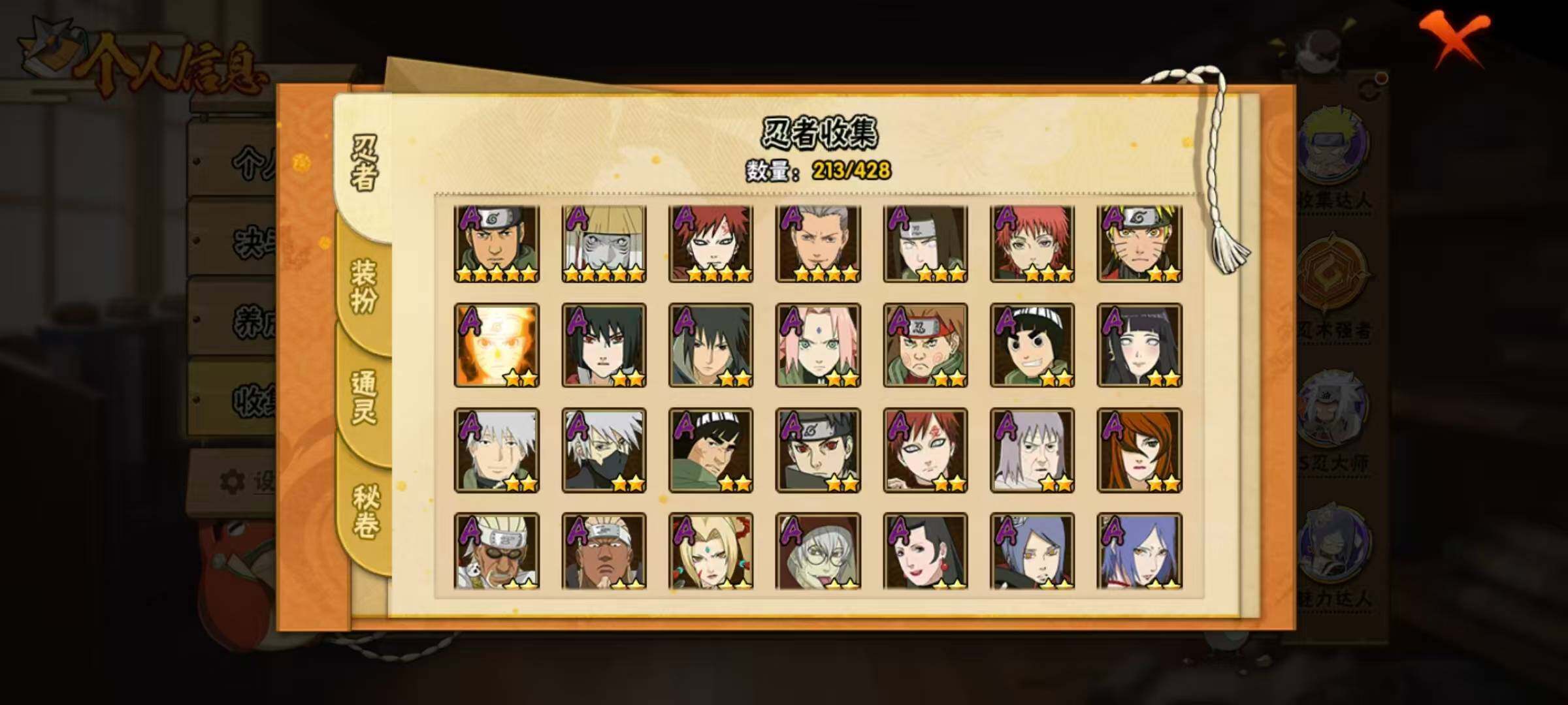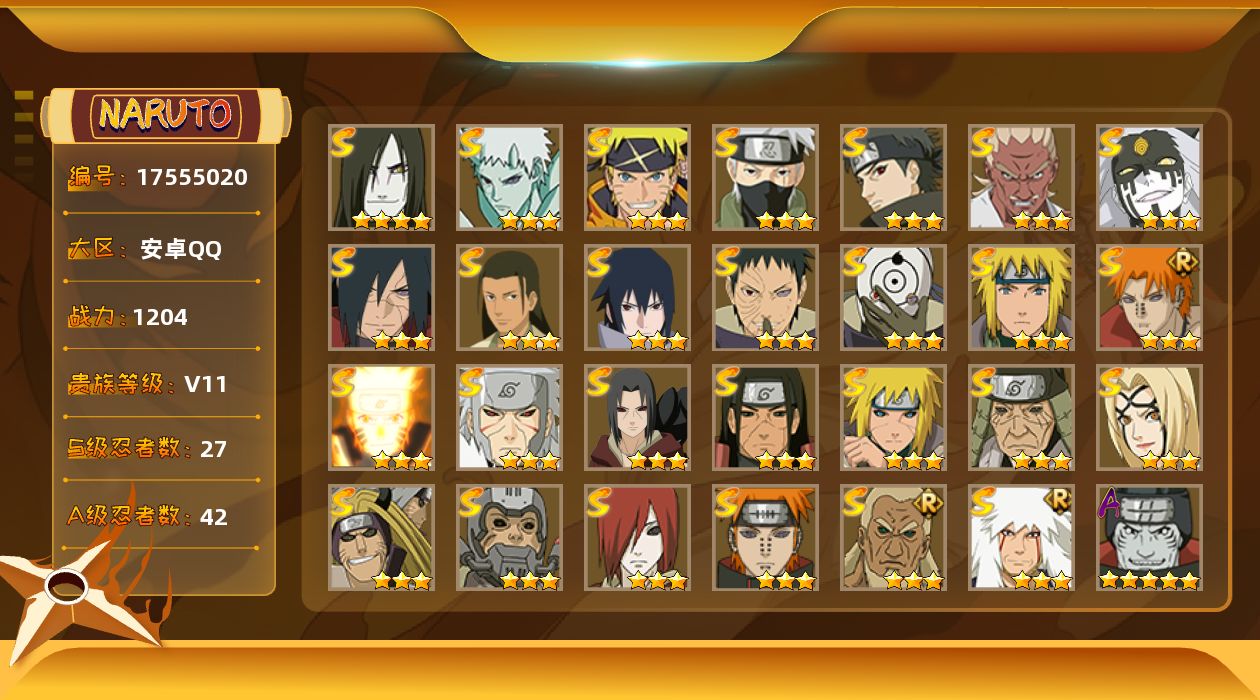 - [16873058]16S级忍者数-35A级忍者数 【S级忍者】:宇智波鼬「秽土转生」(3星),宇智波斑「秽土转生·解」(3星),宇智波带土「忍界大战」(3星),宇智波鼬「须佐能乎」(3星),自来也「舞之豪杰」(3星),大蛇丸(3星),自来也「传说中的三忍」(3星),波风水门(3星),漩涡鸣人「九喇嘛连结」(3星),迈特凯「死门」(3星),佩恩「天道」(3星),宇智波佐助「永恒万花筒」(3星),大筒木金式(3星),波风水门「九喇嘛连结」(3星),宇智波斑「五影会谈」(3星),漩涡鸣人·宇智波佐助(3星) 【A级忍者】:艾「青年」(2星),长门「青年」(2星),波风水门「青年」(2星),大蛇丸「晓」(2星),飞段(3星),飞段「死司凭血」(4星),干柿鬼鲛(4星),漩涡博人「桃式显现」(2星),漩涡鸣人「九尾查克拉」(2星),机械鸣人「初始形态」(2星),迈特凯(3星),桃地再不斩「秽土转生」(2星),我爱罗「疾风传」(3星),蝎(3星),角都「秽土转生」(2星),猿飞阿斯玛(3星),宇智波鼬「夏日限定」(2星),宇智波佐助「须佐能乎」(2星),宇智波佐助「万花筒写轮眼」(2星),药师兜「半蛇斗篷」(2星),照美冥「五代目水影」(2星),日向宁次「忍界大战」(2星),日向雏田「最终章」(2星),宇智波带土「漂泊浪客」(2星),长十郎「六代目水影」(2星),黑土「博人传」(2星),秋道丁次「忍界大战」(2星),千代「近松十人卫」(2星),神农「羁绊」(2星),不缘(2星),宇智波泉奈(2星),大野木「侠隐江湖」(2星),巳月「仙人模式」(2星),纲手「妖怪奇谭」(2星),迈特凯「青春爆炸」(2星)