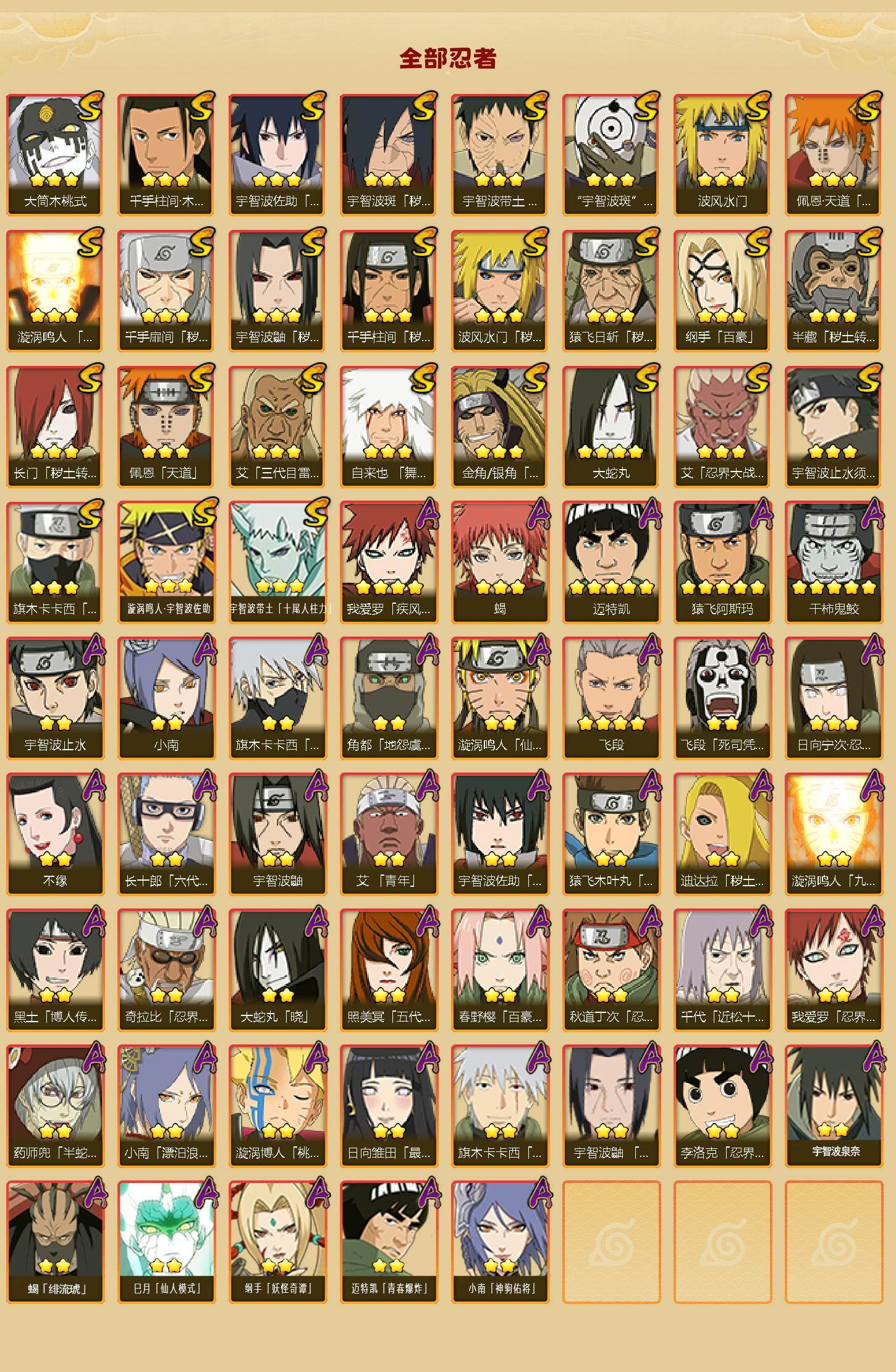 【S级忍者】:长门「秽土转生」(3星),半藏「秽土转生」(3星),金角·银角「秽土转生」(3星),猿飞日斩「秽土转生」(3星),波风水门「秽土转生」(3星),千手扉间「秽土转生」(3星),千手柱间「秽土转生」(3星),宇智波鼬「秽土转生」(3星),宇智波斑「秽土转生·解」(3星),宇智波带土「忍界大战」(3星),艾「忍界大战」(3星),宇智波止水「须佐能乎」(3星),旗木卡卡西「须佐能乎」(3星),千手柱间「木叶创立」(3星),艾「三代目雷影」(3星),自来也「舞之豪杰」(3星),大蛇丸(4星),纲手「百豪」(3星),波风水门(3星),漩涡鸣人「九喇嘛连结」(3星),佩恩「天道」(3星),佩恩·天道「超」(3星),宇智波佐助「永恒万花筒」(3星),宇智波斑 「白面具」(3星宇智波斑「白面具」),大筒木桃式(3星),漩涡鸣人·宇智波佐助(3星),宇智波带土「十尾人柱力」(3星)