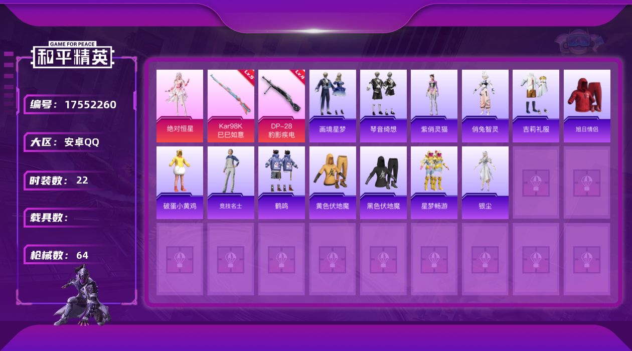 [17552260]安卓 手Q-1粉装-3特效枪-0载具-0粉色飞行器-13224热力值-0王牌印记-22套装-64枪皮【粉色套装】:角色-绝对恒星【粉色枪皮等级】:Kar98K-巳巳如意(五级),Mk14-福马献瑞(一级),DP-28-豹影疾电(四级)【粉色枪皮】:Kar98K-巳巳如意,Mk14-福马献瑞,DP-28-豹影疾电