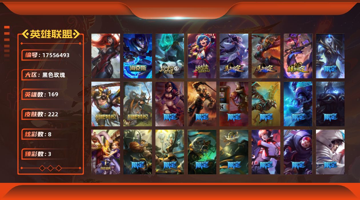 未定级段位-169英雄-222皮肤-8炫彩-1终极-4神话-42限定-26传说-55史诗