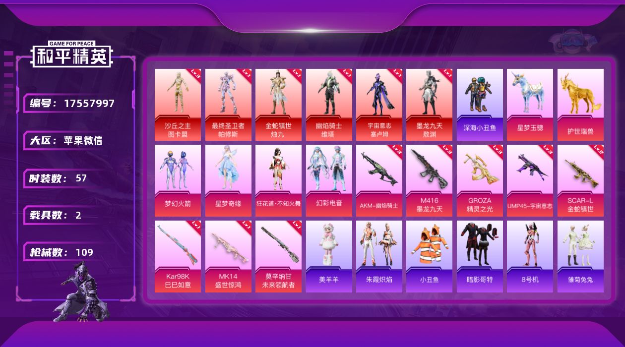 [17557997]【特价出售/店主推荐】苹果 微信-6神装-4粉装-8特效枪-2载具-8粉色飞行器-43905热力值-3王牌印记-57套装-109枪皮 【红色神装等级】:最终圣卫者-帕修斯(一级),金蛇镇世-烛九(一级),幽焰骑士-维塔(一级),宇宙意志-塞卢姆(一级),墨龙九天-敖渊(一级),沙丘之主-图卡盟(三级) 【红色角色神装】:最终圣卫者-帕修斯,金蛇镇世-烛九,幽焰骑士-维塔,宇宙意志-塞卢姆,墨龙九天-敖渊,沙丘之主-图卡盟 【热门品类】:粉装-梦幻火箭,套装-深海小丑鱼,套装-小丑鱼,套装-暗影哥特,角色-8号机 【粉色套装】:粉装-梦幻火箭,角色-星梦奇缘,角色-狂花道·不知火舞,粉装-幻彩电音 【粉色枪皮等级】:AKM-幽焰骑士(三级),SCAR-L-金蛇镇世(二级),M416-墨龙九天(三级),GROZA-精灵之光(三级),UMP45-宇宙意志(三级),Kar98K-巳巳如意(一级),Mk14-盛世惊鸿(一级),莫辛纳甘-未来领航者(一级) 【粉色载具】:星梦玉骢,护世瑞兽 【粉色枪皮】:AKM-幽焰骑士,SCAR-L-金蛇镇世,M416-墨龙九天,GROZA-精灵之光,UMP45-宇宙意志,Kar98K-巳巳如意,Mk14-盛世惊鸿,莫辛纳甘-未来领航者 【粉色飞行器】:酣梦熊熊飞行器,梦幻火箭飞行器,镜域双华-灵镜之阶,深渊漩涡飞行器,曦光华影飞行器,幽焰列车飞行器,凤舞九天飞行器,万象金身飞行器 【粉色降落伞】:春暖花开降落伞,千面幻镜降落伞,精灵梦叶罗丽降落伞,墨龙九天降落伞,创世·救赎降落伞,星梦奇缘降落伞,守护天翼降落伞,宇宙意志降落伞,未来领航者降落伞,精灵之光降落伞,幽焰骑士降落伞,千金淑猫降落伞,盛世惊鸿降落伞,金蛇镇世降落伞,幻彩电音降落伞 【稀有套装】:套装-雏菊兔兔,套装-萝兰蝴蝶,套装-小熊娃娃,角色-狂花道·雅典娜,套装-先驱飞行员,套装-糖糖葫芦,套装-青团波波,套装-鱼渊荷华,角色-海琴烟,套装-极速光影,套装-朱霞炽焰,玩偶服-美羊羊 【稀有枪皮】:AKM-缤纷海域,SCAR-L-炫彩节奏,M416-蓝色火焰,GROZA-春暖花开,AUG-耀粉歌者,AUG-金蛇镇世,QBZ-彩虹符号,QBZ-洛神天依,M762-天降萌叽,G36C-镜域双华,Famas-墨龙九天,ARX-凌霄紫焰,UZI-天降萌叽,UZI-盛世惊鸿,UMP45