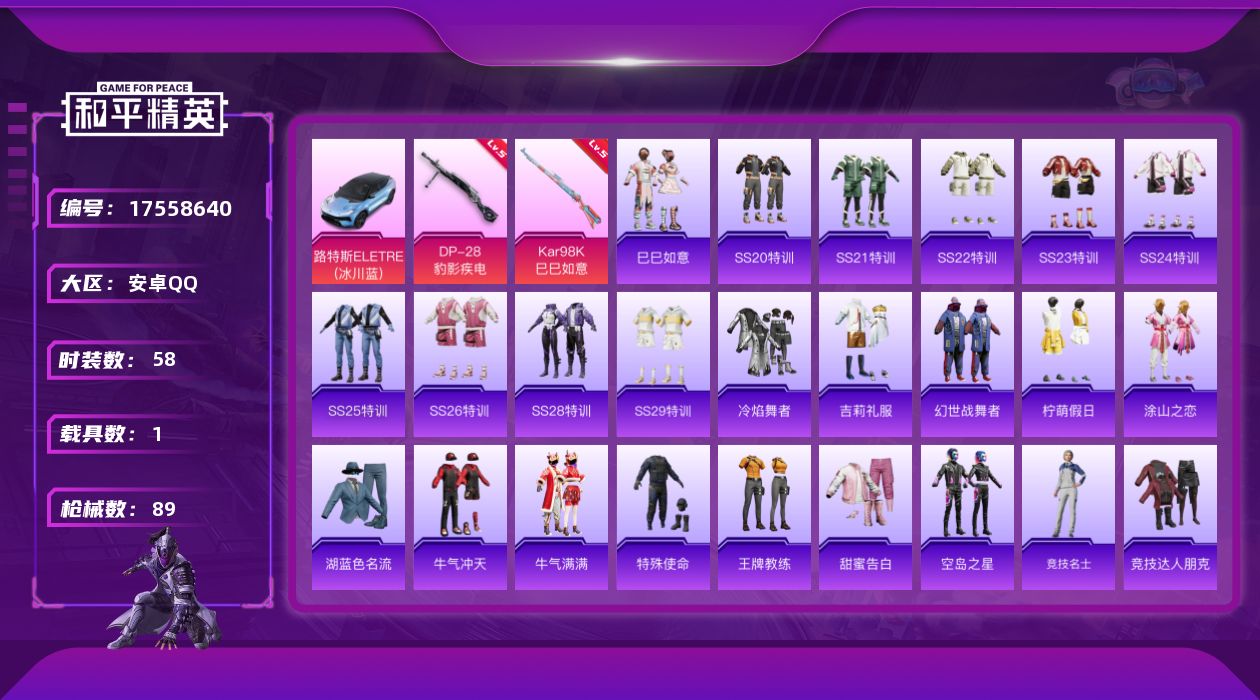 [17558640]【特价出售/店主推荐】安卓 手Q-0粉装-2特效枪-1载具-1粉色飞行器-25031热力值-2王牌印记-58套装-89枪皮【粉色枪皮等级】:Kar98K-巳巳如意(五级),DP-28-豹影疾电(五级)【粉色载具】:路特斯ELETRE(冰川蓝)【粉色枪皮】:Kar98K-巳巳如意,DP-28-豹影疾电
