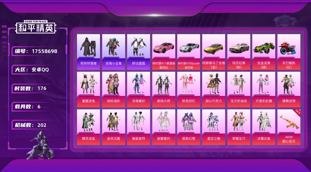 [17558698]可二次【特价出售/店主推荐】安卓 手Q-17粉装-6特效枪-6载具-6粉色飞行器-92658热力值-9王牌印记-176套装-202枪皮 【热门品类】:粉装-童趣迷兔,粉装-缤纷油彩,套装-浪漫天命,套装-深海小丑鱼,套装-奇异狩猎者,套装-胖达圆圆,套装-潮萌小黄鸭,套装-暗影哥特,套装-浪漫波比,套装-粉红小猪,套装-萌熊伴侣 【粉色套装】:粉装-深海曼妙,粉装-数码大师,粉装-粉色回忆,粉装-甜心巧克力,粉装-宝贝奶油派,粉装-天使彩虹糖,粉装-蝶舞迷情,粉装-精灵迷巫,粉装-金风玉露,粉装-智能音符,粉装-缤纷油彩,粉装-甜蜜誓约,粉装-极致幻想,粉装-星空之魅,粉装-草莓生巧,粉装-冰霜白皇,粉装-童趣迷兔 【粉色枪皮等级】:AKM-甜心宝贝(七级),SCAR-L-梦幻火箭(五级),M416-心之恋语(七级),M762-甜蜜誓约(七级),UMP45-雪国精灵(四级),DP-28-豹影疾电(二级) 【粉色载具】:阿斯顿马丁DBX(金),玛莎拉蒂Ghibli(粉),保时捷911 敞篷版(星珀红),保时捷918 Spyder(液态银),合金龙骨(绿),双人摩托-双刃魅影(红),空客H135-蔚蓝之翼 【粉色枪皮】:AKM-甜心宝贝,SCAR-L-梦幻火箭,M416-心之恋语,M762-甜蜜誓约,UMP45-雪国精灵,DP-28-豹影疾电 【粉色飞行器】:深海曼妙飞行器,春暖花开飞行器,精灵迷巫飞行器,神秘黑猫飞行器,夏日绵绵冰飞行器 【粉色降落伞】:深海曼妙降落伞,快乐主宰降落伞,百万伏特降落伞,粉色回忆降落伞,银河战甲降落伞,甜心宝贝降落伞,雪国幻梦降落伞,春暖花开降落伞,精灵迷巫降落伞,梦幻火箭降落伞,金风玉露降落伞,神秘黑猫降落伞,繁花小夜曲降落伞,甜蜜誓约降落伞,四圣焕新降落伞,锦绣火鲤降落伞,荧光虫舞降落伞,夏日绵绵冰降落伞,怪笑疯兔降落伞,星夜魔法师降落伞,炫彩糖果降落伞 【稀有枪皮】:AKM-四圣焕新,AKM-夜灯,AKM-奇异狩猎者,AKM-春暖花开,AKM-灼热熔岩,AKM-生命誓言,AKM-缤纷海域,AKM-萌趣颜团子,AKM-锦绣火鲤,AKM-阿狸红,AKM-霓虹街区,M16A4-机械英豪,M16A4-红色方程式,M16A4-魔法学院,SCAR-L-夏日绵绵冰,SCAR-L-炫彩节奏,SCAR-L-甜蜜誓约,SCAR-L-粉色回忆,SCA