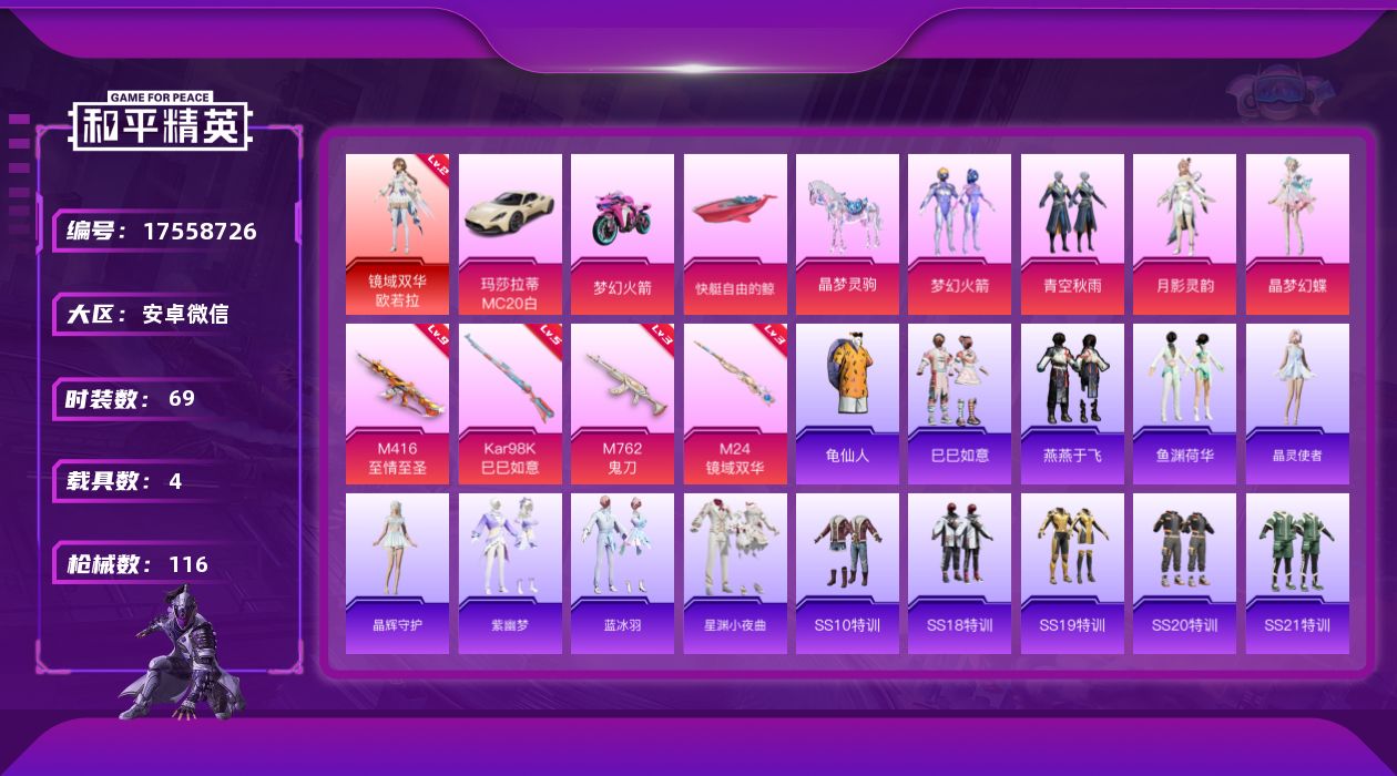 [17558726]可二次【特价出售/店主推荐】安卓 微信-1神装-4粉装-4特效枪-4载具-2粉色飞行器-43370热力值-9王牌印记-69套装-116枪皮 【红色神装等级】:镜域双华-欧若拉(二级) 【红色角色神装】:镜域双华-欧若拉 【热门品类】:粉装-梦幻火箭,套装-龟仙人 【粉色套装】:粉装-梦幻火箭,粉装-青空秋雨,角色-月影灵韵,角色-晶梦幻蝶 【粉色枪皮等级】:M416-至情至圣(九级),M762-鬼刀(三级),Kar98K-巳巳如意(五级),M24-镜域双华(三级) 【粉色载具】:玛莎拉蒂MC20(星石白),双人摩托-梦幻火箭,快艇-自由的鲸,晶梦灵驹 【粉色枪皮】:M416-至情至圣,M762-鬼刀,Kar98K-巳巳如意,M24-镜域双华 【粉色飞行器】:梦幻火箭飞行器,镜域双华-灵镜之阶 【粉色降落伞】:梦幻火箭降落伞,环太平洋降落伞,垂柳戏鸭降落伞,彩虹甜喵降落伞,暗夜鎏金降落伞,仲夏莫吉托降落伞,镜域双华降落伞,晶梦幻蝶降落伞 【稀有套装】:套装-龟仙人,套装-巳巳如意,套装-燕燕于飞,套装-鱼渊荷华,套装-晶灵使者,套装-晶辉守护,套装-紫幽梦,套装-蓝冰羽,套装-星渊小夜曲 【稀有枪皮】:AKM-彩虹符号,M16A4-幻世战舞者,SCAR-L-玉兔迎春,M416-糯团青竹,M416-红色方程式,GROZA-异彩先驱,GROZA-田园牧歌,GROZA-晶梦幻蝶,AUG-天降萌叽,AUG-耀粉歌者,QBZ-银碳小老虎,M762-天降萌叽,M762-彩虹甜喵,M762-暗夜鎏金,Mk47-妙红点点,G36C-镜域双华,AC-VAL-天降萌叽,蜜獾-垂柳戏鸭,蜜獾-天降萌叽,蜜獾-娇憨猪猪,Famas-镜域双华,UZI-啾咪啾咪,UZI-天降萌叽,UZI-娇憨猪猪,UMP45-春暖花开,UMP45-生命誓言,Vector-焰鹰斗篷,Vector-生命誓言,Vector-田园牧歌,汤姆逊-耀粉歌者,P90-巳巳如意,Kar98K-梦幻火箭,M24-幻彩电音,AWM-焰鹰斗篷,SKS-糯团青竹,VSS-田园牧歌,VSS-黑色刀锋,Mini14-梦幻火箭,Mini14-炫彩节奏,Mini14-耀粉歌者,Win94-晶梦幻蝶,SLR-娇憨猪猪,AMR-妙红点点,S686-生命誓言,S686-巳巳如意,S1897-春暖花开,S1897-炫彩节奏,S12K-娇憨猪猪,S1