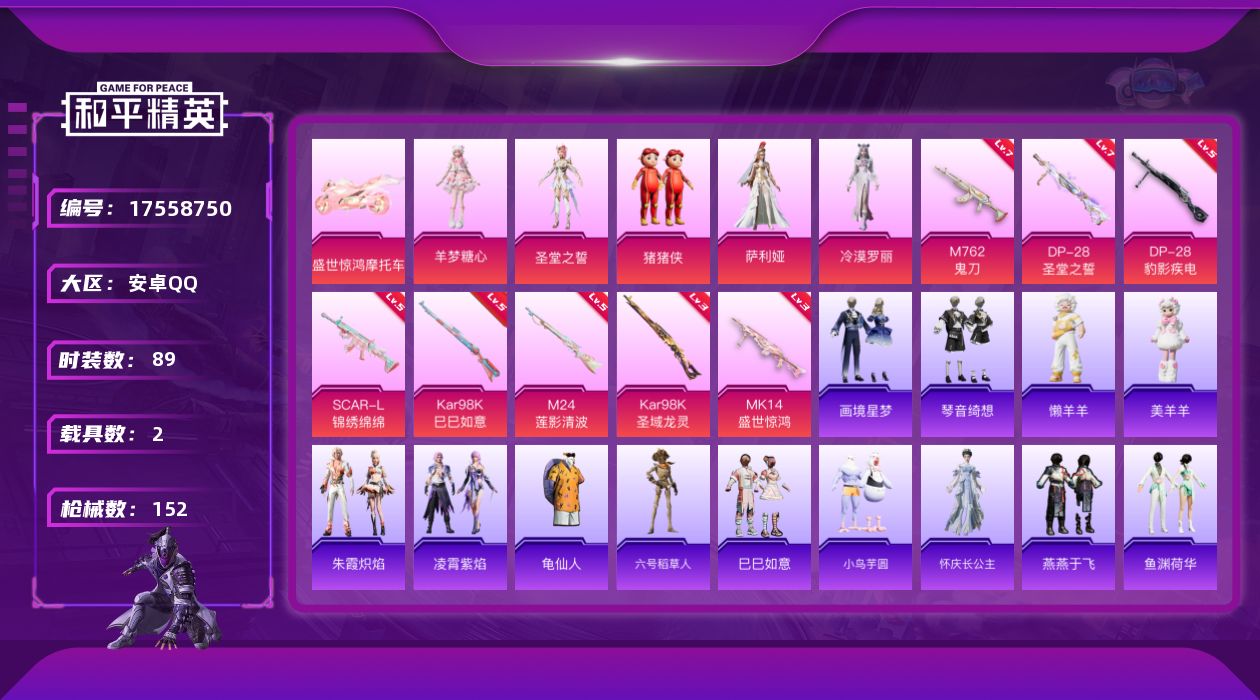 [17558750]【店主推荐捡漏号!可直接换绑】安卓 手Q-6粉装-9特效枪-2载具-6粉色飞行器-51915热力值-8王牌印记-89套装-152枪皮【热门品类】:套装-龟仙人,角色-六号稻草人【粉色套装】:角色-圣堂之誓,玩偶服-猪猪侠,角色-萨利娅,角色-冷漠罗丽,角色-羊梦糖心,角色-罪夜之冕【粉色枪皮等级】:SCAR-L-锦绣绵绵(五级),M762-鬼刀(七级),Kar98K-巳巳如意(五级),Kar98K-圣域龙灵(三级),M24-莲影清波(五级),Mk14-盛世惊鸿(三级),Mk14-福马献瑞(五级),DP-28-圣堂之誓(七级),DP-28-豹影疾电(五级)【粉色载具】:盛世惊鸿摩托车,九霄玄鹿【粉色枪皮】:SCAR-L-锦绣绵绵,M762-鬼刀,Kar98K-巳巳如意,Kar98K-圣域龙灵,M24-莲影清波,Mk14-盛世惊鸿,Mk14-福马献瑞,DP-28-圣堂之誓,DP-28-豹影疾电【粉色飞行器】:镜域双华-灵镜之阶,龙翔九天飞行器,凤舞九天飞行器,圣域金龙飞行器,终晖之翼飞行器,灵猫魔法师飞行器