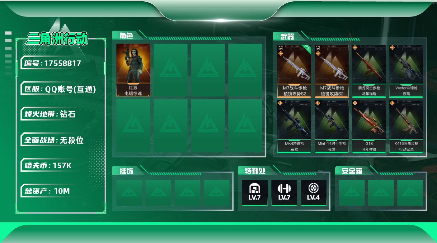 [17558817]10m总资产-157k哈伏币-60烽火等级-钻石-1战场等级-无军衔 【干员外观】:红狼-电锯惊魂 【近战皮肤】:近战-黑鹰 【典藏外观】:M7战斗步枪-棱镜攻势S2 【典藏外观成色】:M7战斗步枪-棱镜攻势S2(优品C) 【传说外观】:K416突击步枪-行动记录,SCAR-H战斗步枪-启航,腾龙突击步枪-马年祥瑞,腾龙突击步枪-万金泪冠,KC17突击步枪-电锯惊魂,Vector冲锋枪-夜莺,勇士冲锋枪-万金泪冠,MK4冲锋枪-夜莺,Mini-14射手步枪-夜莺,M14射手步枪-蛮荒,SKS射手步枪-骑士,R93狙击步枪-维什戴尔,AWM狙击步枪-万金泪冠,G18-马年祥瑞 【史诗外观】:QBZ95-1突击步枪-曙光,K416突击步枪-冬日风情,K416突击步枪-阿萨拉特攻,SG552突击步枪-哈夫克警备,SCAR-H战斗步枪-囚徒,MP5冲锋枪-深海恐惧,MP5冲锋枪-战术竞备,MP5冲锋枪-竞技风,Vector冲锋枪-阿萨拉文明,Vector冲锋枪-猎鳄行动,MP7冲锋枪-六套之力,M249轻机枪-丛影谍踪,QJB201轻机枪-炽焰,VSS射手步枪-丛影谍踪, M14射手步枪-航天庆典,SV-98狙击步枪-猎鳄行动,M700狙击步枪-竞技风 【稀有外观】:UZI冲锋枪-旧梦,K437突击步枪-巨兽,M4A1突击步枪-千里骏骨,SCAR-H战斗步枪-休闲时光,AKM突击步枪-肃杀,K416突击步枪-一帆风顺,M7战斗步枪-捣蛋鬼,SG552突击步枪-2026,SG552突击步枪-马年新春,SG552突击步枪-贴花艺术,SCAR-H战斗步枪-荣耀列队,CAR-15突击步枪-来财,腾龙突击步枪-冰天雪地,KC17突击步枪-来财,MK47突击步枪-冰河潜伏者,MP5冲锋枪-弄臣,MP5冲锋枪-哈夫克卫队,Vector冲锋枪-先锋,UZI冲锋枪-亚特兰蒂斯,SMG-45冲锋枪-行动开启,SR-3M紧凑突击步枪-马年新春,勇士冲锋枪-冰天雪地,M1014霰弹枪-幻影结构,M249轻机枪-冰天雪地,QJB201轻机枪-哈夫克卫队,Mini-14射手步枪-荣耀列队,SR-25射手步枪-开拓,QSZ92G-一帆风顺 【普通外观】:M249轻机枪-古铜,G18-彩墨涂鸦,M4A1突击步枪-粉色涂装,M4A1突击步枪-高雅黑,M4A1突击步枪-海色,QBZ95-1突击步枪-高雅黑,