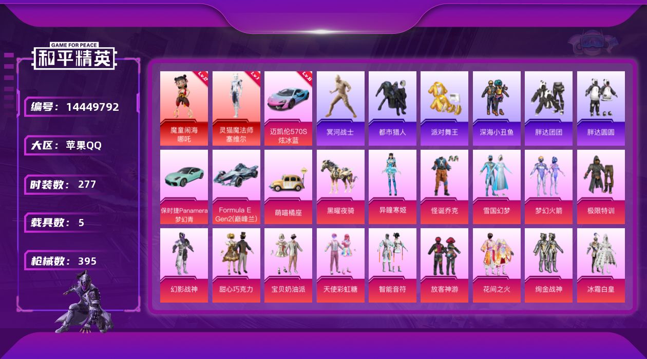 [14449792]【1610】苹果 手Q-无敌战神框-2神装-38粉装-23特效枪-5载具-8粉色飞行器-147248热力值-17王牌印记-277套装-395枪皮