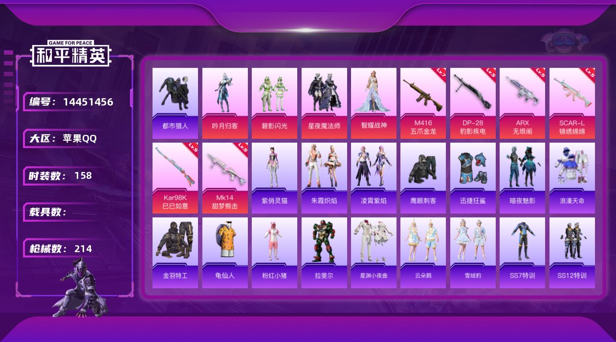 [14451456]【1616】苹果 手Q-4粉装-6特效枪-0载具-1粉色飞行器-62858热力值-6王牌印记-158套装-214枪皮