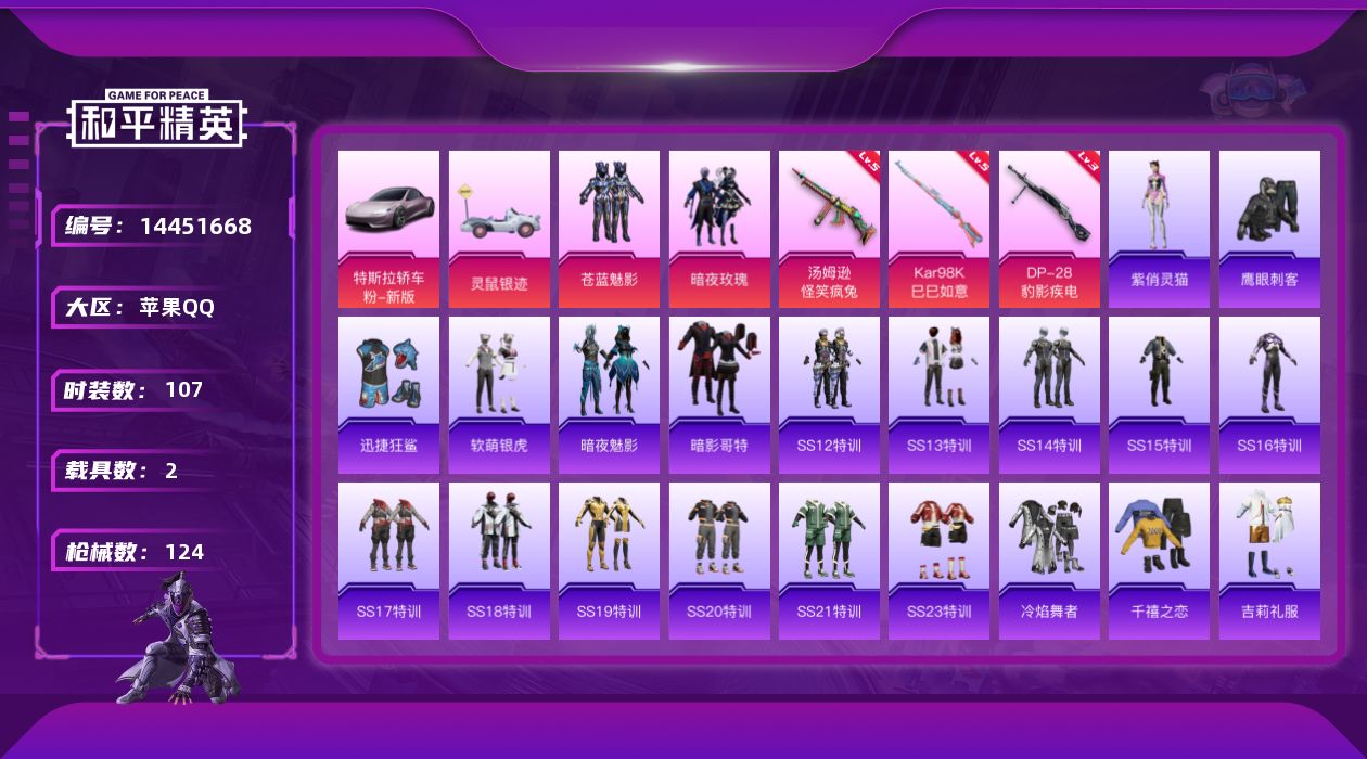 [14451668]【1617】苹果 手Q-2粉装-3特效枪-2载具-0粉色飞行器-41094热力值-7王牌印记-107套装-124枪皮
