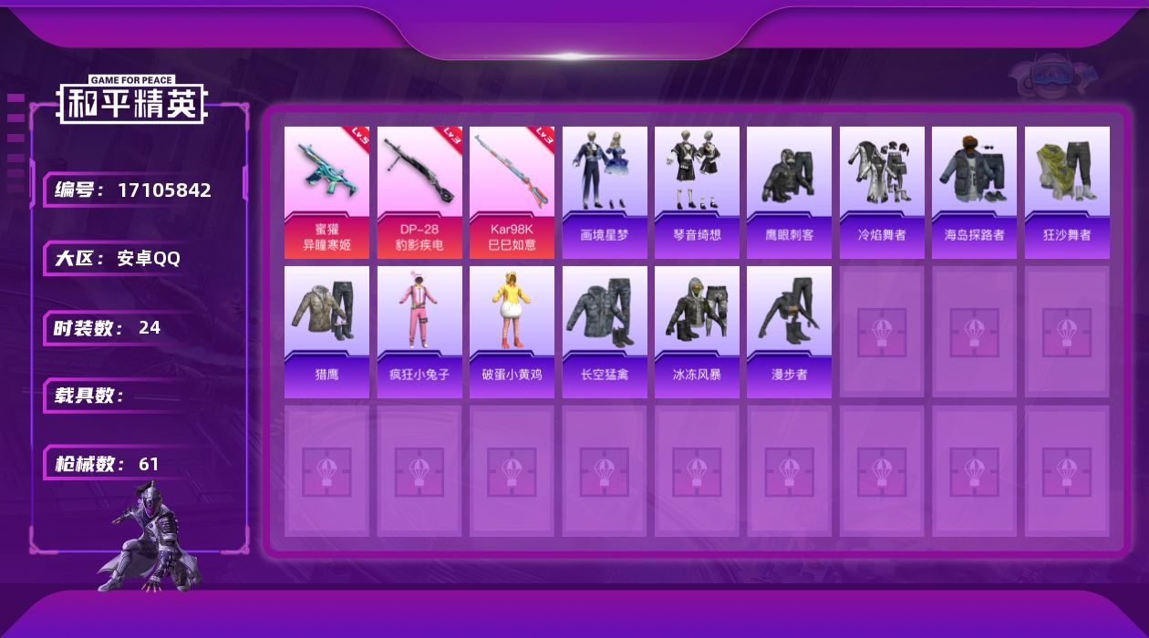 [17105842]【1667】安卓 手Q-0粉装-3特效枪-0载具-1粉色飞行器-13152热力值-2王牌印记-24套装-61枪皮