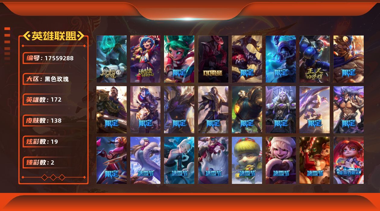 [17559288]【店主推荐捡漏号】黄金段位-172英雄-138皮肤-19炫彩-0终极-2神话-26限定-15传说-36史诗