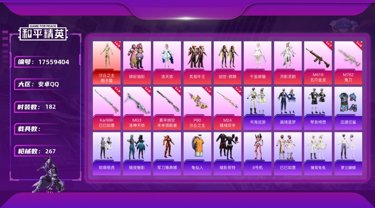 - PX_2097152- 安卓手Q-7王牌印记-7粉装-4特效枪-0载具-65417热力值-155套装-211枪皮-0卓越印记-0传奇印记 【7粉装】,梦幻火箭,天使彩虹糖,深渊皇后,筑梦精灵,寒光使者,暗夜鎏金,蜜桃特工 【4特效枪】SCAR-L-甜梦小狐-6级 SCAR-L-青春物语-1级 M416-至情至圣-9级 Kar98K-巳巳如意-5级 【5稀有紫装】,萌熊伴侣背包(3级),浪漫天命,