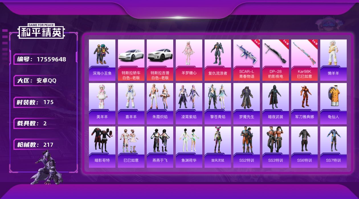 [17559648]【店主推荐捡漏号】安卓 手Q-2粉装-6特效枪-2载具-1粉色飞行器-68199热力值-13王牌印记-175套装-217枪皮【热门品类】:套装-深海小丑鱼,角色-军刀雅典娜,套装-龟仙人,套装-暗影哥特【粉色套装】:角色-复仇流浪者,角色-羊梦糖心【粉色枪皮等级】:SCAR-L-青春物语(七级),UMP45-萌骑冒险(三级),AKS-74U-森灵之息(五级),Kar98K-巳巳如意(五级),Mk14-福马献瑞(五级),DP-28-豹影疾电(五级)【粉色载具】:特斯拉Model 3(珍珠白),特斯拉Model X(珍珠白)【粉色枪皮】:SCAR-L-青春物语,UMP45-萌骑冒险,AKS-74U-森灵之息,Kar98K-巳巳如意,Mk14-福马献瑞,DP-28-豹影疾电