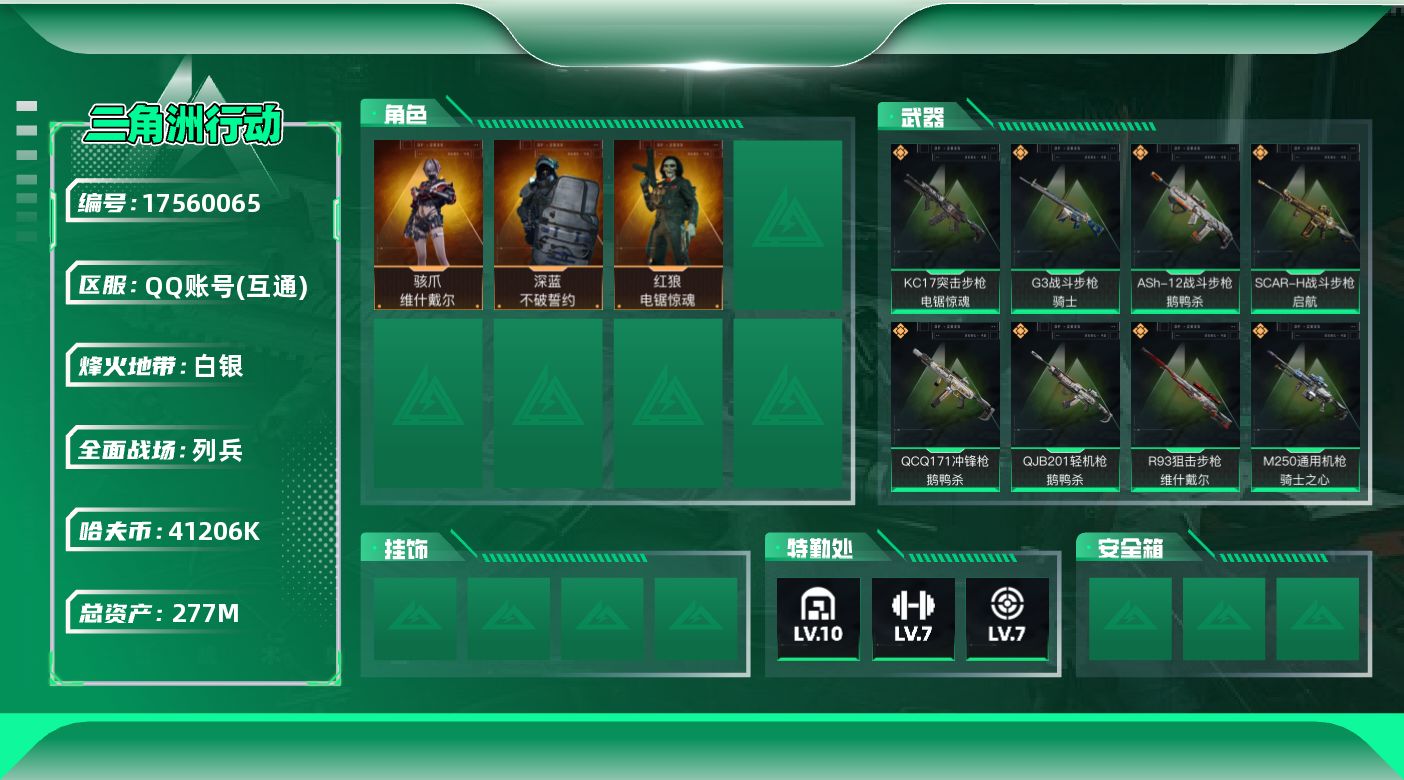 [17560065]可二次【特价出售/店主推荐】277m总资产-41206k哈伏币-60烽火等级-白银-21战场等级-列兵 【干员外观】:骇爪-维什戴尔,深蓝-不破誓约,红狼-电锯惊魂 【近战皮肤】:近战-黑鹰 【传说外观】:M4A1突击步枪-阿米娅,ASh-12战斗步枪-鹅鸭杀,M16A4突击步枪-狩猎时刻,SCAR-H战斗步枪-启航,G3战斗步枪-狩猎时刻,G3战斗步枪-骑士,CAR-15突击步枪-阿米娅,KC17突击步枪-电锯惊魂,Vector冲锋枪-狩猎时刻,勇士冲锋枪-能天使-午夜邮差,QCQ171冲锋枪-鹅鸭杀,M250通用机枪-骑士之心,QJB201轻机枪-鹅鸭杀,R93狙击步枪-维什戴尔 【史诗外观】:ASh-12战斗步枪-无极限,AUG突击步枪-蝮蛇,K437突击步枪-守护者,MP5冲锋枪-战术竞备,P90冲锋枪-莫斯提马,SR-3M紧凑突击步枪-战术竞备,勇士冲锋枪-深海恐惧,MP7冲锋枪-守护者,Mini-14射手步枪-守护者,SV-98狙击步枪-林中猎手,M700狙击步枪-竞技风,AWM狙击步枪-无极限,复合弓-守护者 【稀有外观】:AKM突击步枪-战术演练,AKM突击步枪-精英联盟,M7战斗步枪-捣蛋鬼,SCAR-H战斗步枪-荣耀列队,SCAR-H战斗步枪-黄昏,G3战斗步枪-战术演练,G3战斗步枪-主宰,MP5冲锋枪-弄臣,MP5冲锋枪-虎啸,MP5冲锋枪-哈夫克卫队,P90冲锋枪-黄昏,P90冲锋枪-捣蛋鬼,Vector冲锋枪-先锋,SMG-45-行动开启,SMG-45冲锋枪-幻影结构,S12K霰弹枪-战术演练,QJB201轻机枪-黄昏,QJB201轻机枪-哈夫克卫队,Mini-14射手步枪-荣耀列队,SR-25射手步枪-开拓,SV-98狙击步枪-星链科技,SV-98狙击步枪-哈夫克航天,SV-98狙击步枪-精英联盟,G18-星链科技,G18-哈夫克航天 【普通外观】:M4A1突击步枪-粉色涂装,M4A1突击步枪-高雅黑,M4A1突击步枪-海色,QBZ95-1突击步枪-高雅黑,QBZ95-1突击步枪-海浪,QBZ95-1突击步枪-三角洲力量,QBZ95-1突击步枪-海色,K416突击步枪-几何迷彩,K416突击步枪-高雅黑,M16A4突击步枪-山林猎人,M16A4突击步枪-高雅黑,M7战斗步枪-红色涂装,SG552突击步枪-浅蓝涂装,SG552突击步枪-