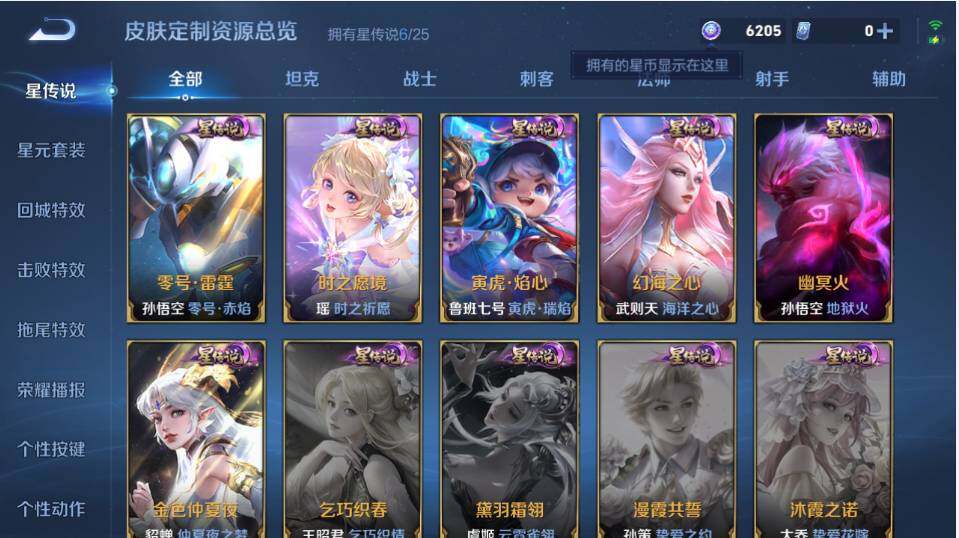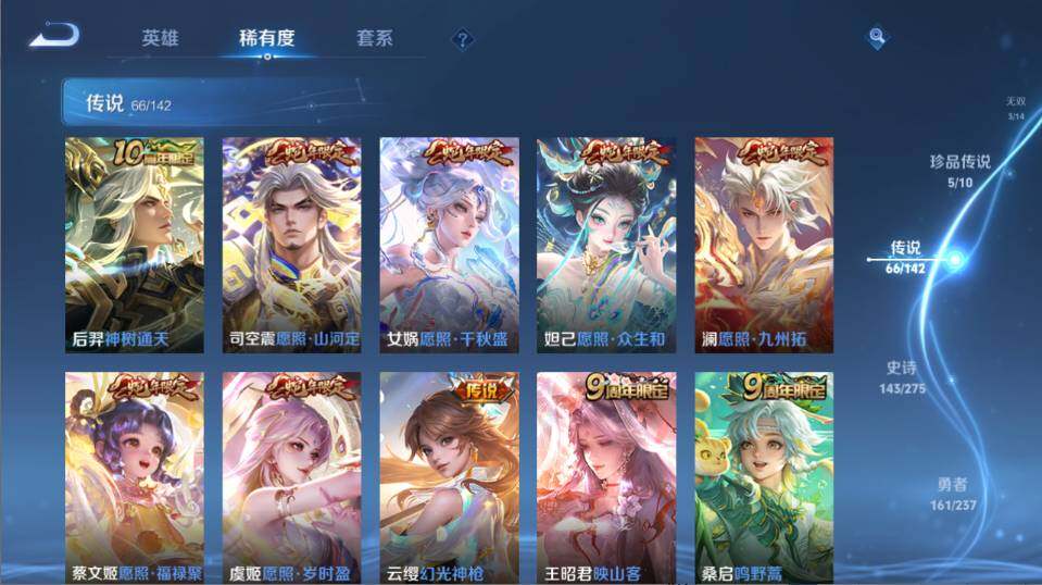 【传说皮肤】:后羿神树通天,司空震愿照山河定,女娲愿照千秋盛,妲己愿照众生和,澜愿照九州拓,蔡文姬愿照福禄聚,虞姬愿照岁时盈,云缨幻光神枪,王昭君映山客,桑启鸣野蒿,夏侯惇霜北刀,铠冥王哈迪斯,海月金乌负日,亚连落雪白狼,典韦战鼓燎原,孙尚香乘龙问璇玑,赵云乘龙铭钟鼎,澜逐花归海,艾琳觅芳踪,狄仁杰夜礼服假面,王昭君永恒水手月亮,云缨鹤归松栖,东皇太一灼幽烈阳,澜电玩雷克斯,安琪拉追逃游戏,小乔山海琳琅生,曜山海苍雷引,吕布怒海麟威,李白诗剑行,百里守约碎云,橘右京枫霜尽,娜可露露前尘镜,马超无双飞将,大乔挚爱花嫁,孙策挚爱之约,露娜启示之音,蔡文姬花朝如约,瑶时之祈愿,鲁班七号寅虎瑞焰,王昭君乞巧织情,西施游龙清影,曜李逍遥 ,小乔音你心动,李元芳飞鸢探春,公孙离祈雪灵祝,镜炽阳神光,虞姬启明星使,孙悟空零号赤焰,曜云鹰飞将,李信一念神魔,刘备时之恋人,伽罗太华,貂蝉猫影幻舞,张良黄金白羊座,干将莫邪久胜战神,虞姬云霓雀翎,花木兰冠军飞将,梦奇胖达荣荣,后羿黄金射手座,诸葛亮武陵仙君,貂蝉仲夏夜之梦,李白凤求凰,宫本武藏地狱之眼,孙悟空地狱火,武则天海洋之心,狄仁杰超时空战士