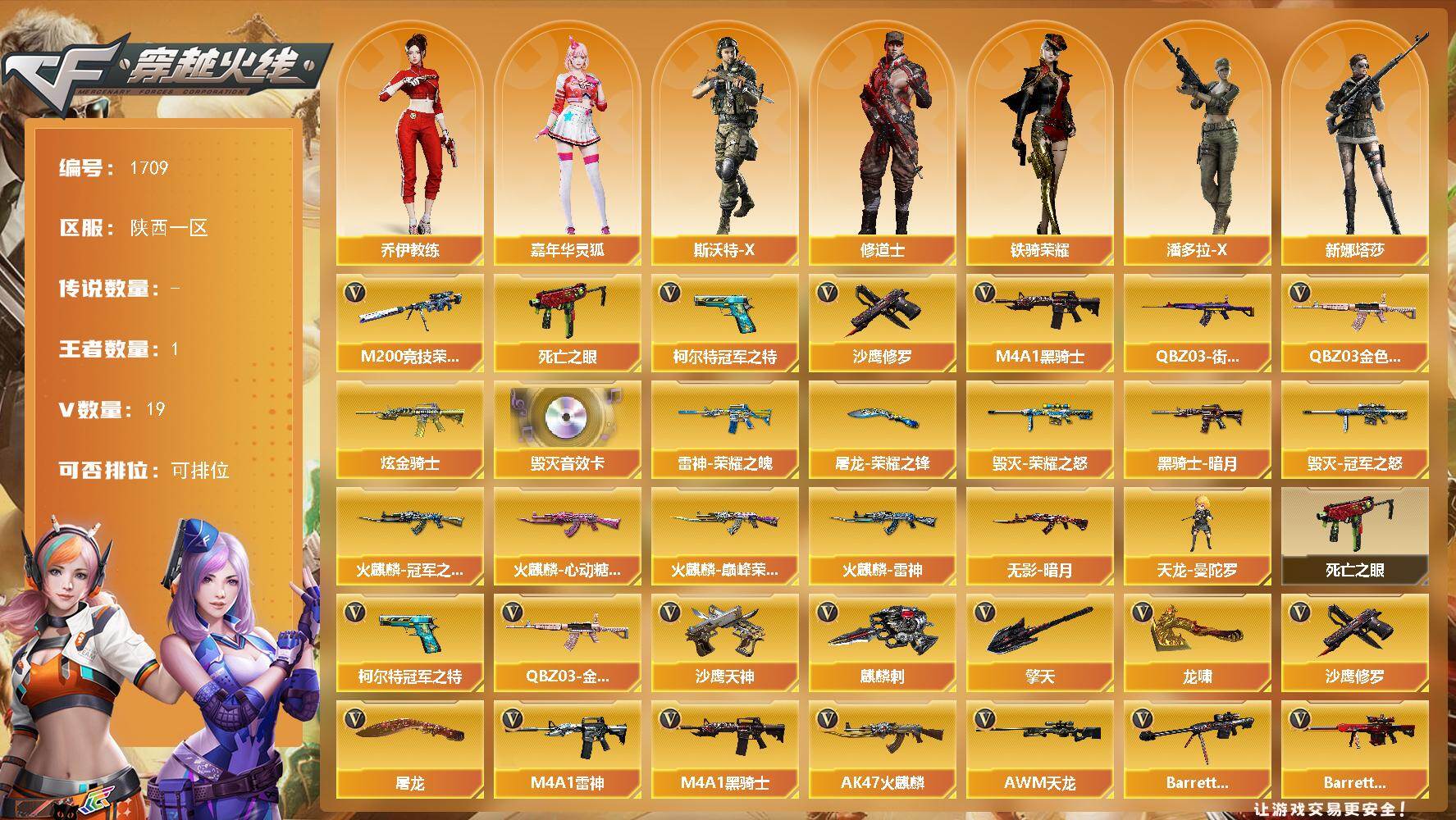 [17459452]陕西一区-19V-1王者-1炫金 【热门武器】:QBZ03-金色蔷薇,M200-竞技荣光,死亡之眼,QBZ03-街机,柯尔特-冠军之特*2,M4A1-黑骑士,沙鹰-修罗 【王者炫金武器】:炫金骑士 【音效卡】:Barrett-毁灭音效卡 【皮肤】:雷神-荣耀之魄,火麒麟-雷神,火麒麟-冠军之心*2,火麒麟-巅峰荣耀,火麒麟-心动糖果,毁灭-荣耀之怒,毁灭-冠军之怒,黑骑士-暗月*2,无影-暗月,屠龙-荣耀之锋 【角色】:乔伊教练,修道士,芳心审判者,嘉年华灵狐,潘多拉-X,斯沃特-X,铁骑荣耀,新娜塔莎,海豹突击队 【人偶武器】:天龙-曼陀罗 【暴走生化】:死亡之眼 【英雄级武器】:AK47-火麒麟,M4A1-雷神,M4A1-黑骑士,QBZ03-金色蔷薇,黑骑士-海王,AWM-天龙,Barrett-毁灭,Barrett-极光,AWM-裁决,M200-竞技荣光,沙鹰-修罗,沙鹰-天神,柯尔特-冠军之特*2,屠龙,龙啸,擎天,麒麟刺,烟雾弹-雷霆王者-觉醒版 【道具】:战舰背包,炫彩背包,超级背包,绿色巨人,灵魂忍者,迷雾幽灵,夺命之镰,防化服*3,金色流光-枪王排位,星辰流光-枪王排位,巅峰赛先锋-金色流光,流光-再燃火线,枪王排位28赛季金色流光,枪王排位29赛季金色流光,C4-黑曜,防弹头盔*3,防弹衣*5,C4工具钳*4,手雷包*5 【特殊枪械】:1黑骑士