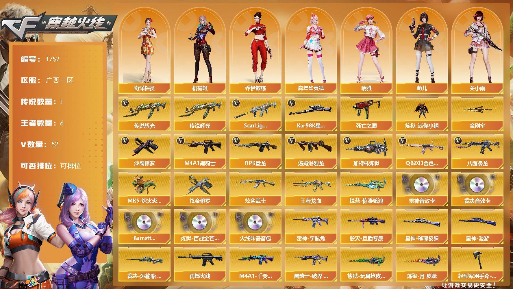 [17562931]广西一区-52V-6王者-2炫金 【传说武器】:传说辉光 【传说角色】:传说星骇 【热门武器】:传说辉光,QBZ03-金色蔷薇,Scar Light-白虎,八面凌龙,死亡之眼,Kar98K-星神,炼狱-迷你小钢,M4A1-黑骑士*2,汤姆逊-烈龙*2,RPK-盘龙,加特林-炼狱,MK5-炽火炎龙,沙鹰-修罗,金刚伞 【王者炫金武器】:王者龙血,悦蓝-惊涛骇浪,炫金武士,炫金修罗 【音效卡】:M4A1-雷神音效卡,AWM-裁决音效卡,Barrett-碧霄极光音效卡,炼狱-百战金芒-庆典舞曲音效卡,火线妹语音包 【皮肤】:裁决-运输船 皮肤,星神-璀璨皮肤,星神-漫游,雷神-宇航兔皮肤,M4A1-再燃火线,毁灭-直播专属,M4A1-千变-孔明皮肤,黑骑士-破界 皮肤,炼狱-玩具枪皮肤,炼狱-月 皮肤,轻型军用手斧-再燃火线,麒麟刺-萌杀皮肤,麒麟刺-月皮肤 【角色】:樱,关小雨,晴雅,机械姬,奇洋探员,乔伊教练,修道士,飞虎队-X,风暴女,嘉年华灵狐,娟娟,灵狐者-X,龙儿,曼陀罗-礼服,萌儿,女战神,女主播,潘多拉-甜心教官,斯沃特-X,兔囡囡 【人偶武器】:白虎-迷你小艾,炼狱-迷你小钢,MK5-炽火炎龙,AWM-灵狐-15周年嘉年华*2,迷你深渊冰龙*2,迷你波特博士,夺魂,迷你生化手雷,生化手雷-机甲核心,深渊终结者手雷,迷你巨石泰坦-魔花研究所,灵狐娃娃手雷 【暴走生化】:死亡之眼,超级对讲机 【挑战大师】:火狱乱世-超越Max,机甲撕裂者III,试炼破坏者III,KAC-圣炎切割者III,阐释者III*2,惩戒者III 【英雄级武器】:M4A1-黑龙,M4A1-雷神,M4A1-黑骑士*2,AK47-黑武士,AN94-超新星,Scar Light-白虎,QBZ03-天罚,无影-神兵利器,QBZ03-云龙,黑武士-锦绣游龙,超新星-热带奇洋,八面凌龙,QBZ03-独角-IV,QBZ03-金色蔷薇,王者猎神-觉醒版,AWM-裁决,Barrett-朱雀,Kar98K-星神,王者森决-觉醒版,RPK-盘龙,加特林-炼狱,炼狱-百战金芒,汤姆逊-烈龙*2,沙鹰-修罗,COP 357-云龙,修罗-云海游龙,擎天*2,麒麟刺,龙啸-热带奇洋,麒麟刺-百战金芒,王者冰锋-觉醒版,高爆手雷-神工天巧,高爆手雷-云龙*2,手雷-热带奇洋,闪光弹-云龙*2,烟雾弹-云龙*2,M4