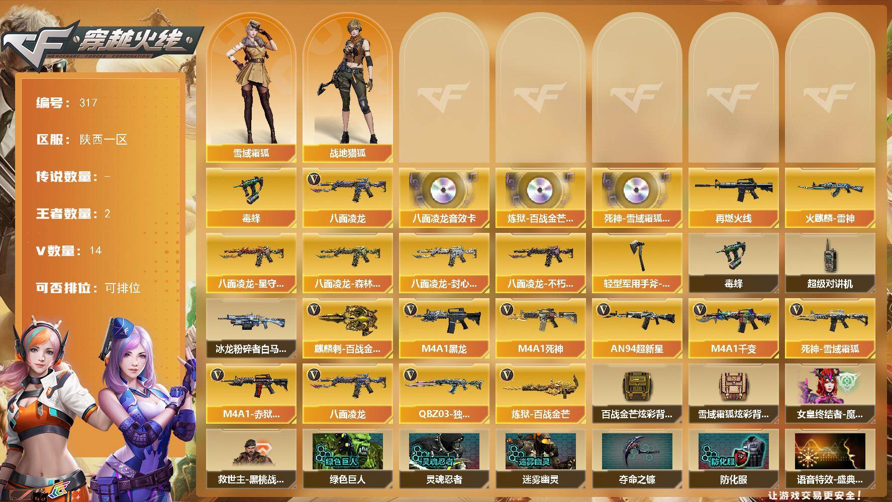 - [14396042]湖北一区-35V-3王者-2炫金 【热门武器】:Scar Light-白虎,M200-竞技荣光,金色蔷薇-空,裁决-雪莉杨,沙鹰-修罗,金刚伞 【王者炫金武器】:炫金天龙,炫金天神 【音效卡】:Scar Light-白虎音效卡 【皮肤】:裁决-流光秘银,雷神-荣耀之魄,雷神-宠儿-2019MVP,雷神-脉冲核心,火麒麟-盘古,火麒麟-心动糖果,毁灭-荣耀之怒,毁灭-黑大圣皮肤*2,毁灭-秦师 皮肤,屠龙-春桃 皮肤 【角色】:电竞教官-云悠悠,关小雨,王者零-华冠丽服,奇洋探员,乔伊教练,暗夜-X,初恋灵狐,电竞少女,飞虎队-X,风暴女,嘉年华灵狐,卡塔琳娜,猎狐者-追月,灵狐者-X,麻雀,曼陀罗-X,曼陀罗-礼服,潘多拉-X,潘多拉-甜心教官,斯沃特-X,兔囡囡,职业选手 【人偶武器】:裁决-雪莉杨,金色蔷薇-空,AWM-灵狐-15周年嘉年华,迷你深渊冰龙,迷你波特博士,夺魂,迷你牛牛,迷你生化手雷*2,深渊终结者手雷,迷你超能女侍 【暴走生化】:超级对讲机 【挑战大师】:冰龙粉碎者-白马银枪,激光毁灭者III-白马银枪,试炼破坏者III 【英雄级武器】:AK47-火麒麟,M4A1-雷神,Scar Light-白虎,无影-神兵利器,黑武士-锦绣游龙,超新星-热带奇洋,烈火-动感闪耀,王者之魄-觉醒版,超新星-悦享-觉醒版,Barrett-毁灭,AWM-裁决,M200-竞技荣光,沙鹰-修罗,COP-雷霆,柯尔特-竞技荣光,天神-动感闪耀,屠龙,擎天-竞技荣光*2,屠龙-动感闪耀,龙啸-热带奇洋,高爆手雷-雷霆,高爆手雷-竞技荣光,手雷-动感闪耀,高爆手雷-云龙,手雷-热带奇洋,闪光弹-雷霆*2,闪光弹-竞技荣光,闪光弹-云龙,烟雾弹-雷霆,烟雾弹-竞技荣光,烟雾弹-云龙*2 【道具】:神秘礼盒背包,亚洲杯纪念炫彩背包,冰冰企鹅背包-猛男专用,冰冰企鹅背包,奇洋探员-海龟背包,热带奇洋炫彩背包,超级背包,迷你冰龙背包,绿色巨人,灵魂忍者*2,变异宝贝,迷雾幽灵*2,生化弹匣,夺命之镰,防化服*2,金色流光-枪王排位*2,星辰流光-枪王排位,枪王排位28赛季金色流光,枪王排位29赛季金色流光,电玩兔兔表情,热带奇洋表情,动感闪耀表情,防弹头盔*2,防弹衣*2,C4工具钳*2,手雷包*2 【特殊枪械】:1白虎