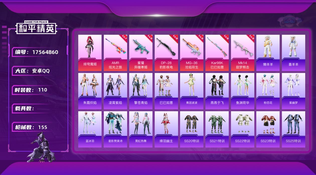 [17564860]安卓 手Q-2粉装-8特效枪-0载具-0粉色飞行器-41636热力值-6王牌印记-110套装-155枪皮 【粉色套装】:角色-绯穹魔姬,角色-辉云木星 【粉色枪皮等级】:蜜獾-异瞳寒姬(五级),Kar98K-巳巳如意(五级),Mk14-甜梦熊击(五级),AMR-炫光之旅(七级),DP-28-豹影疾电(五级),MG-36-沧焰双生(五级) 【粉色枪皮】:蜜獾-异瞳寒姬,ACE32-萌骑漫游,Kar98K-巳巳如意,Mk14-甜梦熊击,Mk14-福马献瑞,AMR-炫光之旅,DP-28-豹影疾电,MG-36-沧焰双生 【粉色降落伞】:暗夜鎏金降落伞,音爆索尼克降落伞,未来领航者降落伞,星穹咏叹调降落伞,喜羊羊与灰太狼降落伞,异瞳寒姬降落伞,极意拳锋降落伞,炫彩糖果降落伞 【稀有套装】:套装-巳巳如意,角色-魂电,套装-马上有钱,套装-青团波波,套装-燕燕于飞,套装-鱼渊荷华,套装-粉恋花,套装-紫幽梦,套装-蓝冰羽,套装-星影赞美诗,套装-霓虹热舞,角色-绛羽幽主,套装-朱霞炽焰,套装-凌霄紫焰,套装-擎苍青焰,玩偶服-懒羊羊,玩偶服-喜羊羊,套装-雨过天青,套装-红釉青花,角色-霜纹水星 【稀有枪皮】:AKM-彩虹符号,AKM-破晓战魂,AKM-龙的传人,SCAR-L-炫彩节奏,SCAR-L-玉兔迎春,SCAR-L-红色方程式,M416-糯团青竹,M416-红色方程式,M416-蓝色火焰,GROZA-彩虹符号,GROZA-田园牧歌,AUG-耀粉歌者,QBZ-彩虹符号,M762-天降萌叽,M762-彩虹符号,Mk47-妙红点点,Mk47-洛神天依,G36C-星穹咏叹调,AC-VAL-天降萌叽,AC-VAL-快闪甜心,蜜獾-天降萌叽,蜜獾-娇憨猪猪,蜜獾-绯穹魔姬,ARX-凌霄紫焰,UZI-啾咪啾咪,UZI-娇憨猪猪,UMP45-夜灯,UMP45-生命誓言,Vector-生命誓言,Vector-田园牧歌,汤姆逊-耀粉歌者,JS9-凌霄紫焰,P90-快闪甜心,P90-巳巳如意,Kar98K-红色方程式,Kar98K-星穹咏叹调,SKS-炫彩节奏,VSS-田园牧歌,Mini14-炫彩节奏,Mini14-耀粉歌者,Mk14-治愈之星,SLR-娇憨猪猪,SLR-彩虹符号,AMR-妙红点点,AMR-喜羊羊与灰太狼,M417-惊鸿侠骨,MK20-H-快闪甜心,M200-惊鸿侠骨,S6