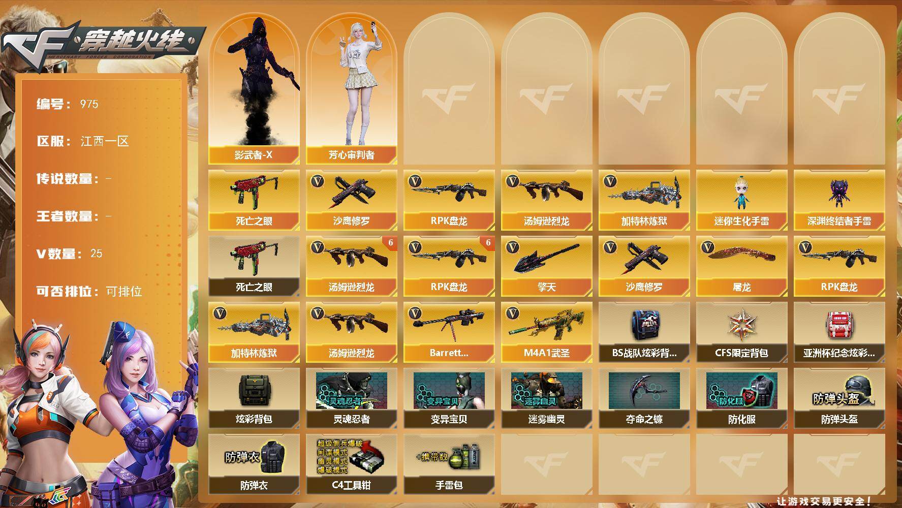 [17565494]江西一区-25V-0王者-0炫金 【热门武器】:死亡之眼,汤姆逊-烈龙*6,RPK-盘龙*6,加特林-炼狱,沙鹰-修罗*6 【角色】:芳心审判者,影武者-X 【人偶武器】:迷你生化手雷,深渊终结者手雷 【暴走生化】:死亡之眼 【英雄级武器】:M4A1-武圣,Barrett-毁灭,RPK-盘龙*6,加特林-炼狱,汤姆逊-烈龙*6,沙鹰-修罗*6,屠龙,擎天 【道具】:BS战队炫彩背包,CFS限定背包,亚洲杯纪念炫彩背包,炫彩背包,灵魂忍者,变异宝贝,迷雾幽灵,夺命之镰,防化服,防弹头盔,防弹衣,C4工具钳,手雷包 【特殊枪械】:6烈龙,6盘龙,1炼狱