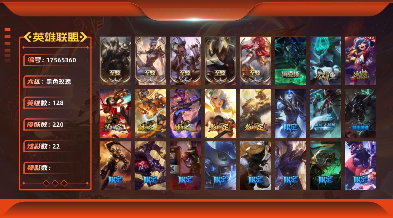 [17565360]未定级段位-128英雄-220皮肤-22炫彩-0终极-8神话-26限定-21传说-59史诗