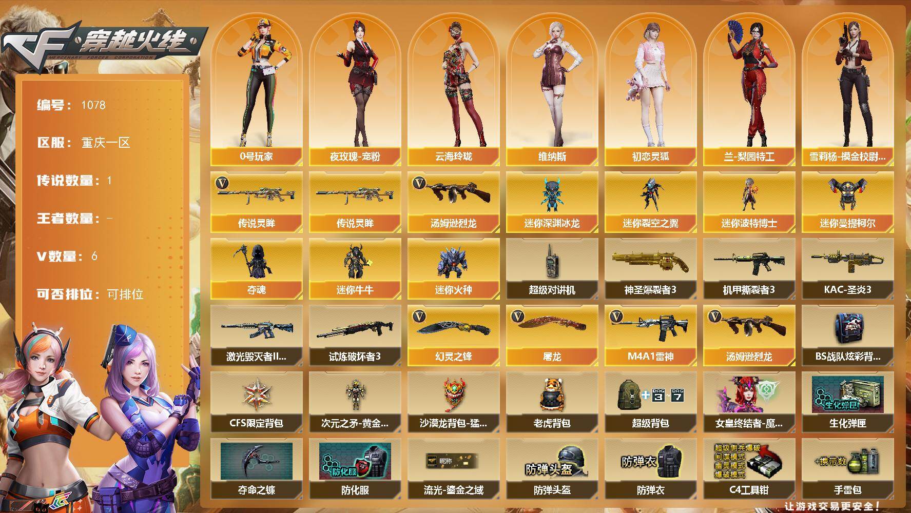 [17531251]重庆一区-6V-0王者-0炫金 【传说武器】:传说灵眸 【热门武器】:传说灵眸,汤姆逊-烈龙 【角色】:云海玲珑,炽天使,暗夜-X,初恋灵狐,芳心审判者,风暴女,虎妞,兰-梨园特工,0号玩家,灵狐者-X,麻雀,潘多拉-X,潘多拉-甜心教官,青霞仙子,蜀雪,铁骑荣耀,维纳斯,新娜塔莎,雪莉杨-摸金校尉,夜玫瑰-宠粉,影武者-X 【人偶武器】:迷你深渊冰龙,迷你裂空之翼*2,迷你波特博士,迷你曼提柯尔,夺魂,迷你牛牛,迷你火种 【暴走生化】:超级对讲机 【挑战大师】:神圣爆裂者III,激光毁灭者III-白马银枪,机甲撕裂者III,试炼破坏者III,KAC-圣炎切割者III 【英雄级武器】:M4A1-雷神,汤姆逊-烈龙,屠龙,幻灵之锋 【道具】:BS战队炫彩背包,CFS限定背包,次元之矛-黄金背包,沙漠龙背包-猛男专属,老虎背包,超级背包,女皇终结者-魔龙之吻,生化弹匣,夺命之镰,防化服,流光-鎏金之域,枪王排位28赛季金色流光,EP战队名片,EP战队喷图,EP战队击杀图标,防弹头盔,防弹衣,C4工具钳,手雷包 【特殊枪械】:1烈龙