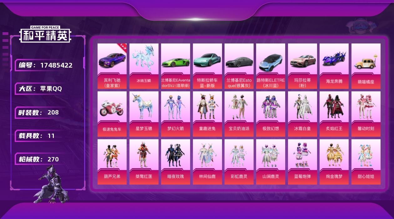 [17485422]苹果 手Q-22粉装-7特效枪-11载具-8粉色飞行器-104353热力值-12王牌印记-208套装-270枪皮 【红色载具】:宾利飞驰(皇家紫)(三级) 【热门品类】:粉装-梦幻火箭,粉装-童趣迷兔,套装-潮萌小黄鸭,套装-浪漫波比,套装-粉红小猪,套装-红熊茄茄 【粉色套装】:粉装-宝贝奶油派,粉装-梦幻火箭,粉装-极致幻想,粉装-冰霜白皇,粉装-童趣迷兔,粉装-炙焰红王,粉装-馨动时刻,粉装-葫芦兄弟,粉装-桀骜红莲,粉装-暗夜玫瑰,粉装-林间仙鹿,粉装-彩虹鹿灵,粉装-山涧鹿灵,粉装-蓝莓炮弹,粉装-绚金瑰梦,粉装-甜心娃娃,粉装-精灵娃娃,粉装-酣梦娃娃,粉装-焦糖拿铁,粉装-碧影闪光,角色-星梦奇缘,角色-绯穹魔姬 【粉色枪皮等级】:SCAR-L-魔童闹海 哪吒(三级),M416-风花雪月(七级),AUG-星梦奇缘(三级),M762-甜心娃娃(五级),Kar98K-巳巳如意(五级),SKS-碧影闪光(四级),M249-蓝莓炮弹(五级) 【粉色载具】:特斯拉Roadster(水滴蓝),兰博基尼Aventador SVJ(翡翠绿),兰博基尼Estoque(银翼灰),路特斯ELETRE(冰川蓝),玛莎拉蒂Ghibli(粉),宾利飞驰(皇家紫),海龙奔腾,萌喵橘座,极速兔兔车,僚机-萌兔起飞,星梦玉骢,冰绡玉鳞 【粉色枪皮】:SCAR-L-魔童闹海 哪吒,M416-风花雪月,AUG-星梦奇缘,M762-甜心娃娃,Kar98K-巳巳如意,SKS-碧影闪光,M249-蓝莓炮弹 【粉色飞行器】:炫彩糖果飞行器,夏日绵绵冰飞行器,绚金瑰梦飞行器,甜心娃娃飞行器,龙翔九天飞行器,星梦奇缘飞行器,飞天猪飞行器,灵珠游龙飞行器 【粉色降落伞】:百万伏特降落伞,甜心宝贝降落伞,夏日绵绵冰降落伞,童趣迷兔降落伞,怪笑疯兔降落伞,暗夜玫瑰降落伞,林间仙鹿降落伞,海渊国主降落伞,蓝莓炮弹降落伞,绚金瑰梦降落伞,甜心娃娃降落伞,焦糖拿铁降落伞,碧影闪光降落伞,恐龙拽拽降落伞,庄周梦蝶降落伞,暖熊萌萌降落伞,垂柳戏鸭降落伞,墨龙九天降落伞,星梦奇缘降落伞,智耀战神降落伞,魔童闹海 哪吒降落伞,炫彩糖果降落伞 【稀有套装】:套装-雪国风尚,套装-炫彩糖果,套装-雏菊兔兔,套装-萝兰蝴蝶,角色-达芬奇,套装-糖糖葫芦,套装-青团波波,套装-燕燕于飞,套装-鱼渊荷华,角色-海琴烟,套装-粉恋