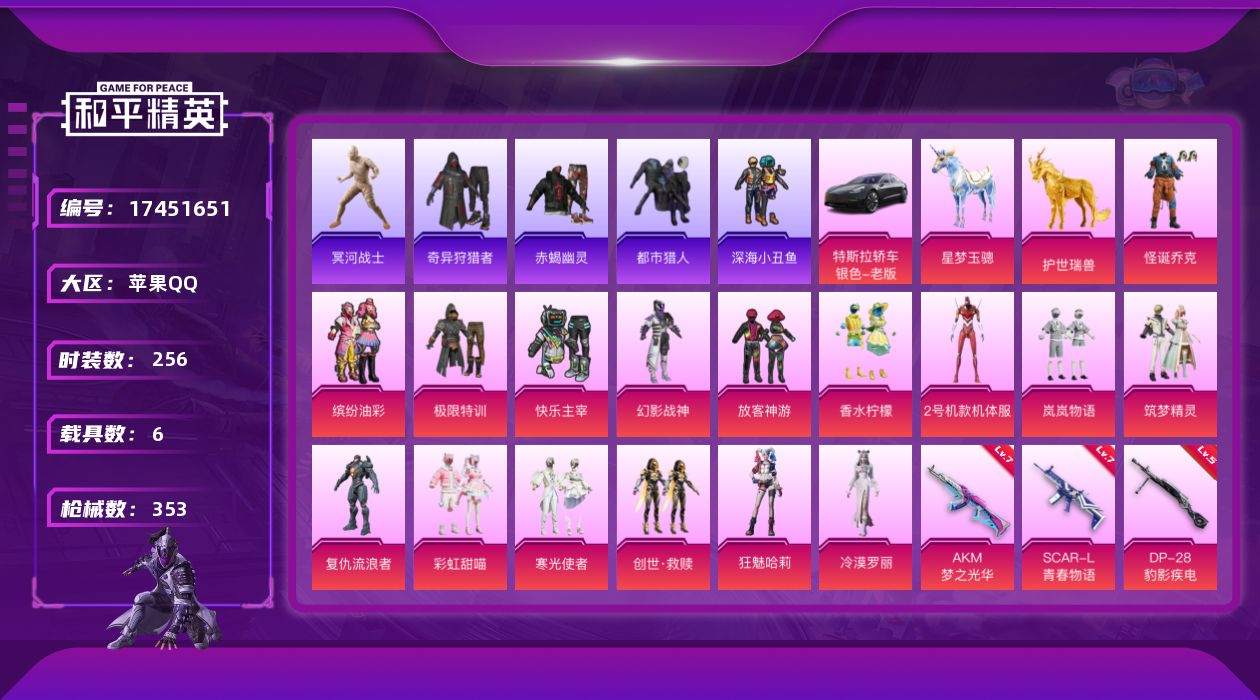[17451651]苹果 手Q-无敌战神框-19粉装-20特效枪-6载具-14粉色飞行器-129901热力值-27王牌印记-256套装-353枪皮 【热门品类】:粉装-怪诞乔克,粉装-缤纷油彩,套装-浪漫天命,套装-赤蝎幽灵,套装-都市猎人,套装-冥河战士,套装-深海小丑鱼,套装-小丑鱼,套装-奇异狩猎者,角色-军刀雅典娜,套装-龟仙人,套装-暗影哥特,套装-粉红小猪,角色-Mark.06,套装-红熊茄茄 【粉色套装】:粉装-极限特训,粉装-快乐主宰,粉装-幻影战神,粉装-怪诞乔克,粉装-缤纷油彩,粉装-放客神游,粉装-香水柠檬,角色-2号机款机体服,粉装-岚岚物语,粉装-筑梦精灵,角色-复仇流浪者,粉装-彩虹甜喵,粉装-寒光使者,套装-创世·救赎,角色-狂魅哈莉,角色-冷漠罗丽,角色-辉云木星,人物-小舞·雪昙,人物-小舞·恋语 【粉色枪皮等级】:AKM-梦之光华(七级),AKM-暮色玫影(三级),SCAR-L-青春物语(七级),SCAR-L-金蛇镇世(三级),M416-五爪金龙(一级),M416-天马神君(六级),AUG-罪夜之冕(五级),M762-激战未来(五级),UMP45-量子极限(五级),Vector-环太平洋(五级),AKS-74U-森灵之息(五级),Kar98K-巳巳如意(五级),Mk14-甜梦熊击(五级),Mk14-福马献瑞(五级),M249-彩虹甜喵(五级),DP-28-豹影疾电(五级),PKM-萌骑夺宝(二级),MG-36-沧焰双生(五级),燃烧瓶-薄荷可可(六级) 【粉色载具】:法拉利LaFerrari(赛车红),特斯拉Model 3(冷光银),星梦玉骢,护世瑞兽,暮色幽蹄,九霄玄鹿 【粉色枪皮】:AKM-梦之光华,AKM-暮色玫影,SCAR-L-青春物语,SCAR-L-金蛇镇世,M416-五爪金龙,M416-天马神君,AUG-罪夜之冕,M762-激战未来,UMP45-量子极限,Vector-环太平洋,AKS-74U-森灵之息,Kar98K-巳巳如意,Mk14-甜梦熊击,Mk14-福马献瑞,M249-彩虹甜喵,DP-28-豹影疾电,PKM-萌骑夺宝,MG-36-沧焰双生,烟雾弹-猫咪绅士,燃烧瓶-薄荷可可 【粉色飞行器】:香车宝马飞行器,炫彩糖果飞行器,深渊漩涡飞行器,幽焰列车飞行器,凤舞九天飞行器,终晖之翼飞行器,灵猫魔法师飞行器,灵珠游龙飞行器,暮色之舞飞