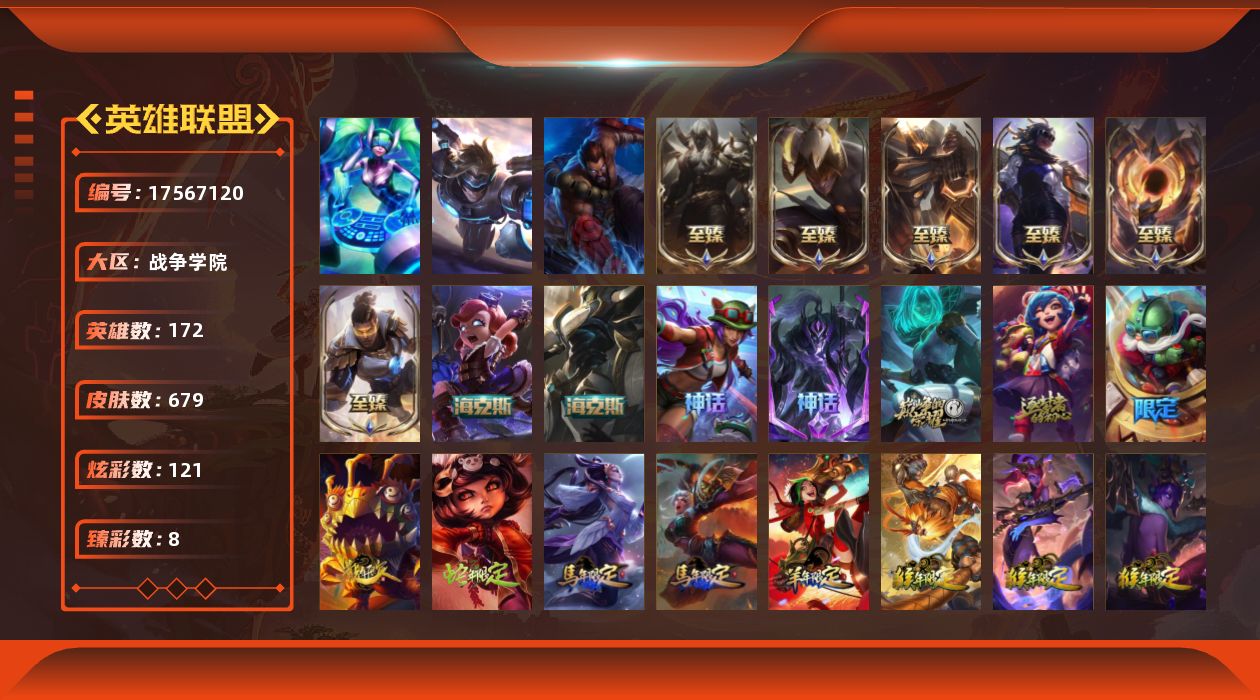 [17567120]未定级段位-172英雄-679皮肤-121炫彩-3终极-12神话-122限定-58传说-174史诗