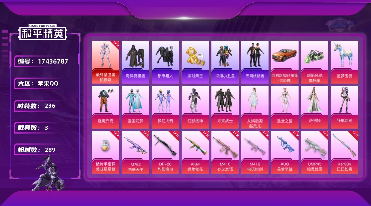[17436787]苹果 手Q-1神装-9粉装-15特效枪-3载具-6粉色飞行器-99355热力值-13王牌印记-236套装-289枪皮