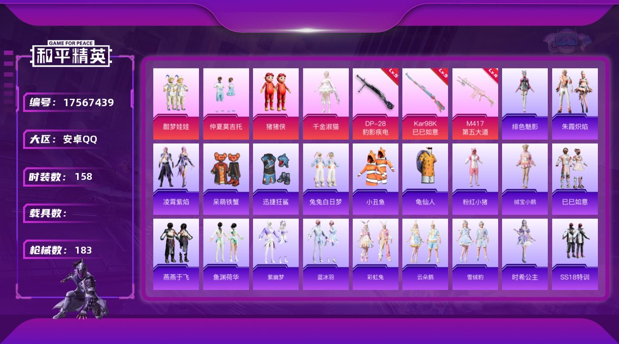 [17567439]安卓 手Q-4粉装-4特效枪-0载具-3粉色飞行器-53288热力值-5王牌印记-158套装-183枪皮 【热门品类】:套装-小丑鱼,套装-龟仙人,套装-粉红小猪 【粉色套装】:粉装-酣梦娃娃,粉装-仲夏莫吉托,玩偶服-猪猪侠,角色-千金淑猫 【粉色枪皮等级】:Kar98K-巳巳如意(五级),M417-第五大道(四级),DP-28-豹影疾电(五级) 【粉色枪皮】:Kar98K-巳巳如意,Mk14-福马献瑞,M417-第五大道,DP-28-豹影疾电 【粉色飞行器】:炫彩糖果飞行器,星夜魔法师飞行翼,冰川粉黛飞行器 【粉色降落伞】:花间之火降落伞,垂柳戏鸭降落伞,暗夜鎏金降落伞,畅跳缤纷降落伞,飒粉甜心降落伞,炫光之旅降落伞,圣堂之誓降落伞,临安公主降落伞,星穹咏叹调降落伞,幻彩电音降落伞,时光之吻降落伞,炫彩糖果降落伞 【稀有套装】:套装-龟仙人,套装-绒宝小鹅,套装-巳巳如意,套装-雪国风尚,套装-炫彩糖果,套装-燕燕于飞,套装-鱼渊荷华,套装-紫幽梦,套装-蓝冰羽,套装-彩虹兔,套装-云朵鹅,套装-雪绒豹,角色-时希公主,套装-朱霞炽焰,套装-凌霄紫焰,角色-绯色魅影 【稀有枪皮】:AKM-彩虹符号,AKM-春暖花开,AKM-灼热熔岩,AKM-破晓战魂,AKM-缤纷海域,AKM-龙的传人,M16A4-幻世战舞者,M16A4-红色方程式,M16A4-蓝色火焰,SCAR-L-炫彩节奏,SCAR-L-玉兔迎春,SCAR-L-粉锦千层,SCAR-L-红色方程式,SCAR-L-小狗蛇点点,M416-糯团青竹,M416-红色方程式,M416-蓝色火焰,GROZA-懵萌河马,GROZA-田园牧歌,AUG-天降萌叽,AUG-甜蜜菠萝,AUG-耀粉歌者,QBZ-彩虹符号,M762-天降萌叽,M762-暗夜鎏金,M762-甜心宝贝,M762-第五大道,M762-云朵鹅,Mk47-妙红点点,Mk47-炫光之旅,G36C-懵萌河马,AC-VAL-天降萌叽,AC-VAL-快闪甜心,蜜獾-天降萌叽,蜜獾-娇憨猪猪,ARX-凌霄紫焰,UZI-啾咪啾咪,UZI-娇憨猪猪,UZI-红色方程式,UMP45-炫光之旅,UMP45-生命誓言,UMP45-蓝色火焰,Vector-田园牧歌,Vector-音爆索尼克,汤姆逊-天降萌叽,汤姆逊-耀粉歌者,野牛-粉锦千层,JS9-凌霄紫焰,P90-快闪甜心,P
