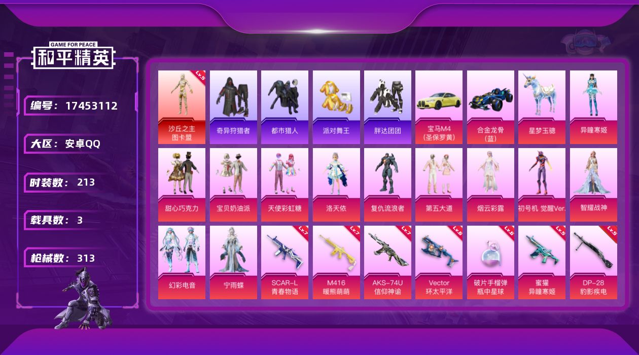 [17453112]安卓 手Q-1神装-13粉装-17特效枪-3载具-7粉色飞行器-112702热力值-17王牌印记-213套装-313枪皮