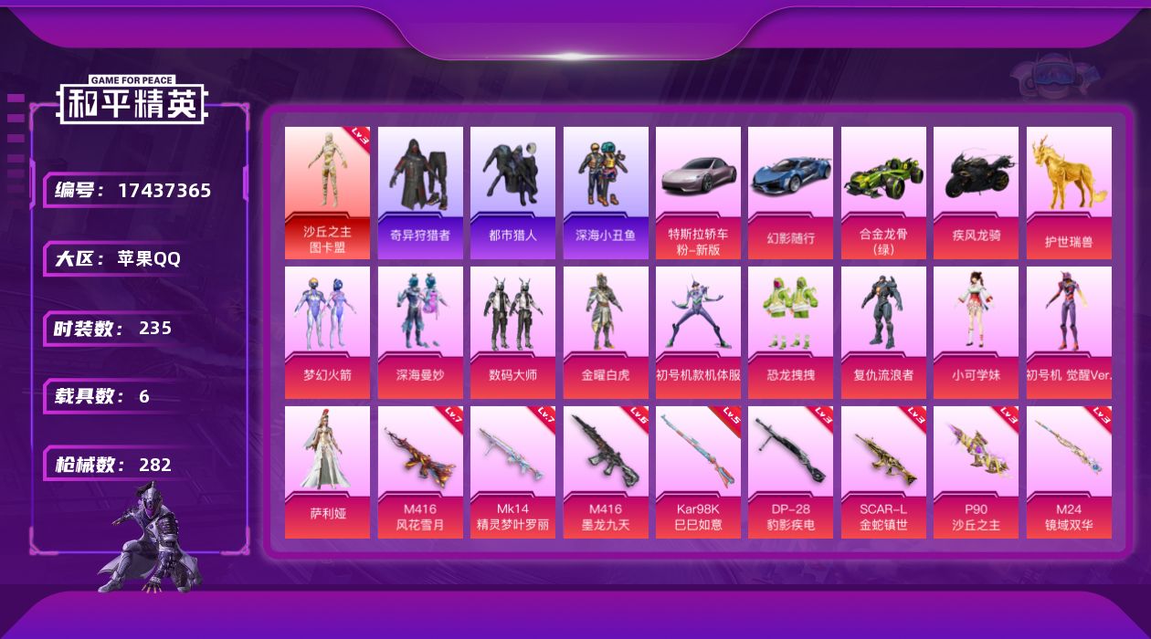 [17437365]苹果 手Q-无敌战神框-1神装-10粉装-11特效枪-6载具-6粉色飞行器-100713热力值-17王牌印记-235套装-282枪皮