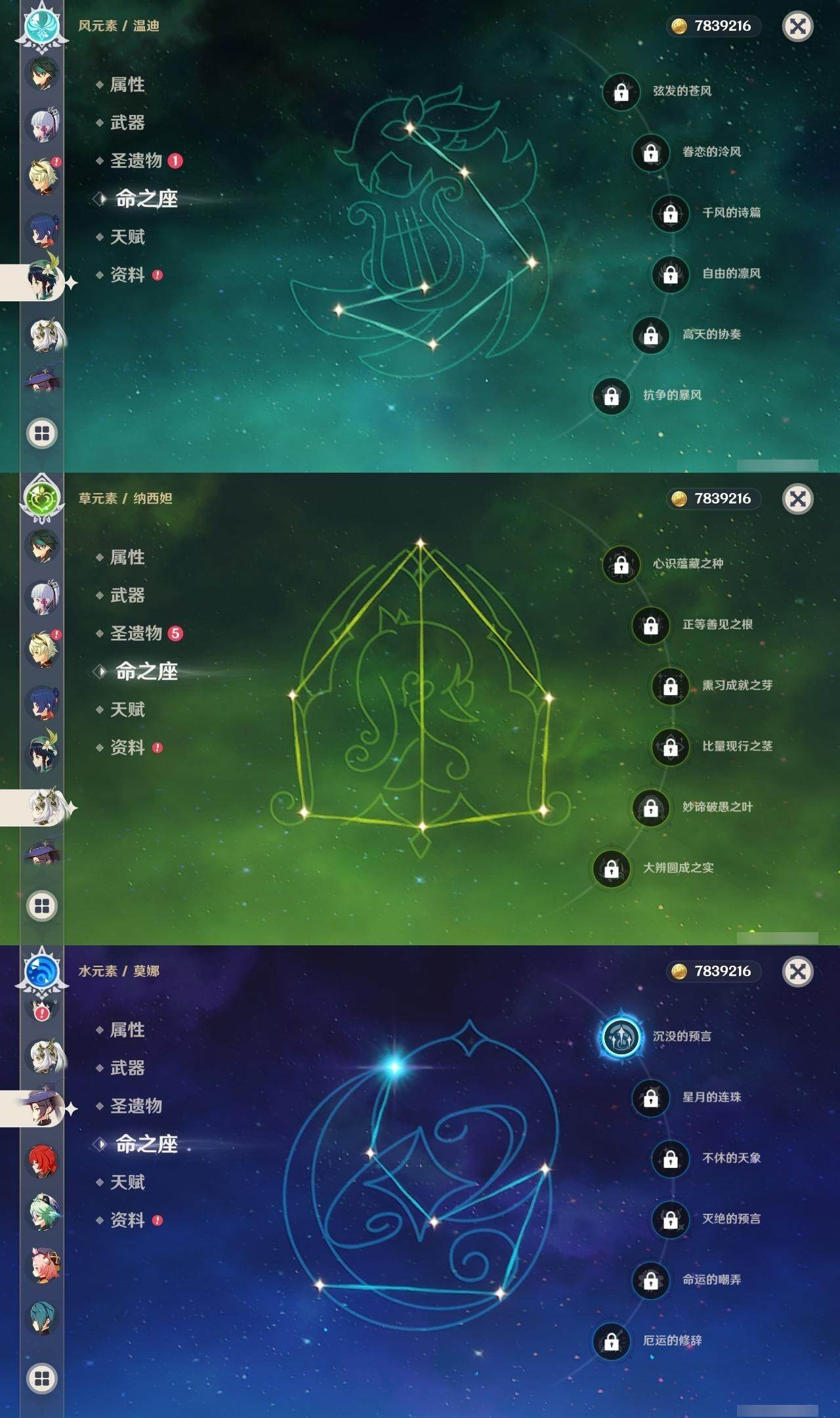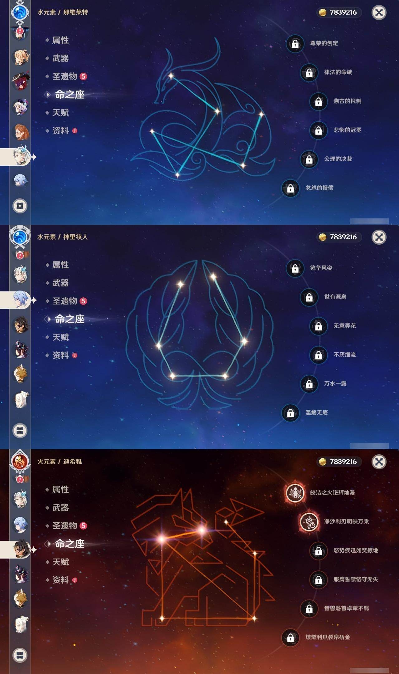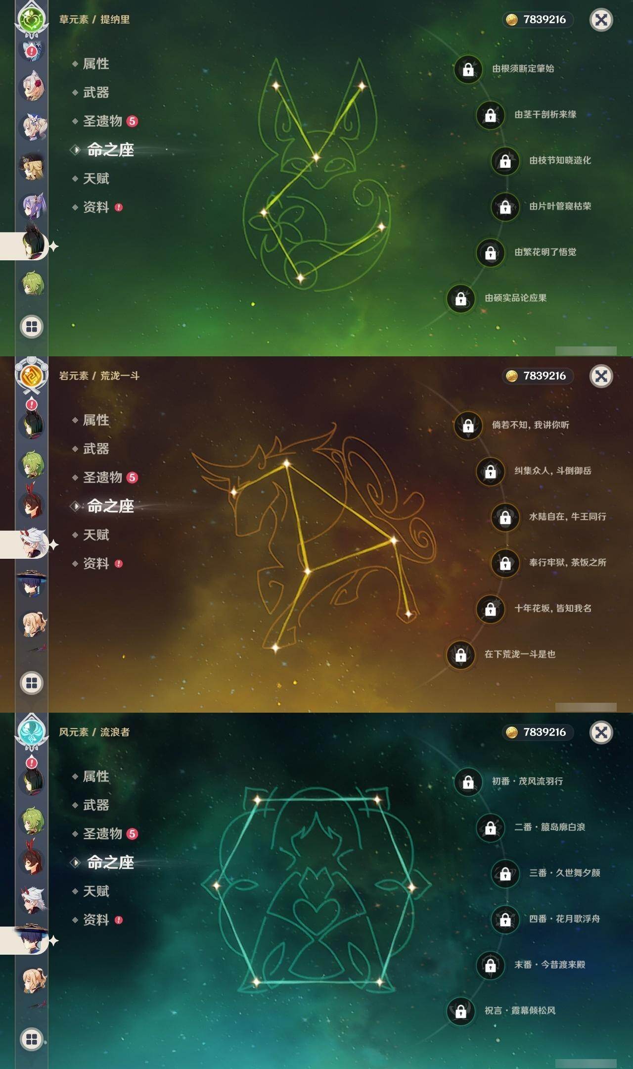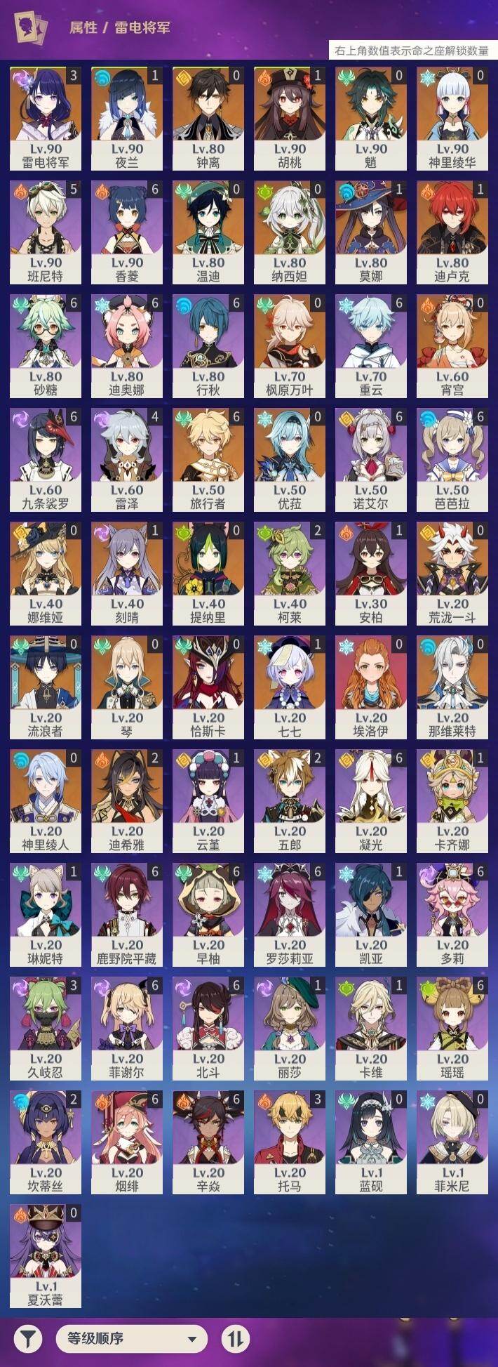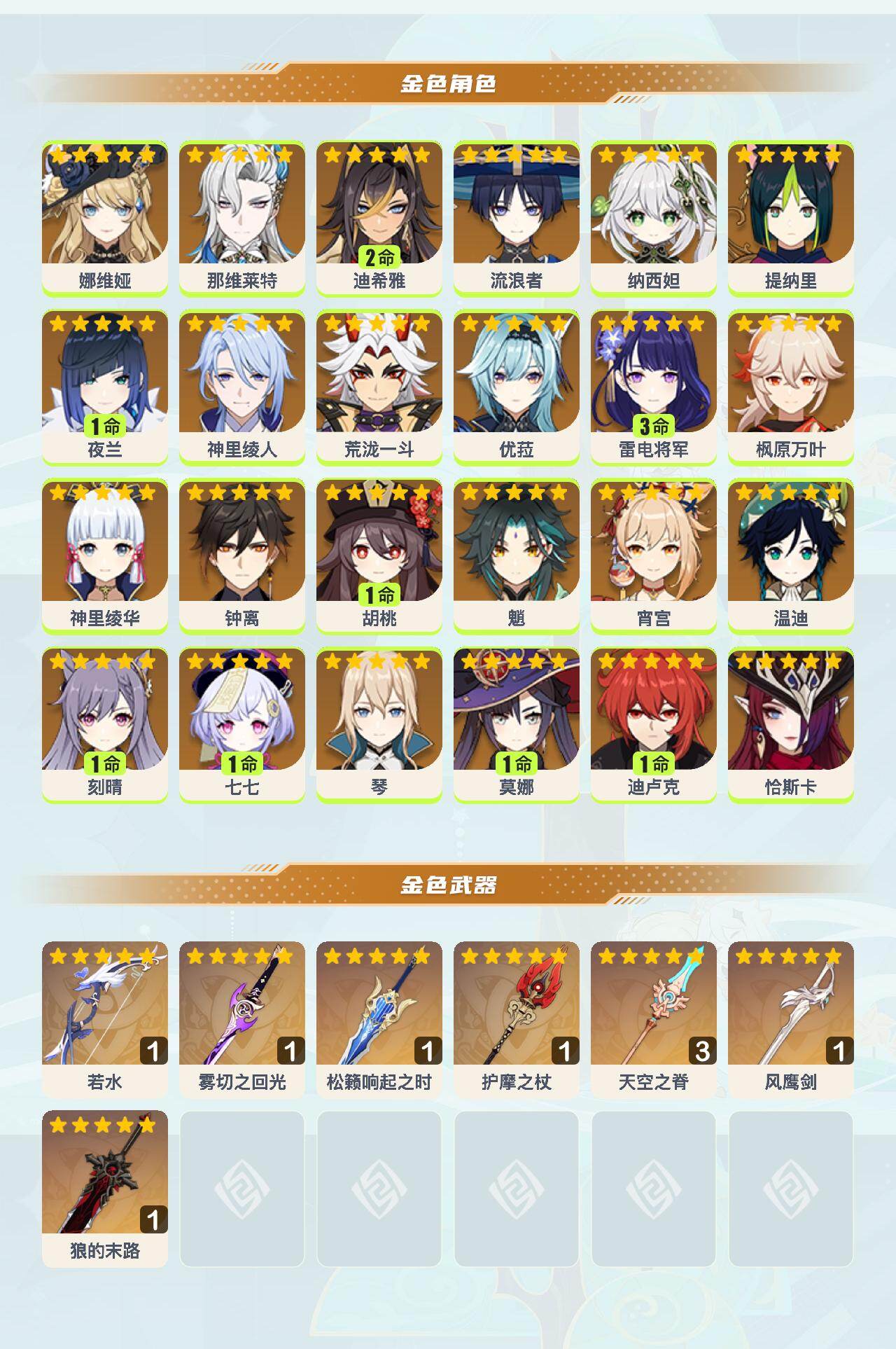 0命娜维娅,0命那维莱特,2命迪希雅,0命流浪者,0命纳西妲,0命提纳里,1命夜兰,0命神里绫人,0命荒泷一斗,0命优菈,3命雷电将军,0命枫原万叶,0命神里绫华,0命钟离,1命胡桃,0命魈,0命宵宫,0命温迪,1命刻晴,1命七七,0命琴,1命莫娜,1命迪卢克,0命恰斯卡,精1若水,精1雾切之回光,精1松籁响起之时,精1护摩之杖,精3天空之脊,精1风鹰剑,精1狼的末路
