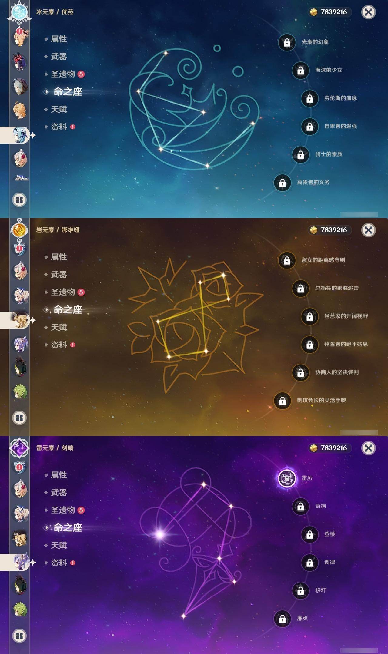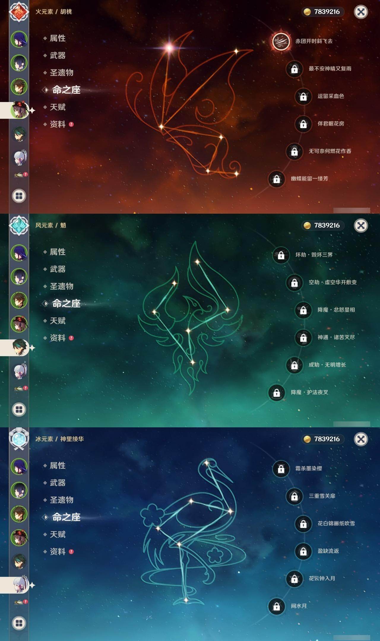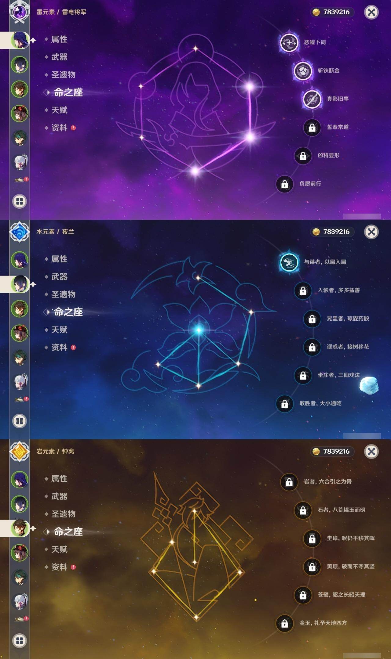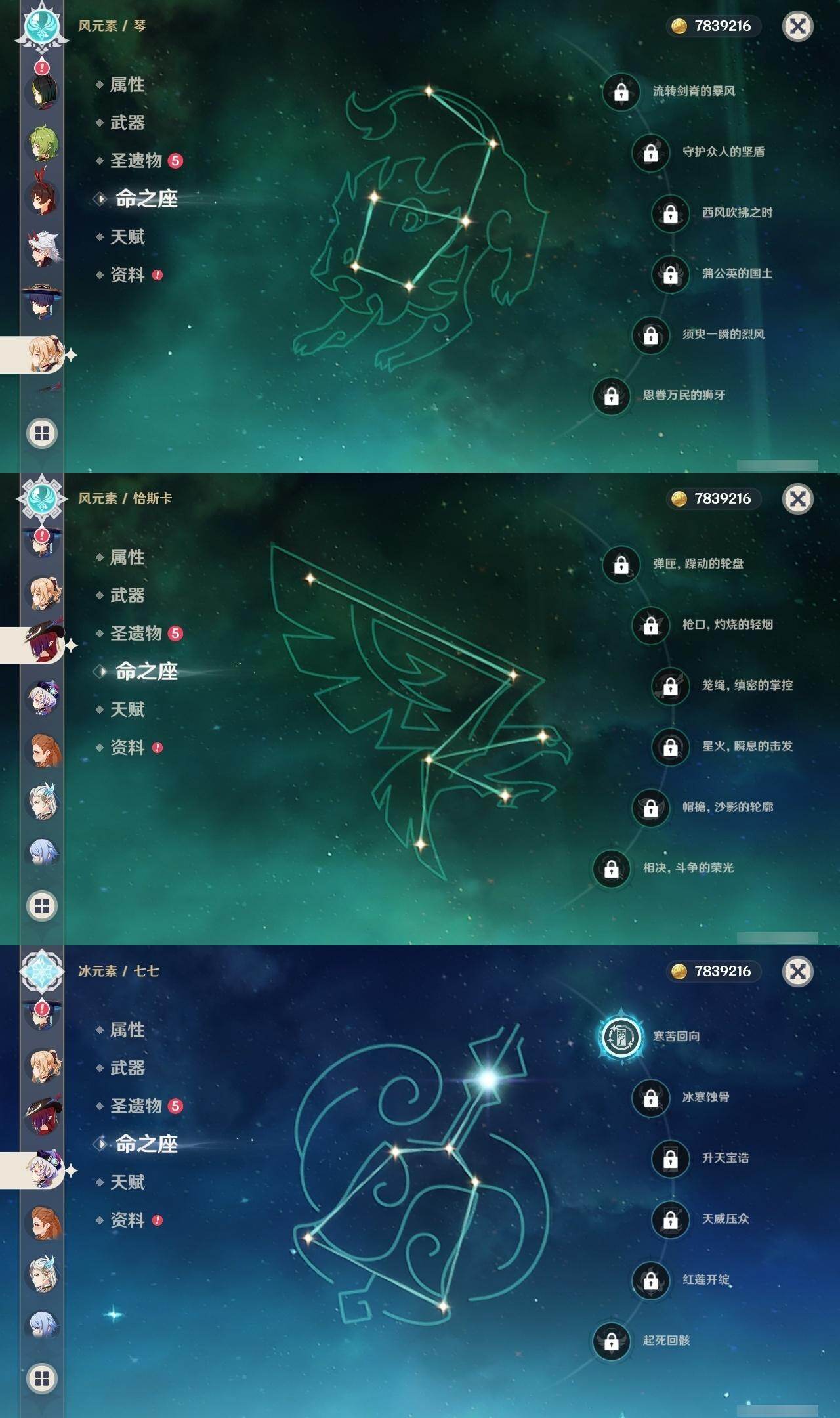 0命娜维娅,0命那维莱特,2命迪希雅,0命流浪者,0命纳西妲,0命提纳里,1命夜兰,0命神里绫人,0命荒泷一斗,0命优菈,3命雷电将军,0命枫原万叶,0命神里绫华,0命钟离,1命胡桃,0命魈,0命宵宫,0命温迪,1命刻晴,1命七七,0命琴,1命莫娜,1命迪卢克,0命恰斯卡,精1若水,精1雾切之回光,精1松籁响起之时,精1护摩之杖,精3天空之脊,精1风鹰剑,精1狼的末路