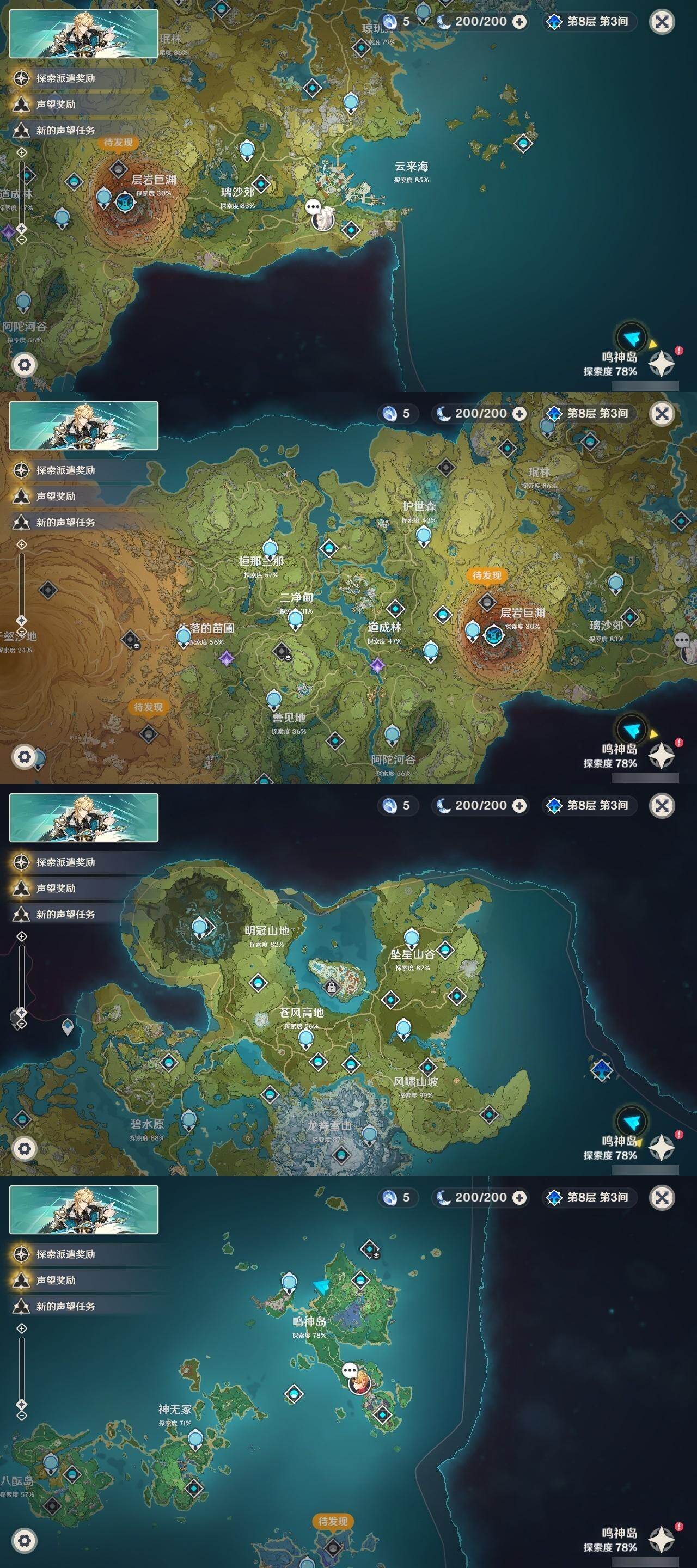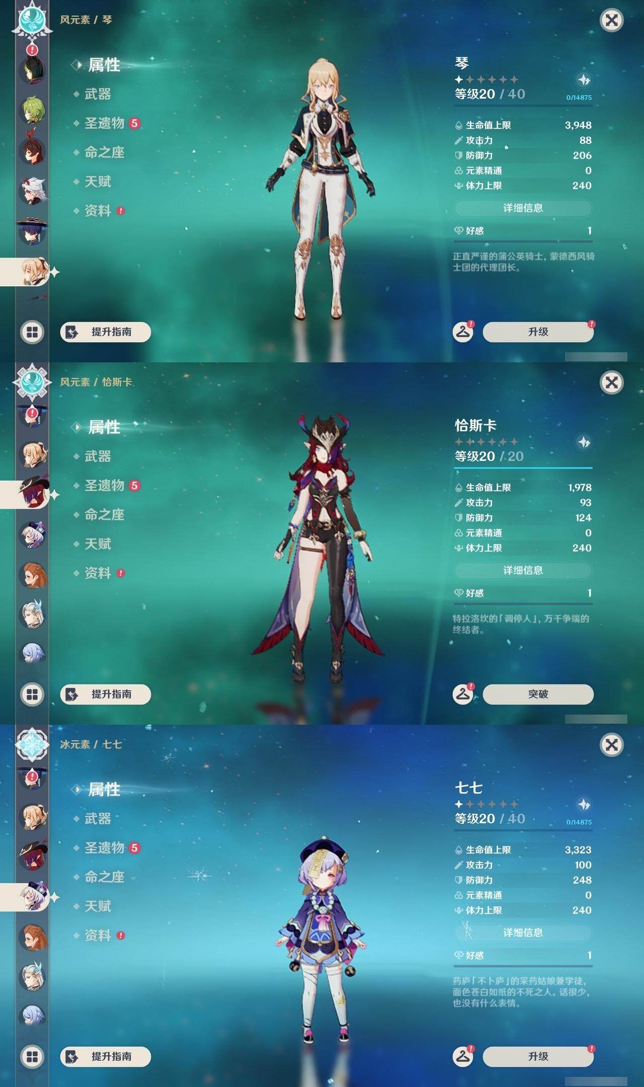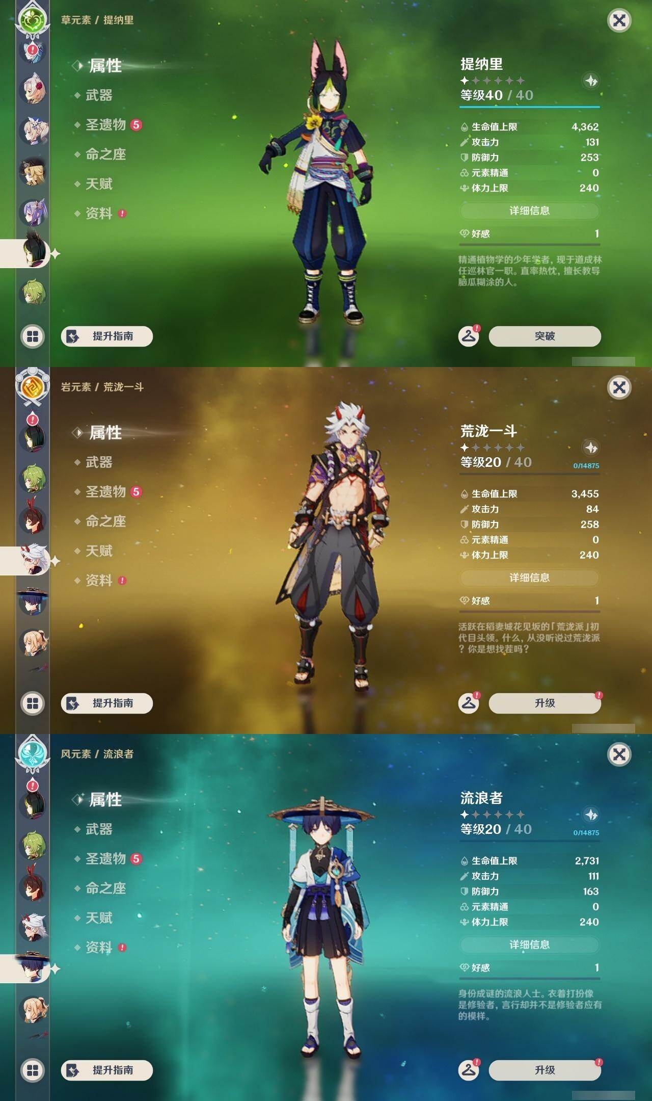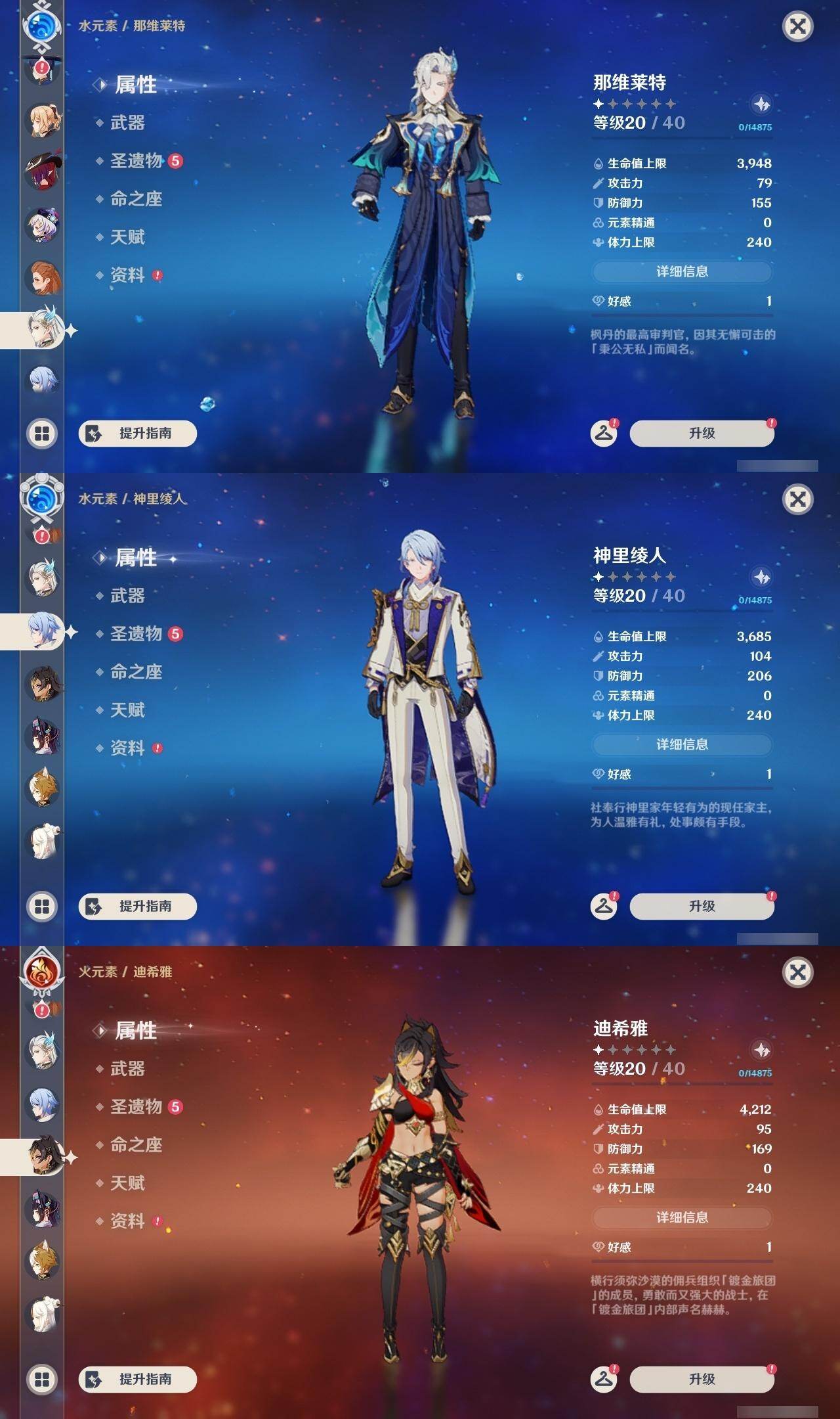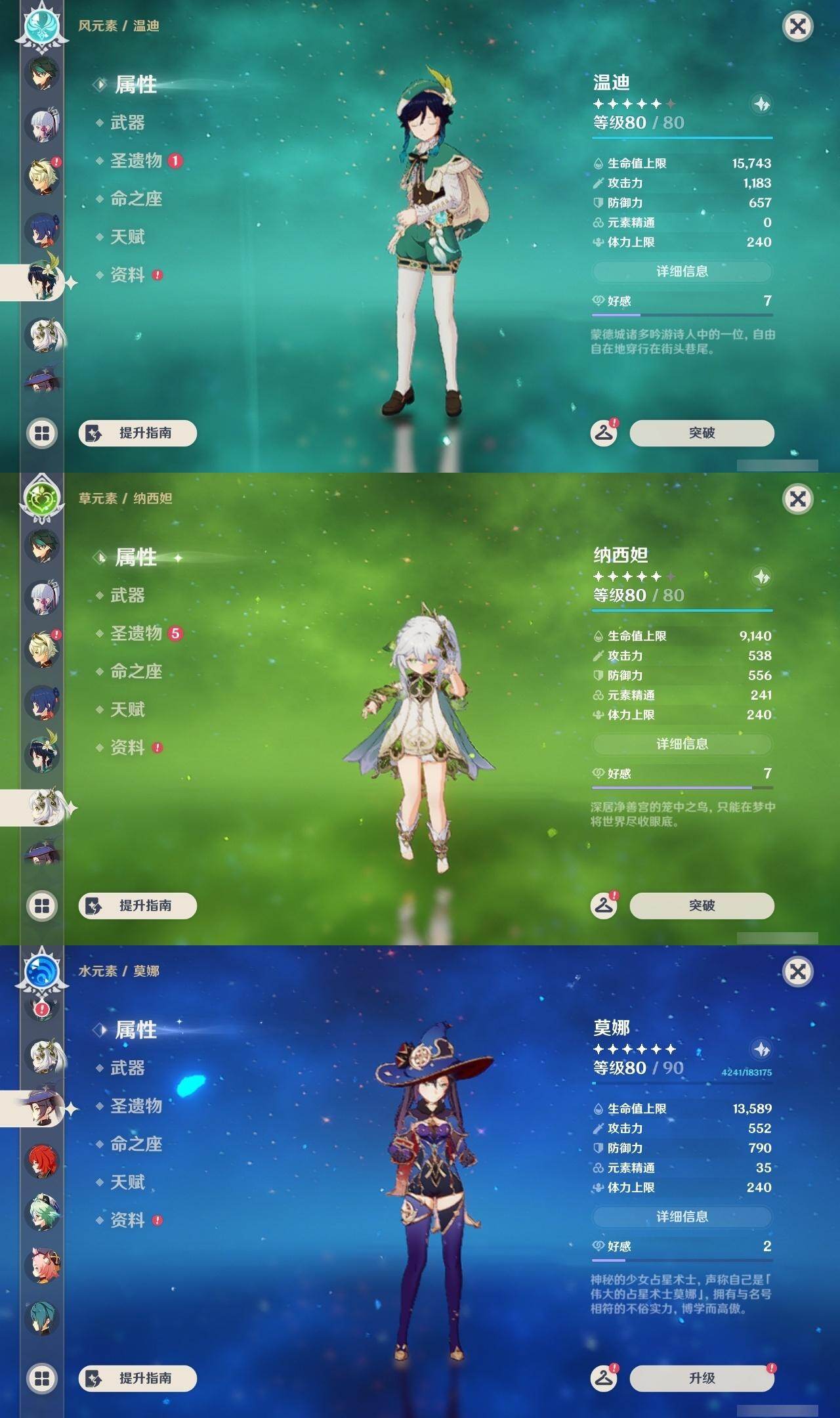 0命娜维娅,0命那维莱特,2命迪希雅,0命流浪者,0命纳西妲,0命提纳里,1命夜兰,0命神里绫人,0命荒泷一斗,0命优菈,3命雷电将军,0命枫原万叶,0命神里绫华,0命钟离,1命胡桃,0命魈,0命宵宫,0命温迪,1命刻晴,1命七七,0命琴,1命莫娜,1命迪卢克,0命恰斯卡,精1若水,精1雾切之回光,精1松籁响起之时,精1护摩之杖,精3天空之脊,精1风鹰剑,精1狼的末路