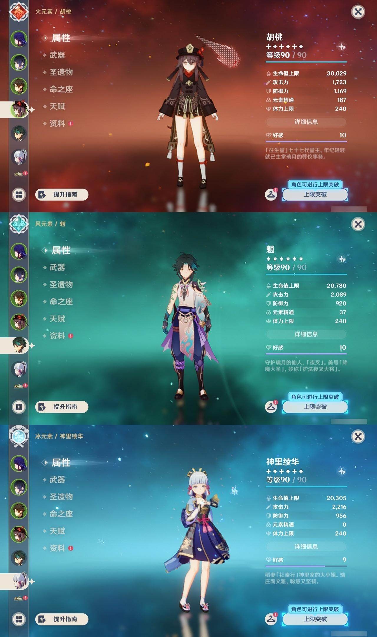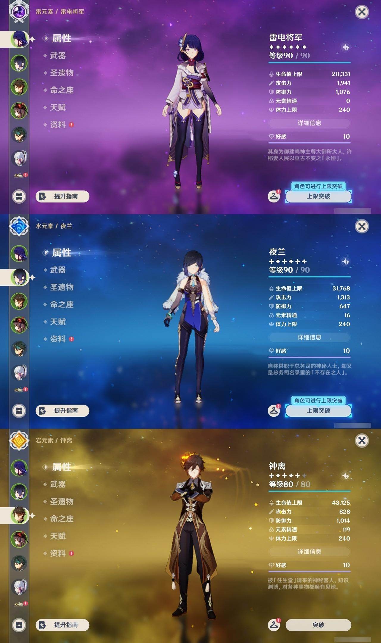 雷电将军,钟离,胡桃,魈,神里凌华,温迪,莫娜,迪卢克,枫原万叶,宵宫,优菈,刻晴,荒泷一斗,琴,七七