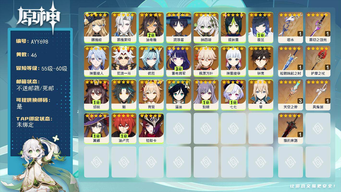 [17568959]56级/46黄/男主/24个五星角色/9个五星武器 0命娜维娅,0命那维莱特,2命迪希雅,0命流浪者,0命纳西妲,0命提纳里,1命夜兰,0命神里绫人,0命荒泷一斗,0命优菈,3命雷电将军,0命枫原万叶,0命神里绫华,0命钟离,1命胡桃,0命魈,0命宵宫,0命温迪,1命刻晴,1命七七,0命琴,1命莫娜,1命迪卢克,0命恰斯卡,精1若水,精1雾切之回光,精1松籁响起之时,精1护摩之杖,精3天空之脊,精1风鹰剑,精1狼的末路