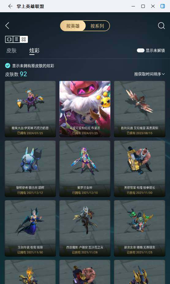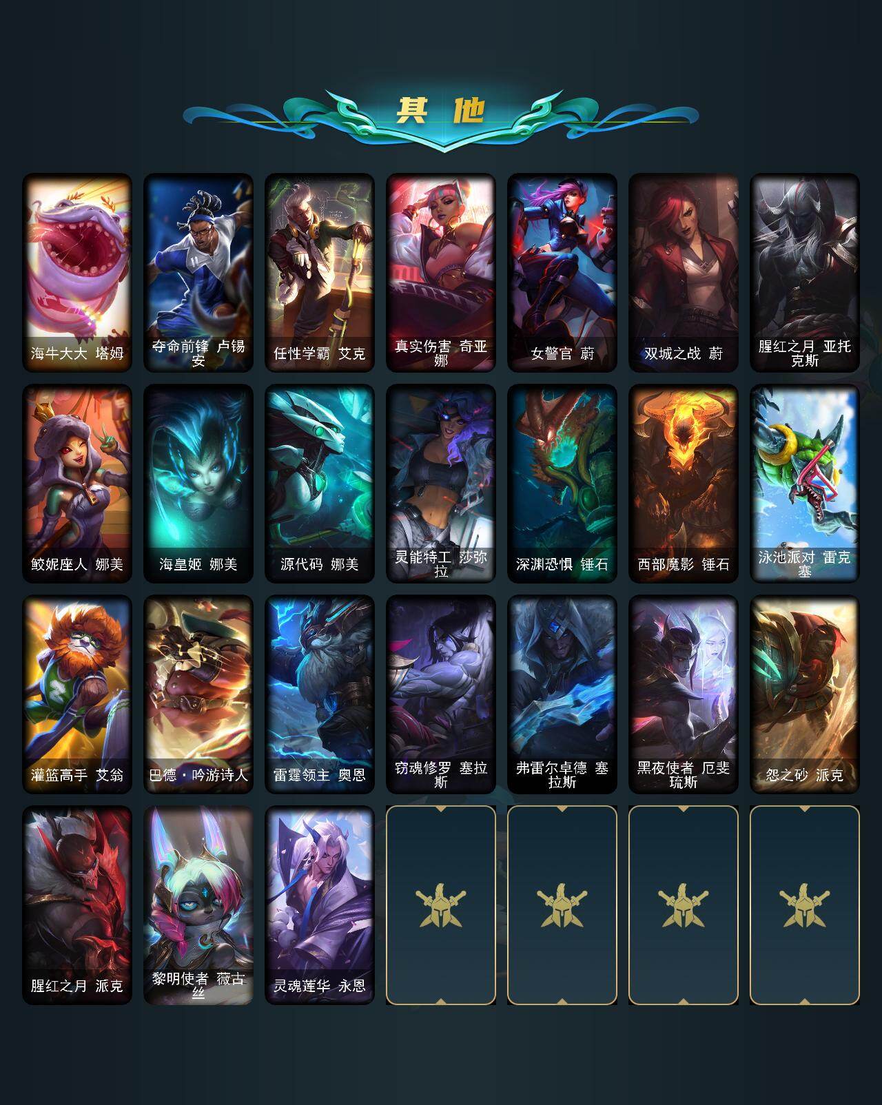 【冰雪限定】:幸福女神乐芙兰,冰雪风暴希维尔,圣诞开心鬼提莫,圣诞精灵崔丝塔娜,圣诞狂欢努努和威朗普,圣诞糖果棒厄运小姐,圣诞狂欢基兰,阿木木“主人不要我了”,胡桃夹子萨科,平安夜女神娑娜,邪恶圣诞老人维迦,喜庆之树茂凯,冬季仙境奥莉安娜,雪默丁格,雪装奈德丽,圣诞玩偶波比,圣诞老人古拉加斯,圣诞驯鹿克格莫,魄罗骑士瑟庄妮,雪球也能爆炸吉格斯,冰雪节辛吉德
