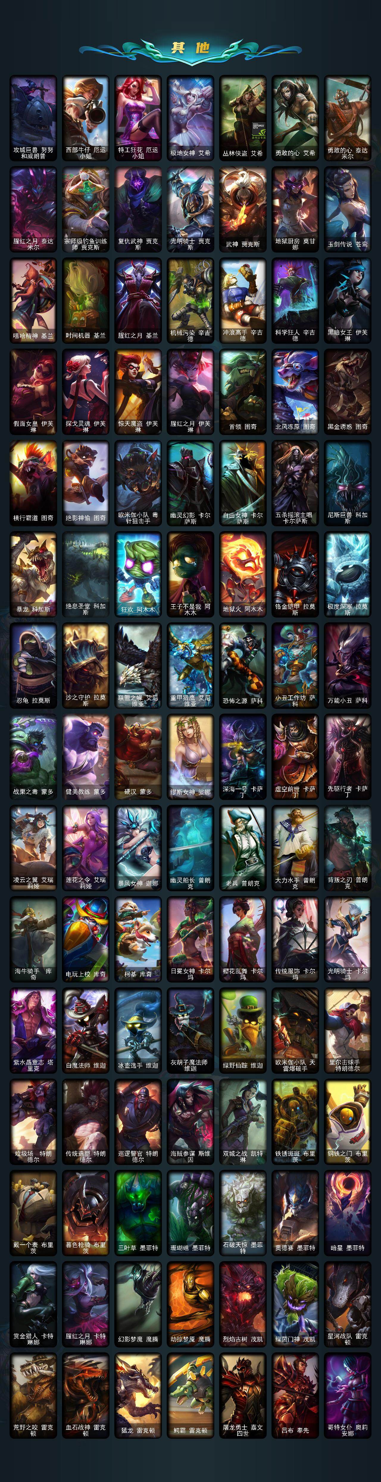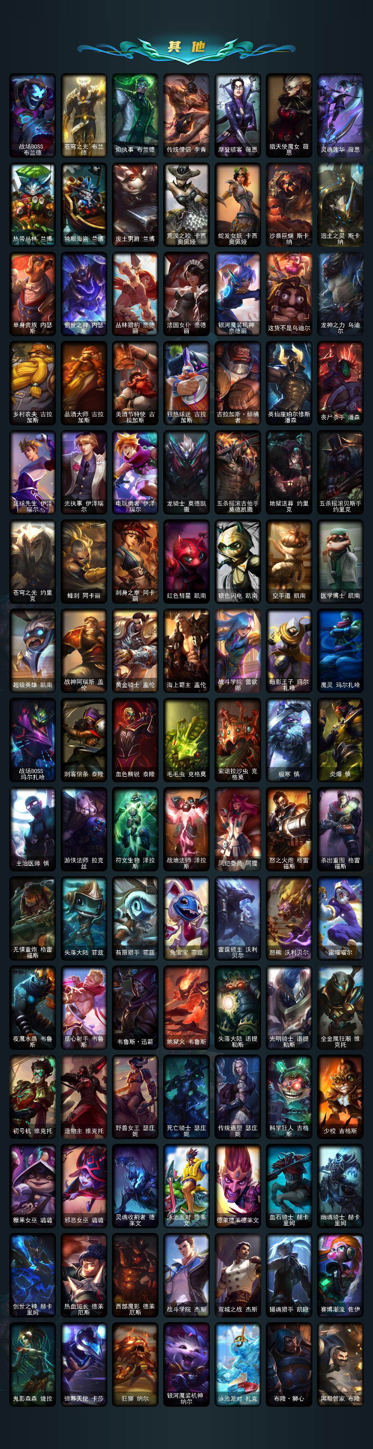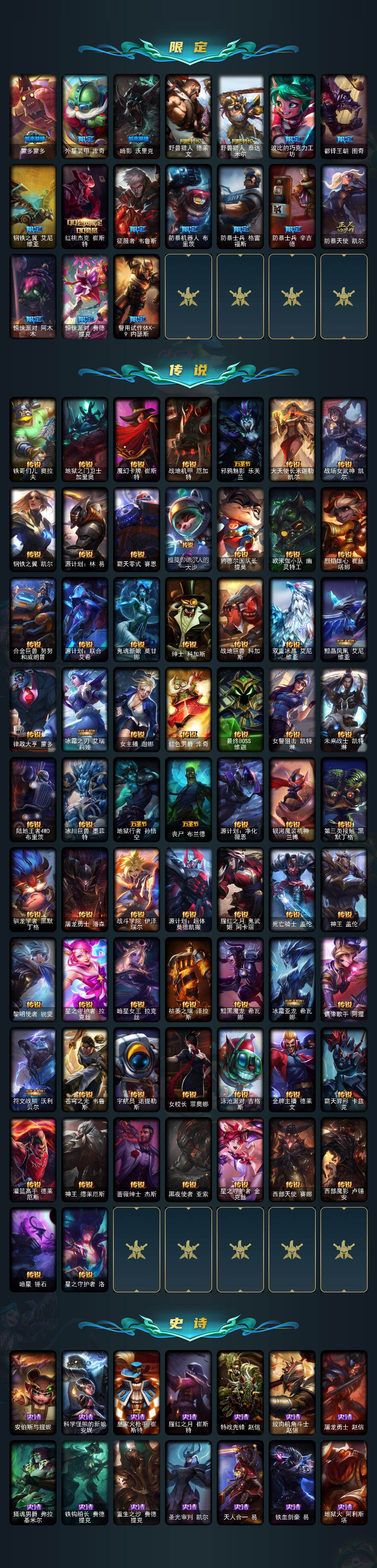 【限定皮肤】:卧虎藏龙贾克斯,舞会公主安妮,诺斯费拉图弗拉基米尔,地底世界崔斯特,冠军典狱长锤石,冠军之血希瓦娜,Fnatic古拉加斯,Fnatic迦娜,Fnatic嘉文四世,暗杀星蒙多,暗杀星努努和威朗普,SKTT1劫,SKTT1婕拉,SKTT1李青,SSW辛吉德,SSW图奇,SSW雷恩加尔,SKTT1阿兹尔,SKTT1卡莉丝塔,SKTT1艾克,FPX普朗克,电玩女神厄运小姐,电玩女神阿狸,胜利女神奥莉安娜,胜利凤凰艾尼维亚,南瓜头费德提克,鬼影重重魔腾,鬼影森森茂凯,无头骑士赫卡里姆,克烈古拉伯爵,魅惑女巫崔丝塔娜,泳池派对雷克顿,泳池派对蕾欧娜,泳池派对李青,蓝色忧郁崔斯特,蒙多蒙多,外星装甲库奇,暗影沃里克,野兽猎人德莱文,野兽猎人泰达米尔,波比的巧克力工坊,都铎王朝图奇,钢铁之翼艾尼维亚,红桃杰克崔斯特,征服者韦鲁斯,防暴机器人布里茨,防暴士兵格雷福斯,防暴士兵辛吉德,防暴天使凯尔,惊悚派对阿木木,惊悚派对费德提克,警用试作体K9内瑟斯